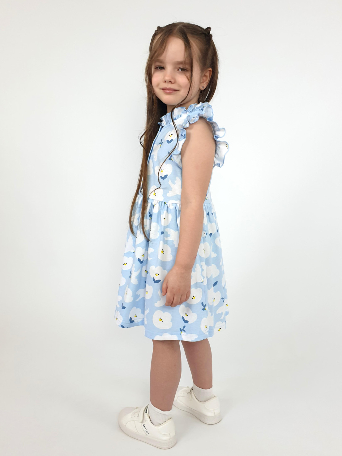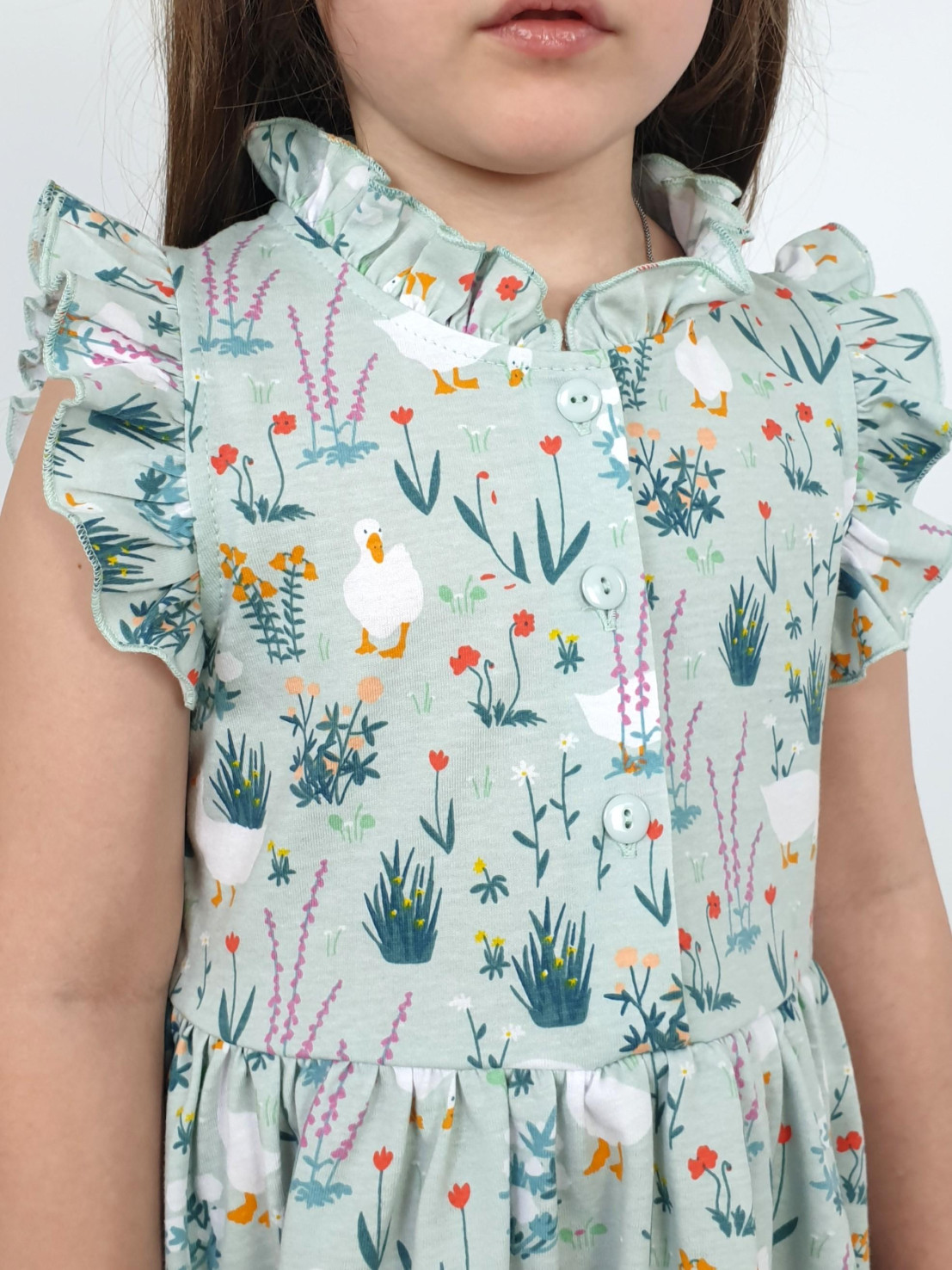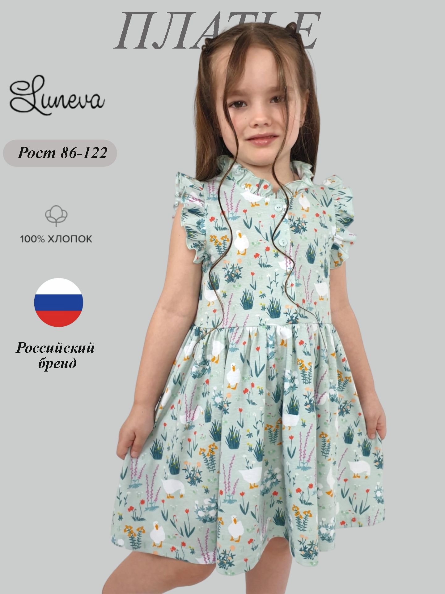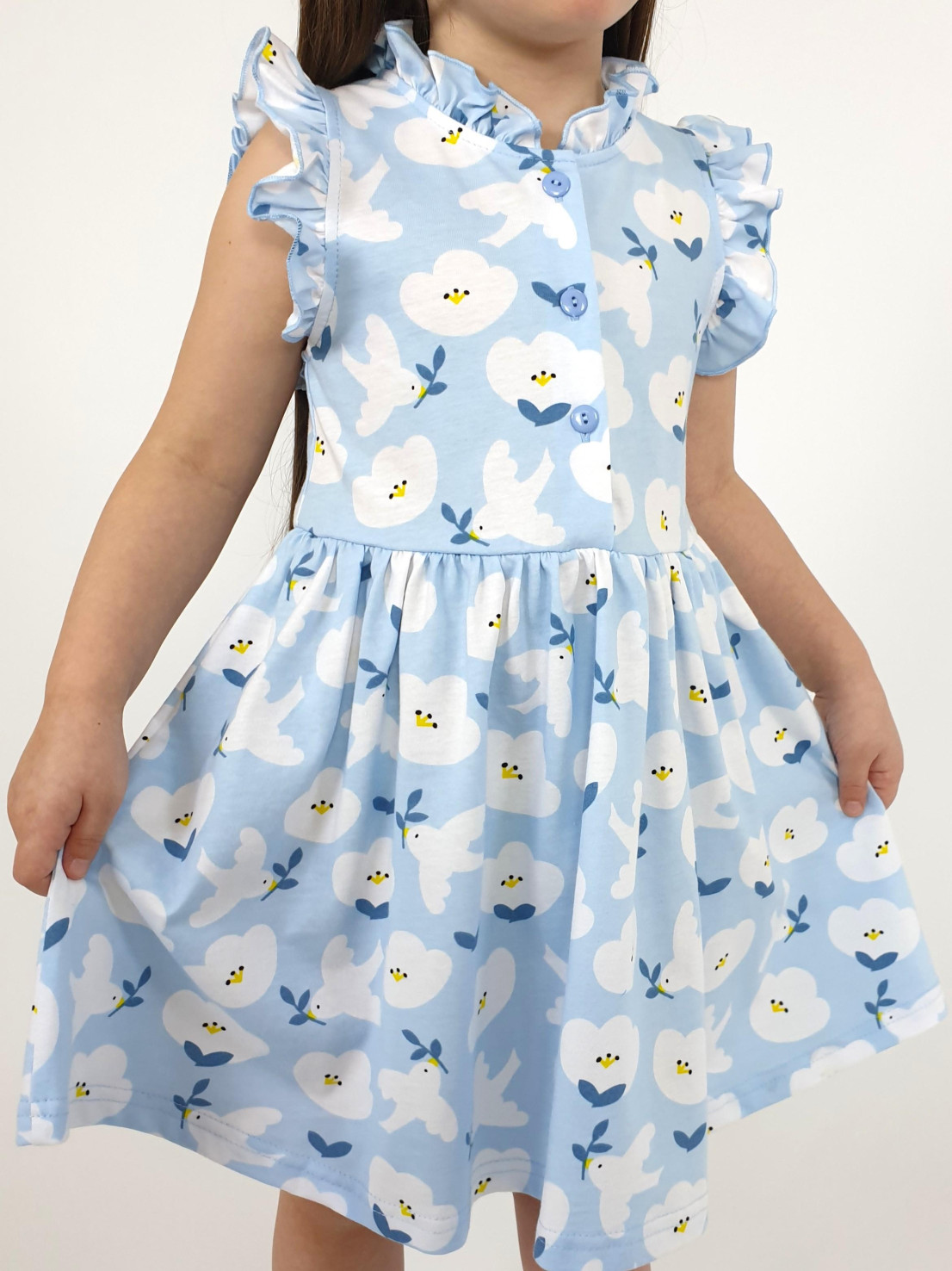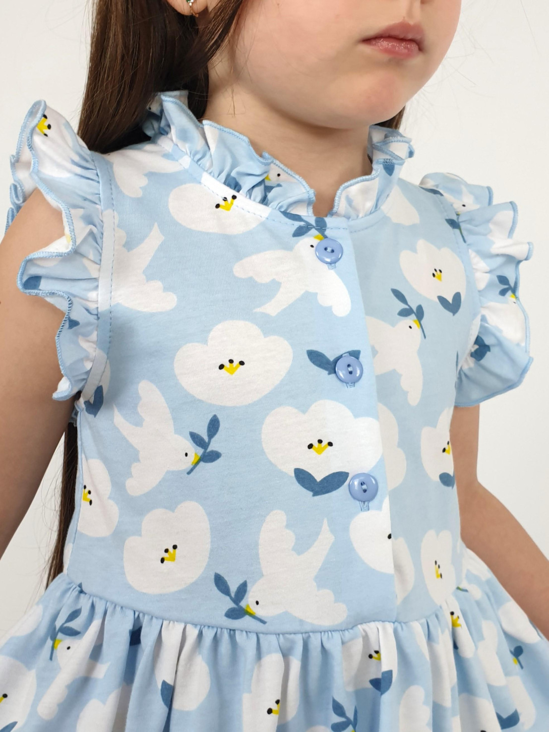Кулирное полотно(набивка):100% х/б. Платье-полуприлегающего силуэта,без рукава,рюша в горловине и пройме.Отрезная юбка со сборкой.Горловина окантована и подшита,застежка центральная на пуговицы.