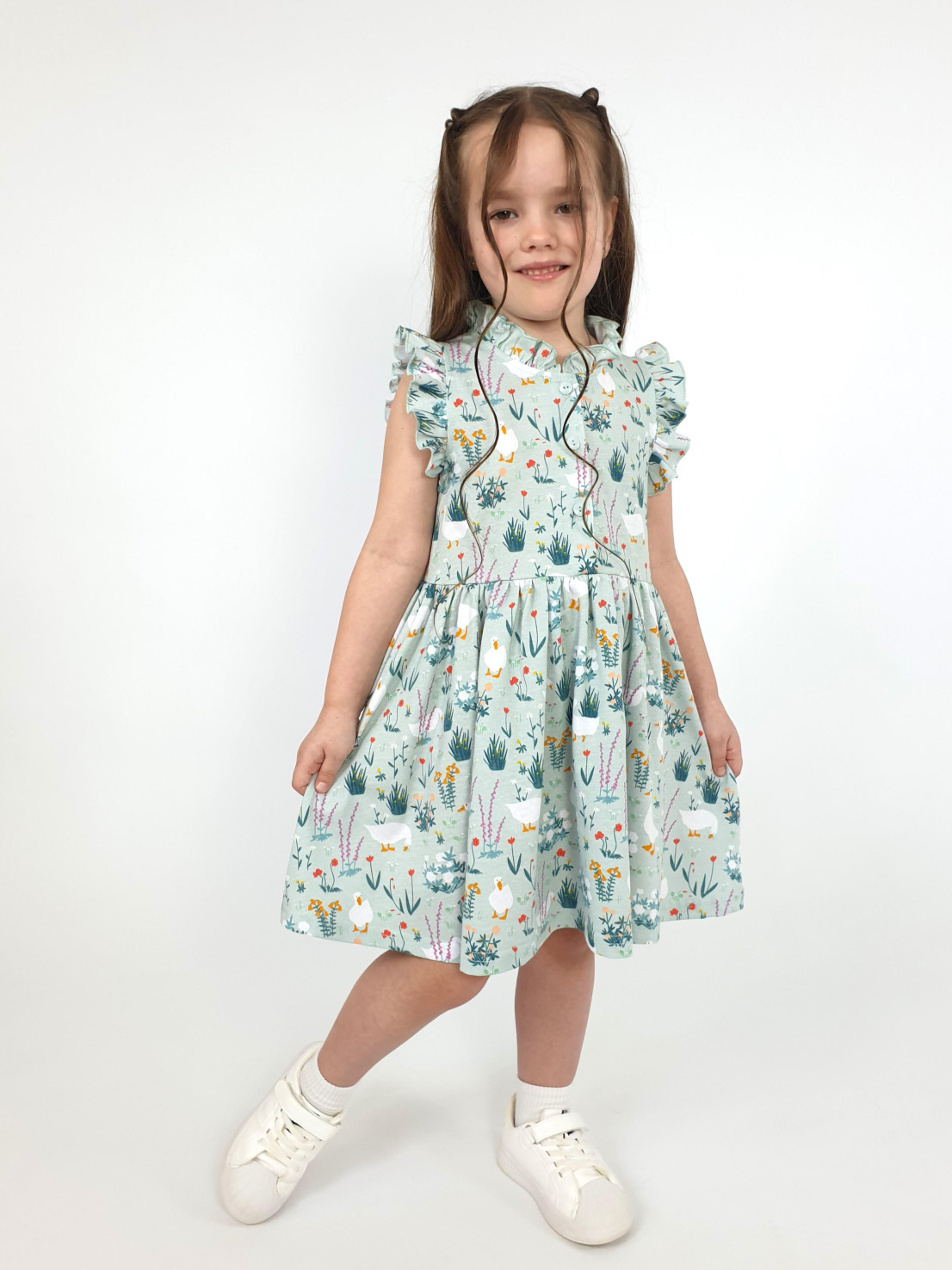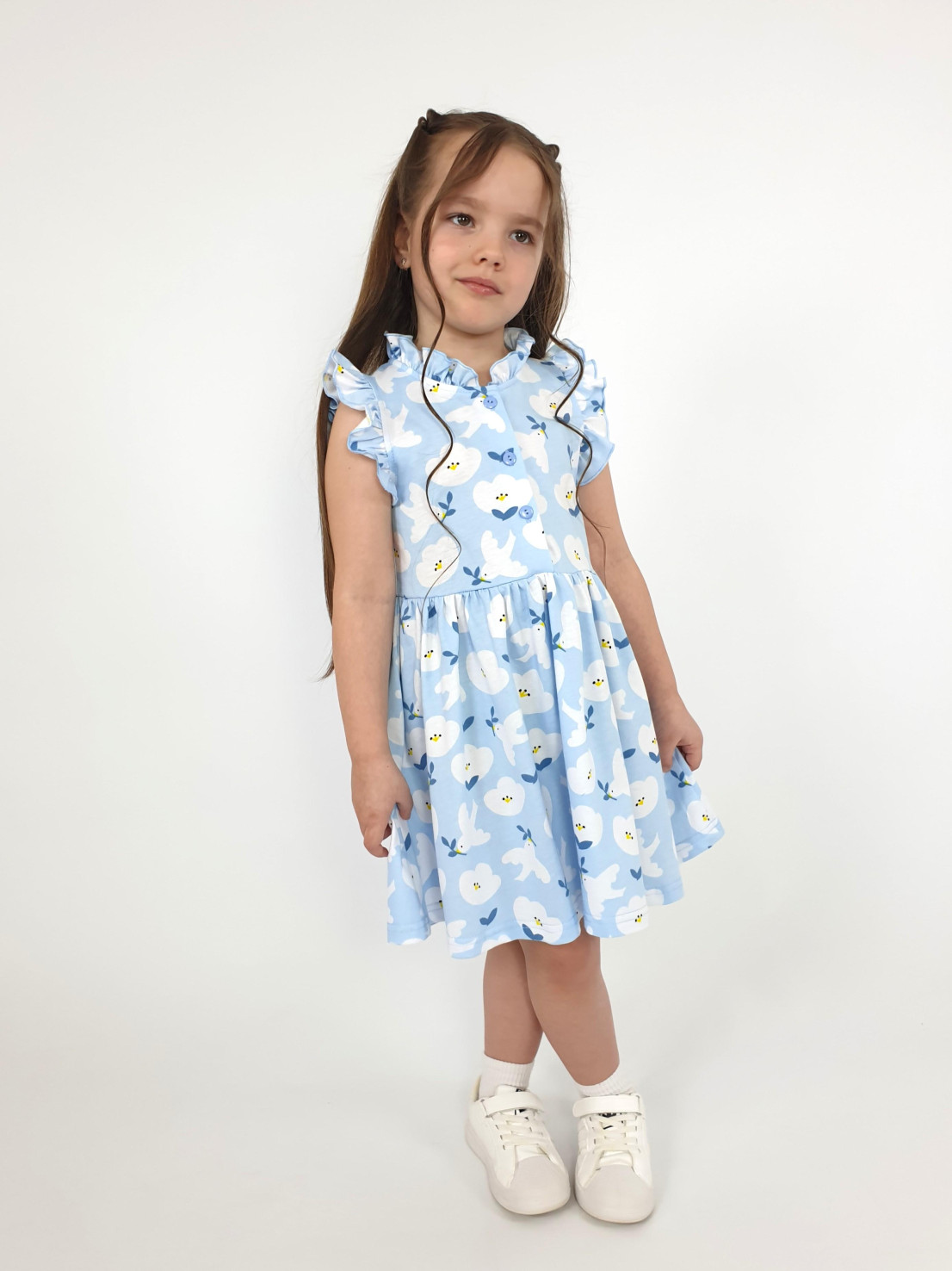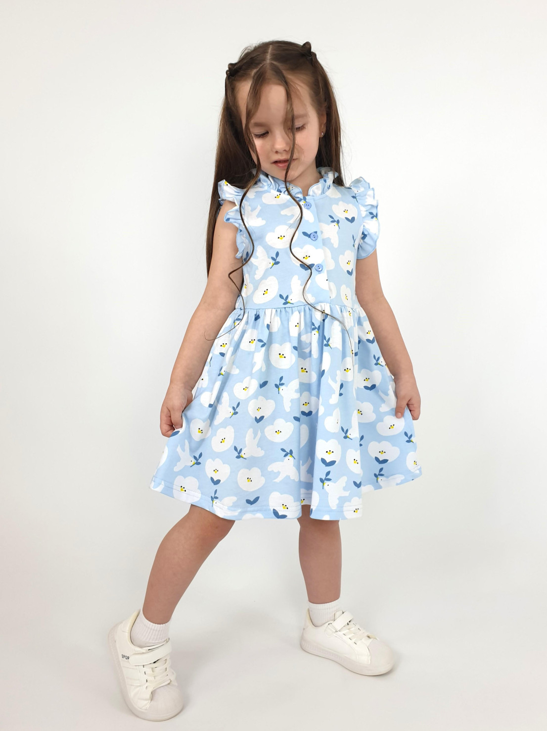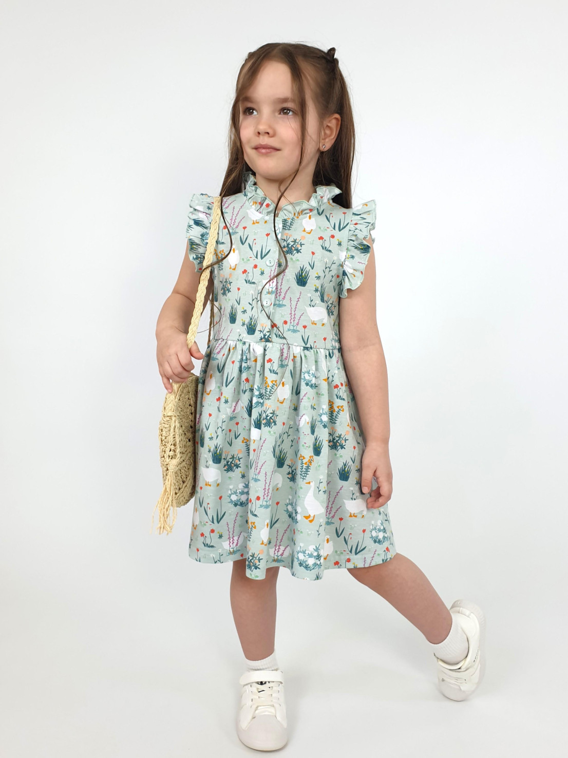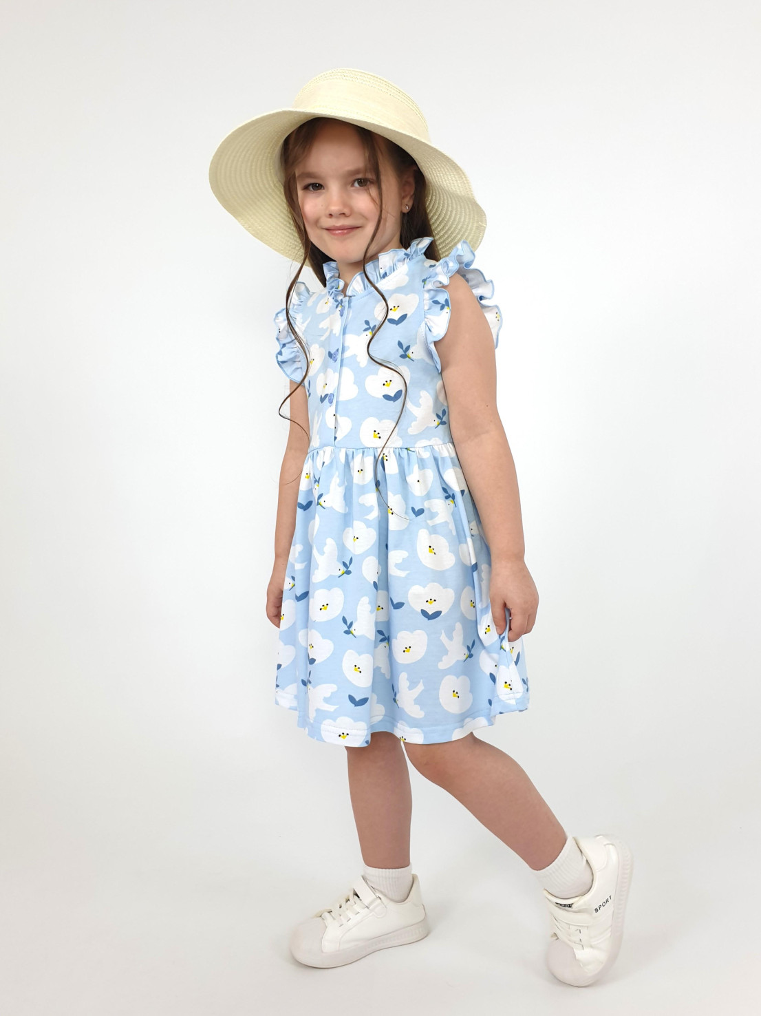 Кулирное полотно(набивка):100% х/б. Платье-полуприлегающего силуэта,без рукава,рюша в горловине и пройме.Отрезная юбка со сборкой.Горловина окантована и подшита,застежка центральная на пуговицы.