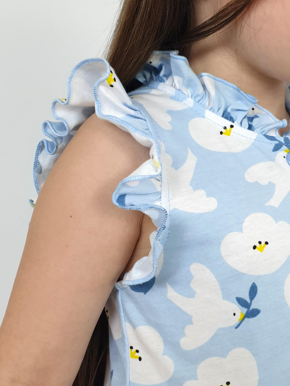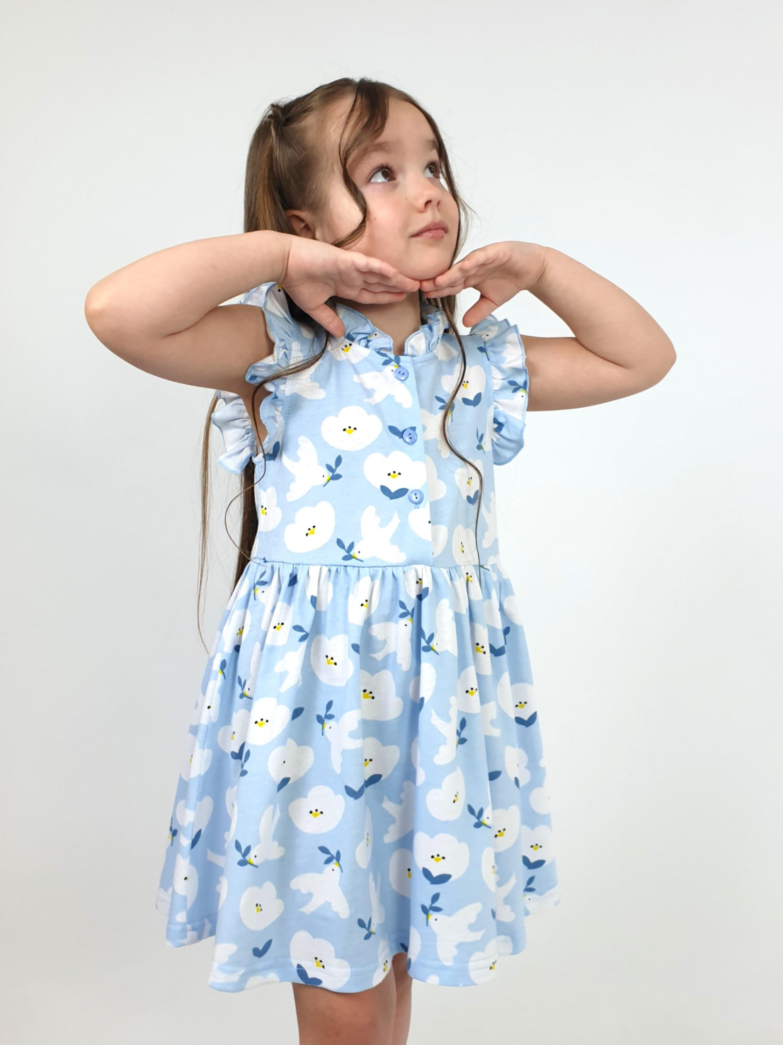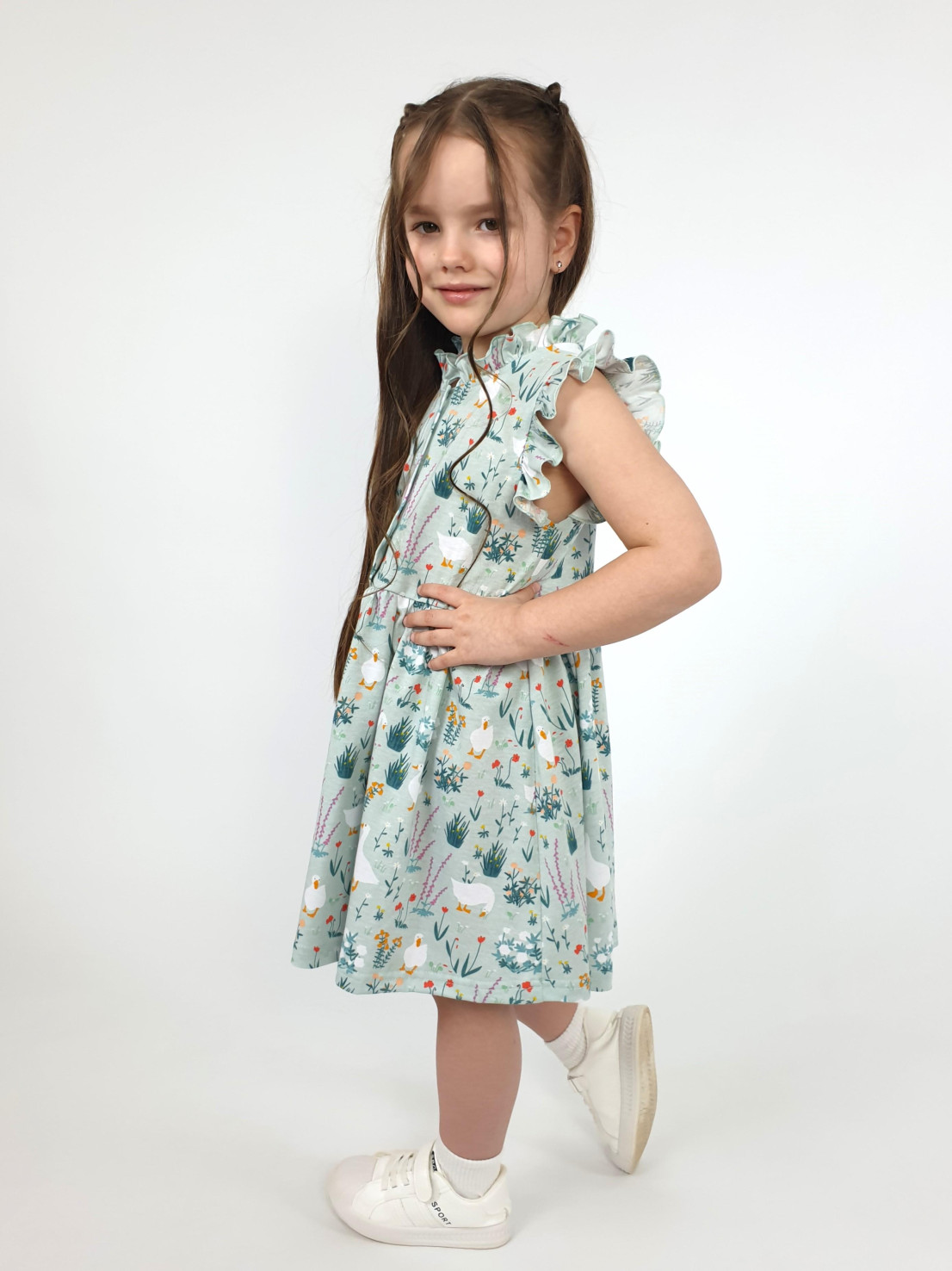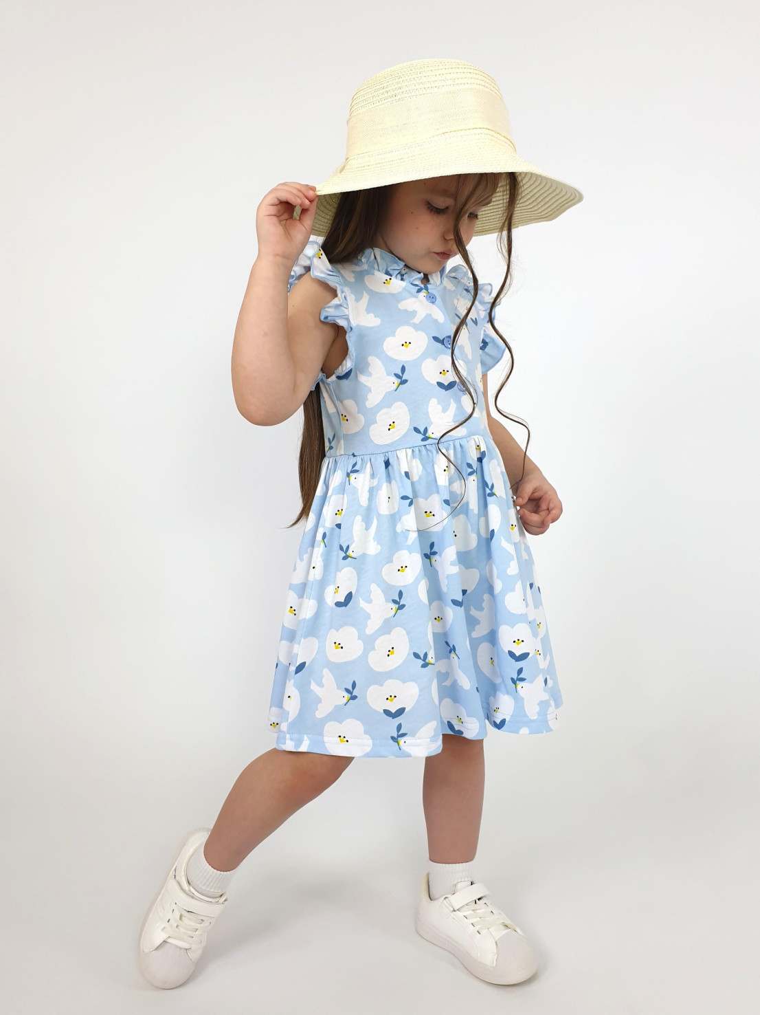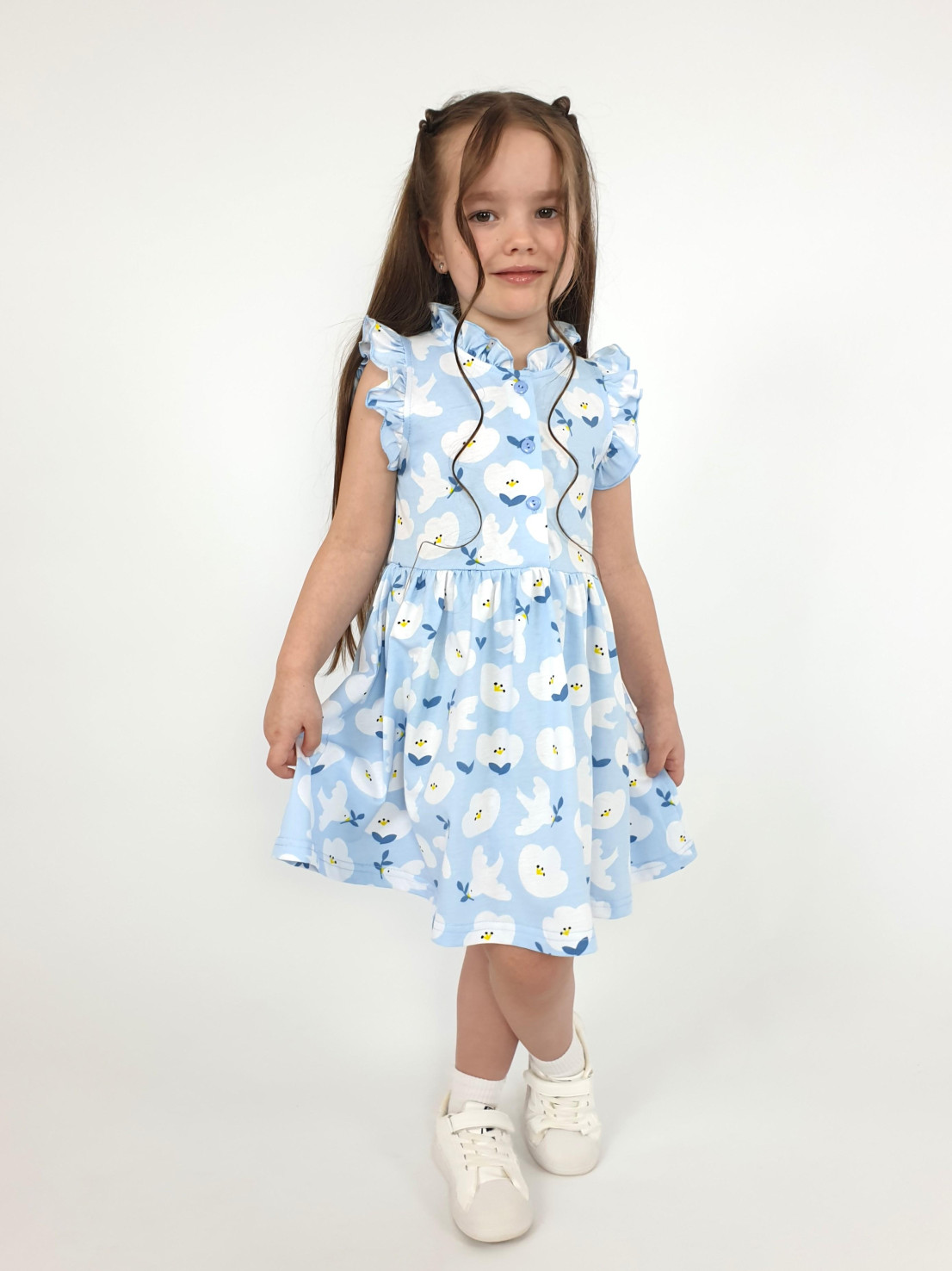 Кулирное полотно(набивка):100% х/б. Платье-полуприлегающего силуэта,без рукава,рюша в горловине и пройме.Отрезная юбка со сборкой.Горловина окантована и подшита,застежка центральная на пуговицы.