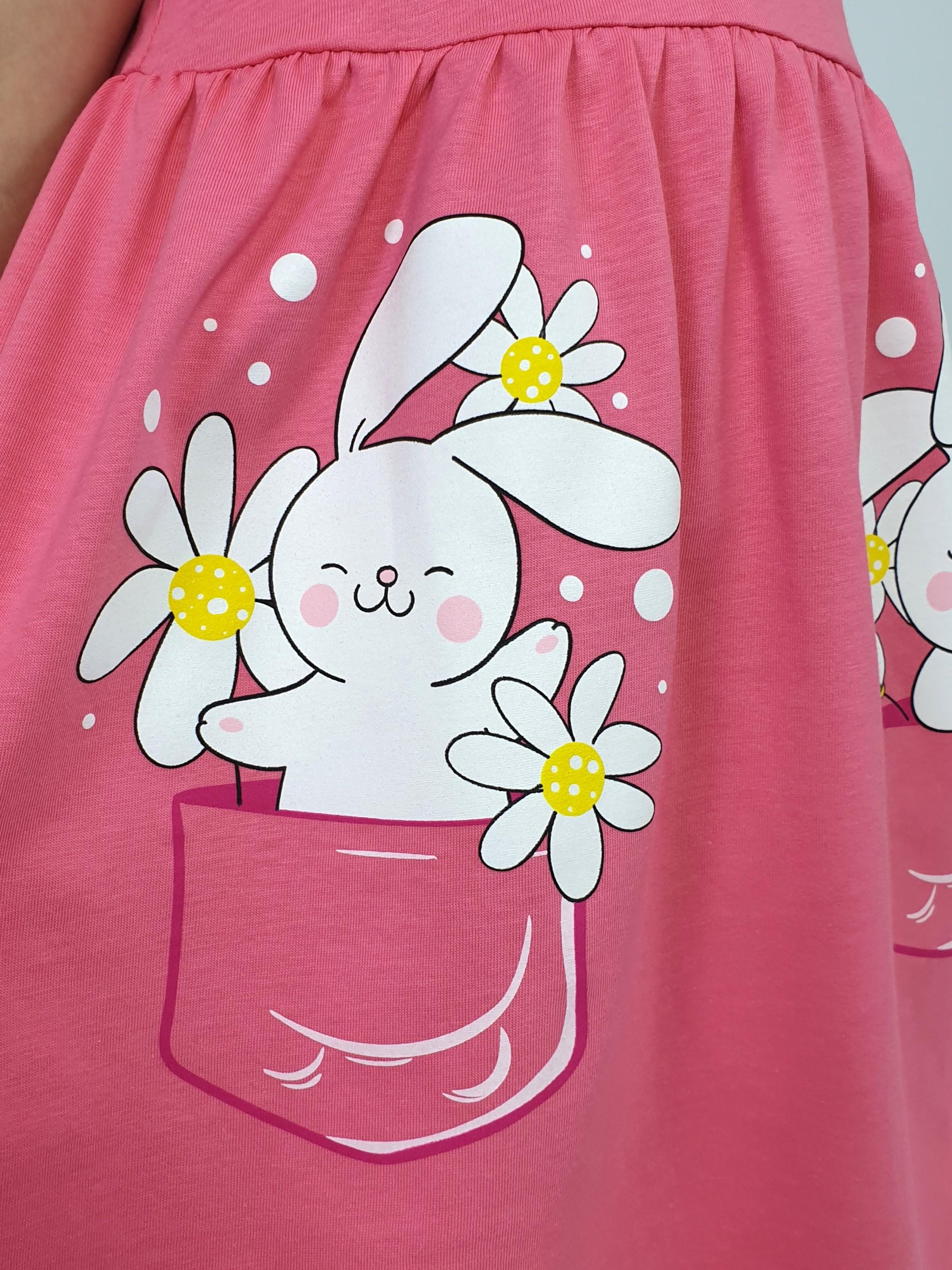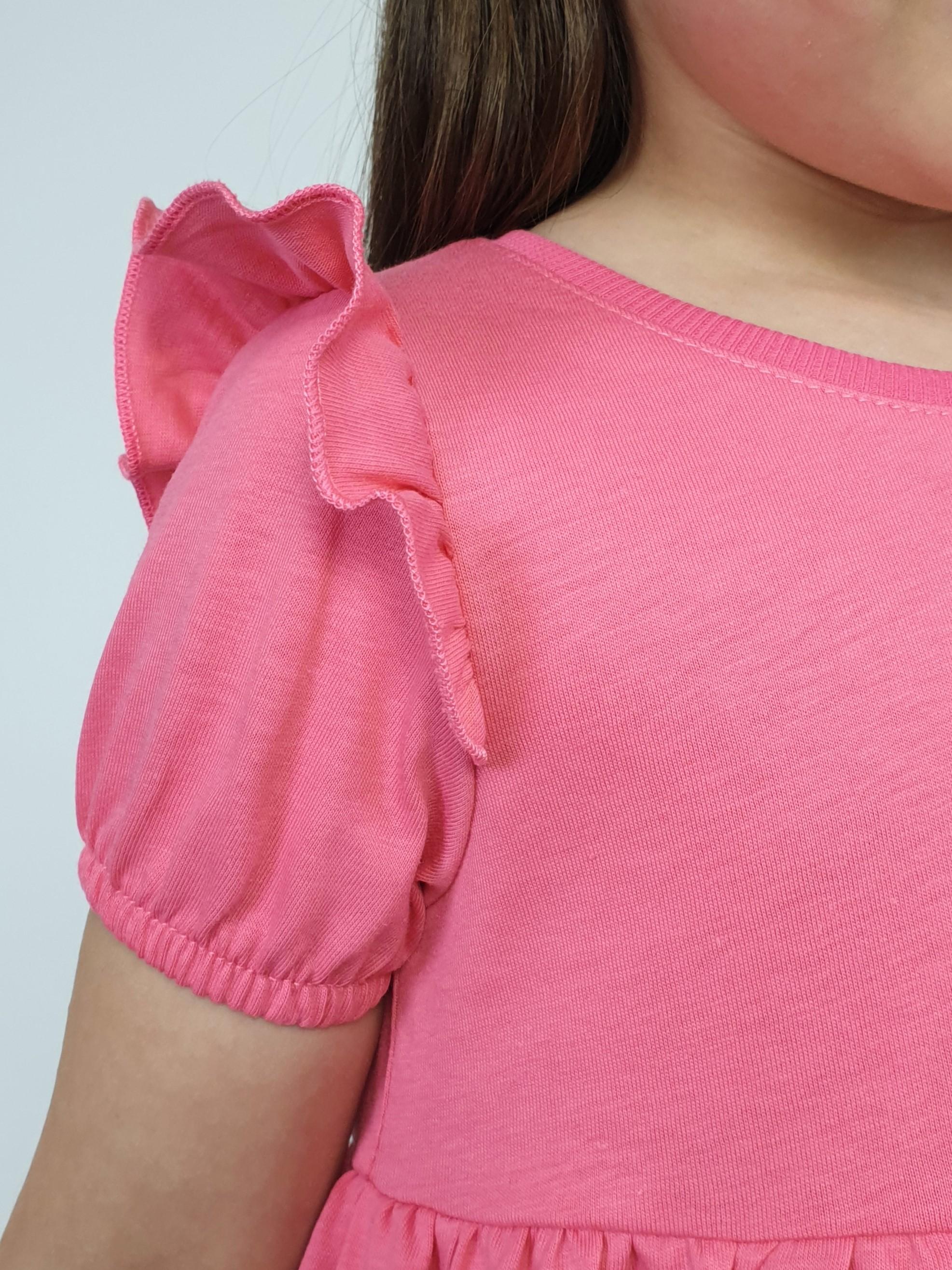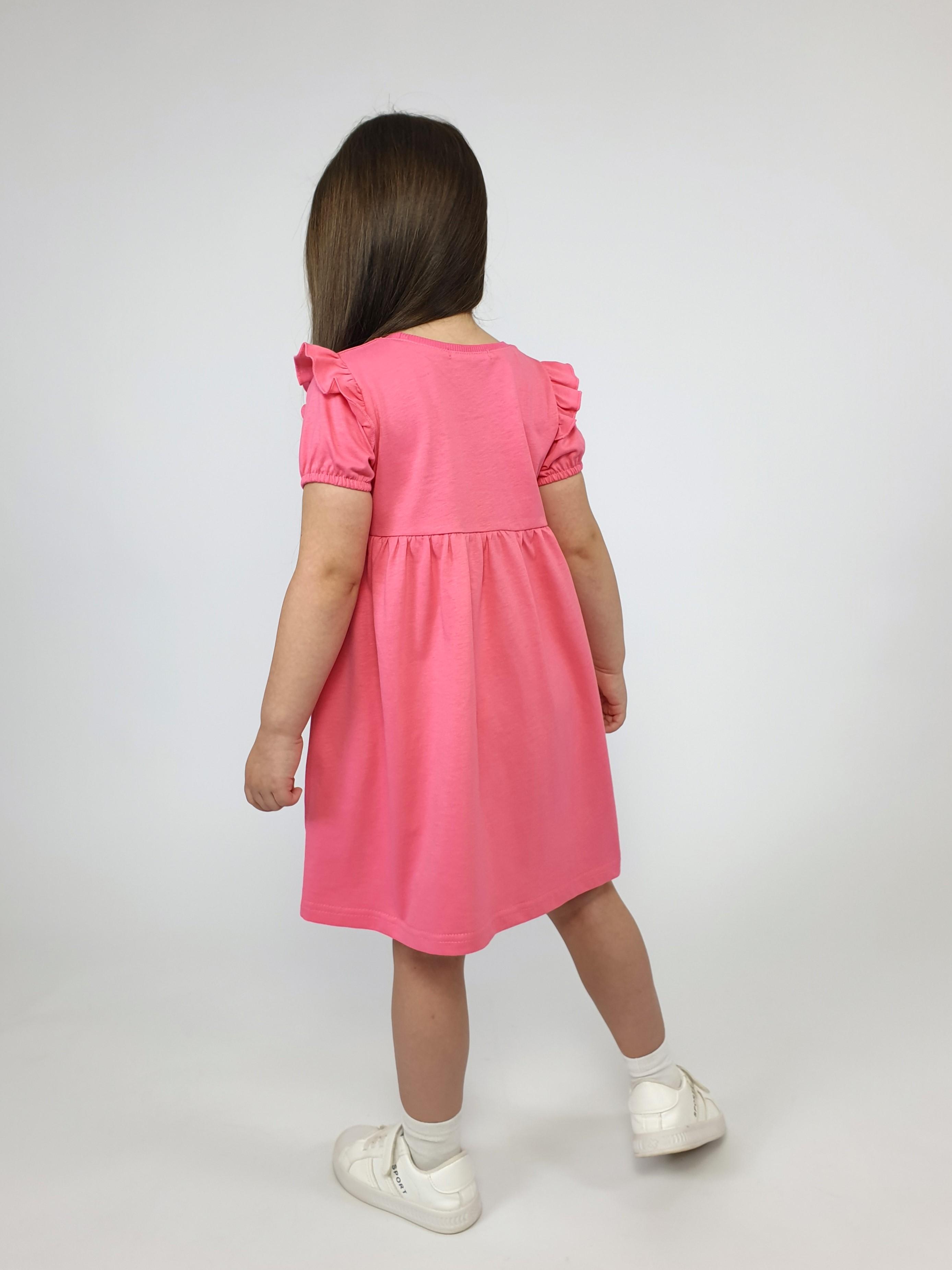 Кулирное полотно:100% х/б. Платье-перед и спинка с кокеткой,сборка по верху юбки.Рукав короткий,внизу собран на резинку,в пройме рюша.Горловина обработана ластиком.Печать на переднем полотнище юбки.