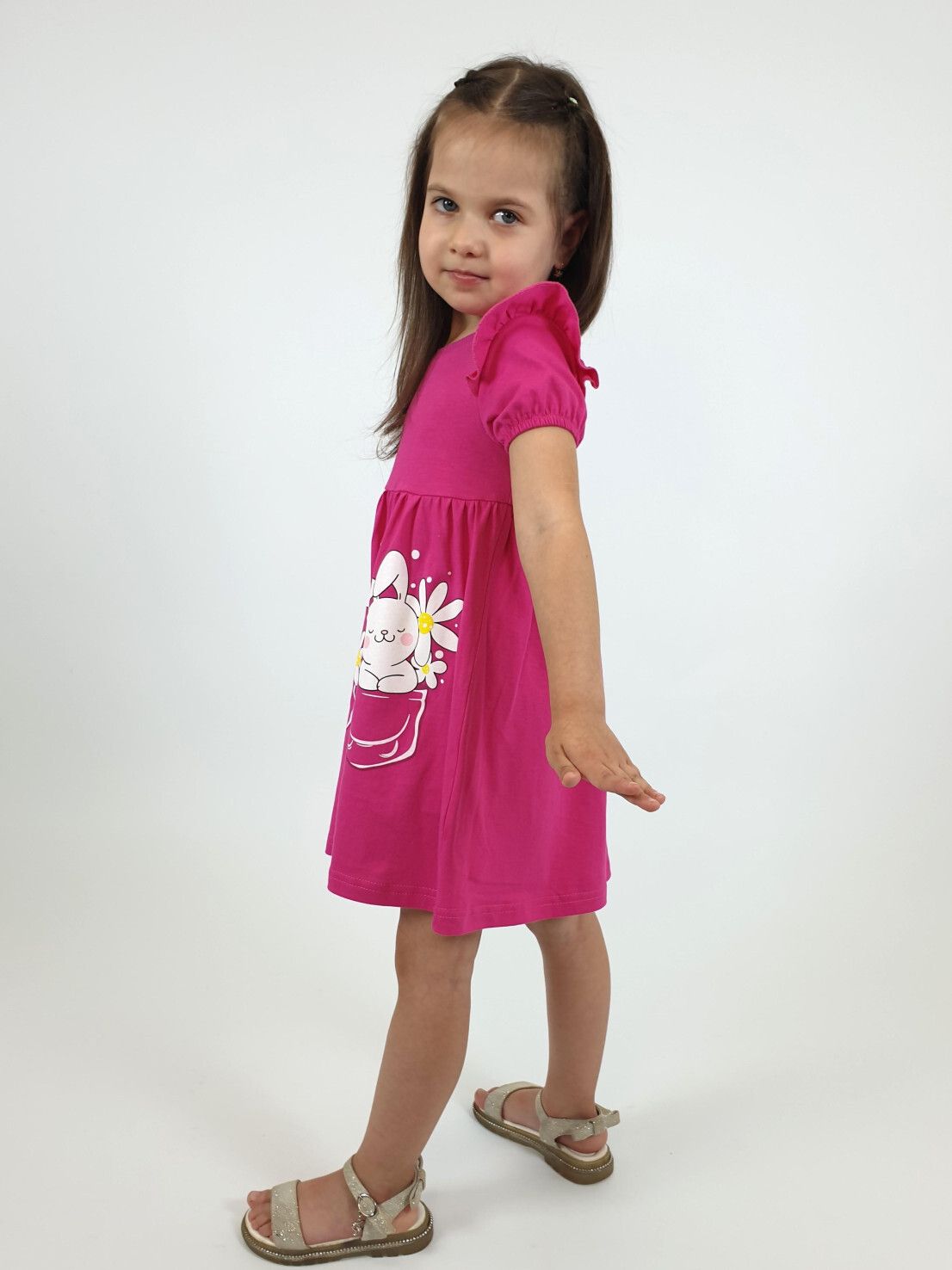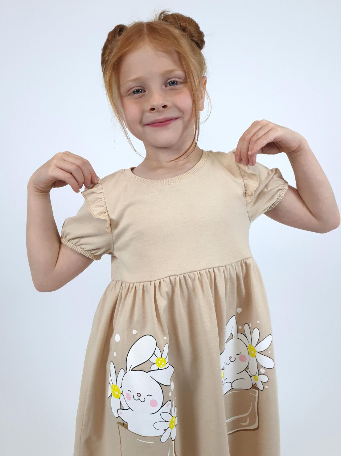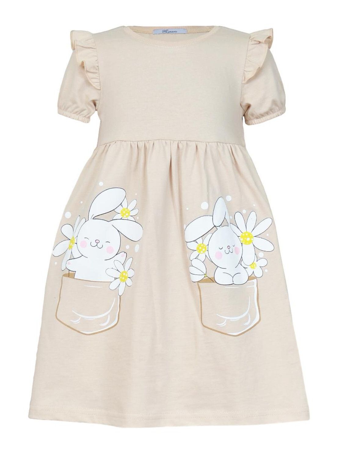 Кулирное полотно:100% х/б. Платье-перед и спинка с кокеткой,сборка по верху юбки.Рукав короткий,внизу собран на резинку,в пройме рюша.Горловина обработана ластиком.Печать на переднем полотнище юбки.