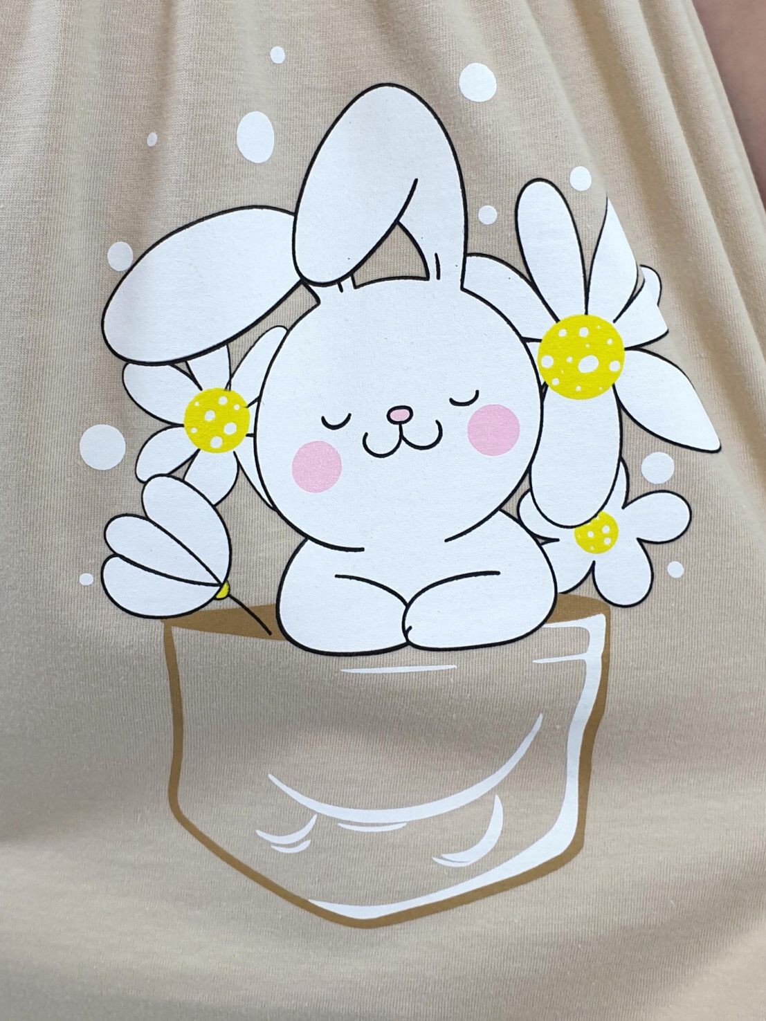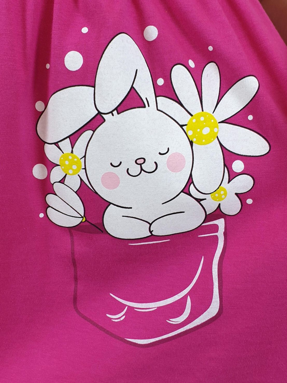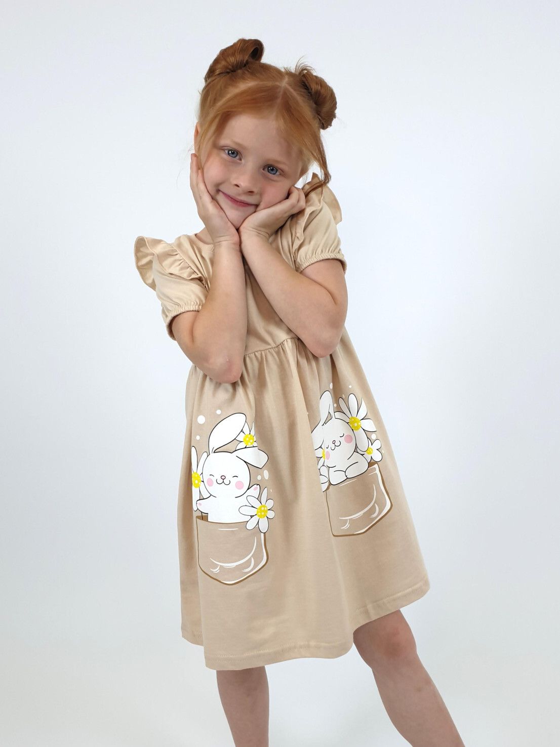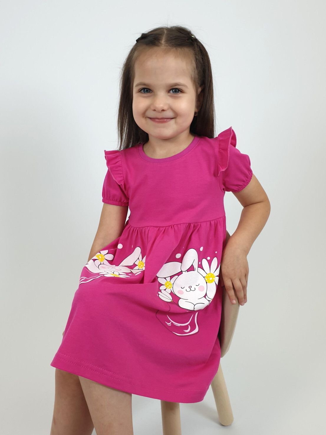Кулирное полотно:100% х/б. Платье-перед и спинка с кокеткой,сборка по верху юбки.Рукав короткий,внизу собран на резинку,в пройме рюша.Горловина обработана ластиком.Печать на переднем полотнище юбки.