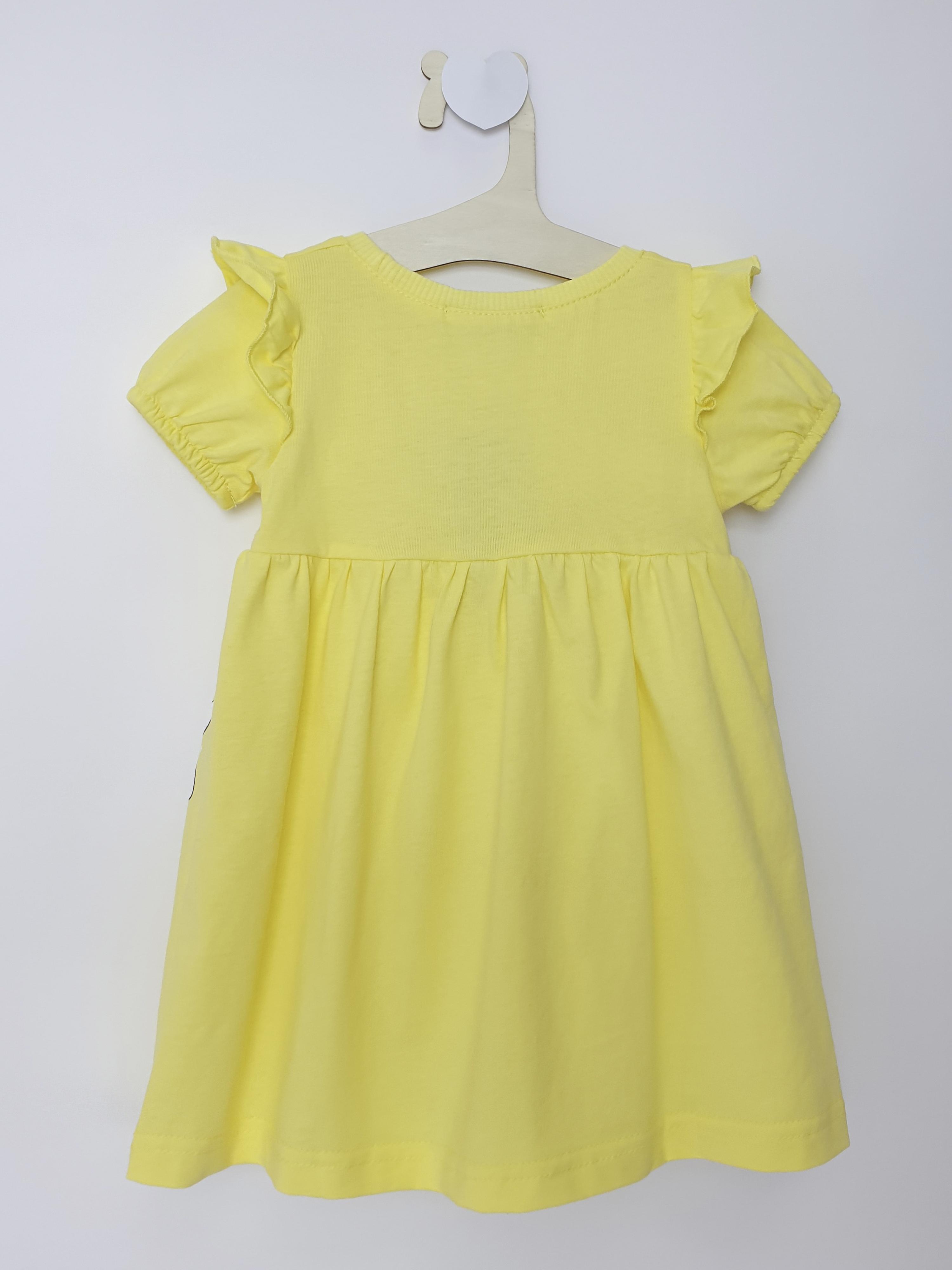 Кулирное полотно:100% х/б. Платье-перед и спинка с кокеткой,сборка по верху юбки.Рукав короткий,внизу собран на резинку,в пройме рюша.Горловина обработана ластиком.Печать на переднем полотнище юбки.