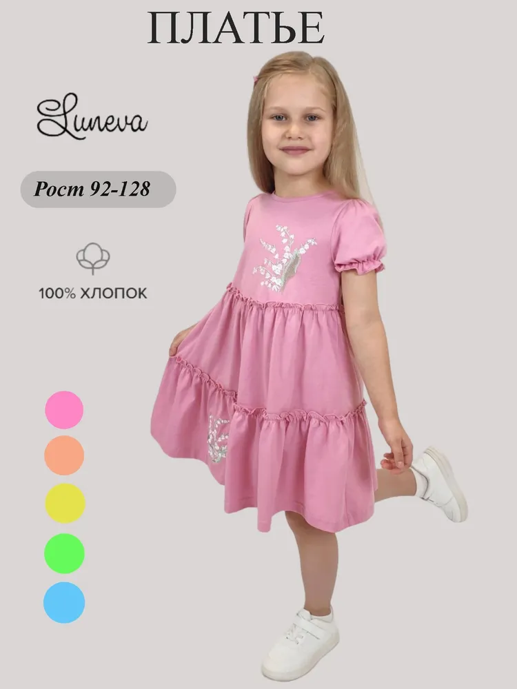 Кулирное полотно:100% х/б. Платье-силуэт трапеция,короткий рукав "фонарик".Юбка переда и спинки из двух воланов,по переднему нижнему волану вышивка.Кокетка переда с вышивкой,застежка по спинке на пуговицы.Горловина окантована.