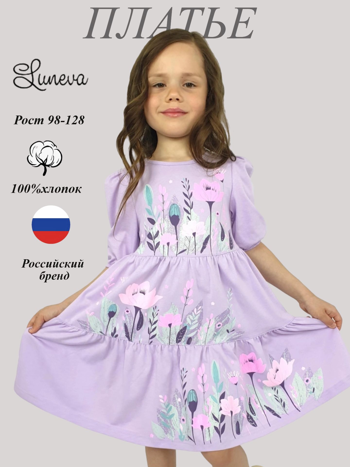 Кулирное полотно:100% х/б. Платье-силуэт трапеция,короткий рукав "фонарик" на резинке.Юбка переда и спинки из двух воланов,по передним воланам печать.Кокетка переда с печатью,застежка по спинке на пуговицы.Горловина окантована.