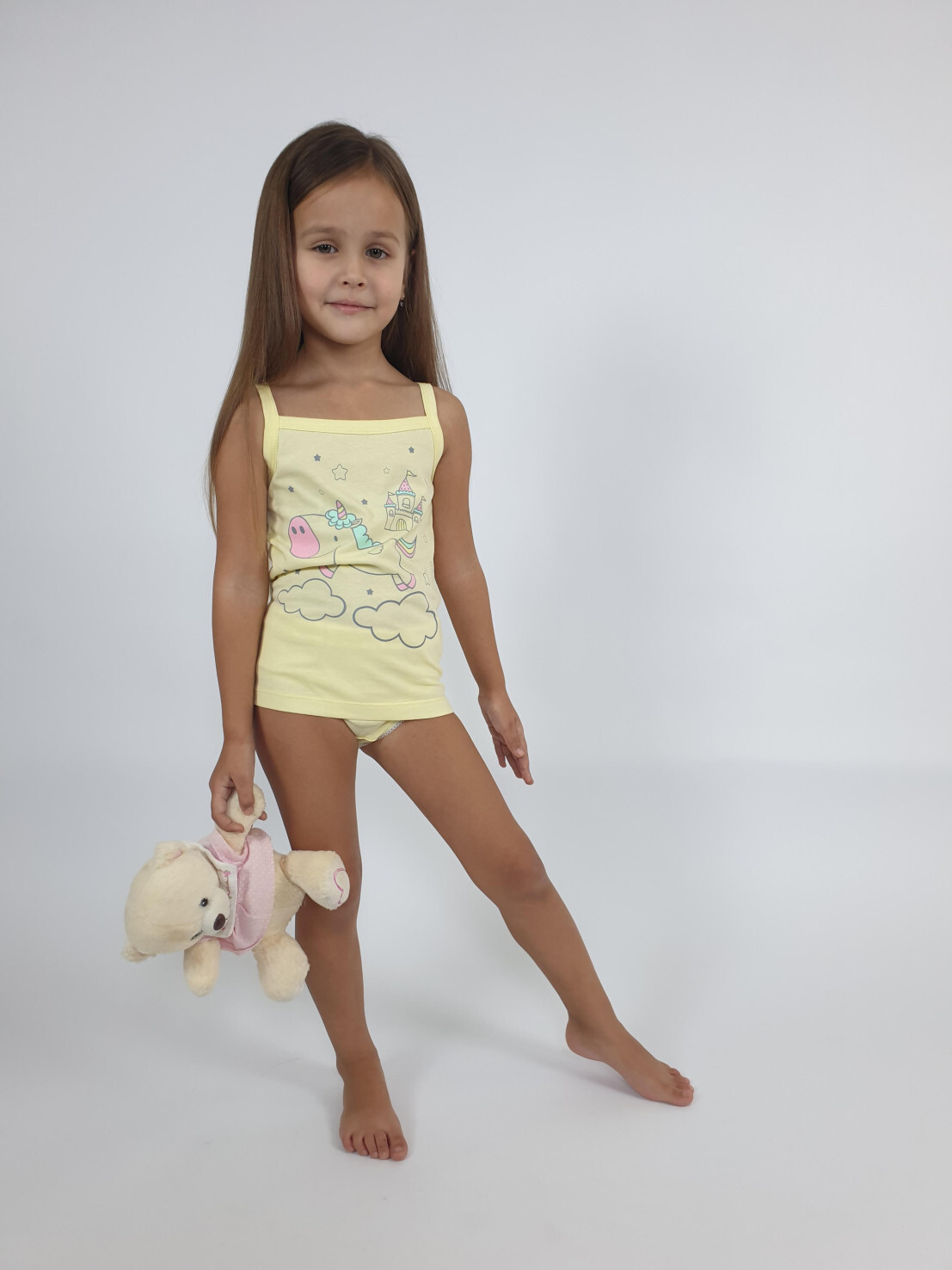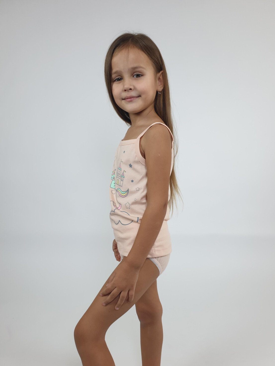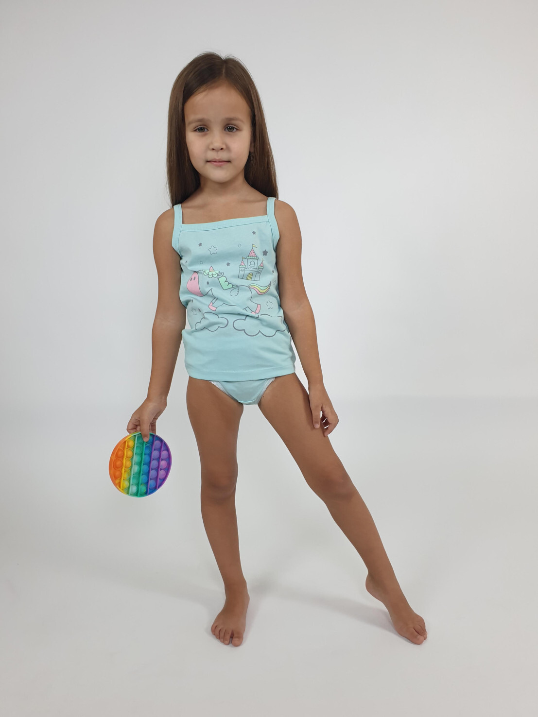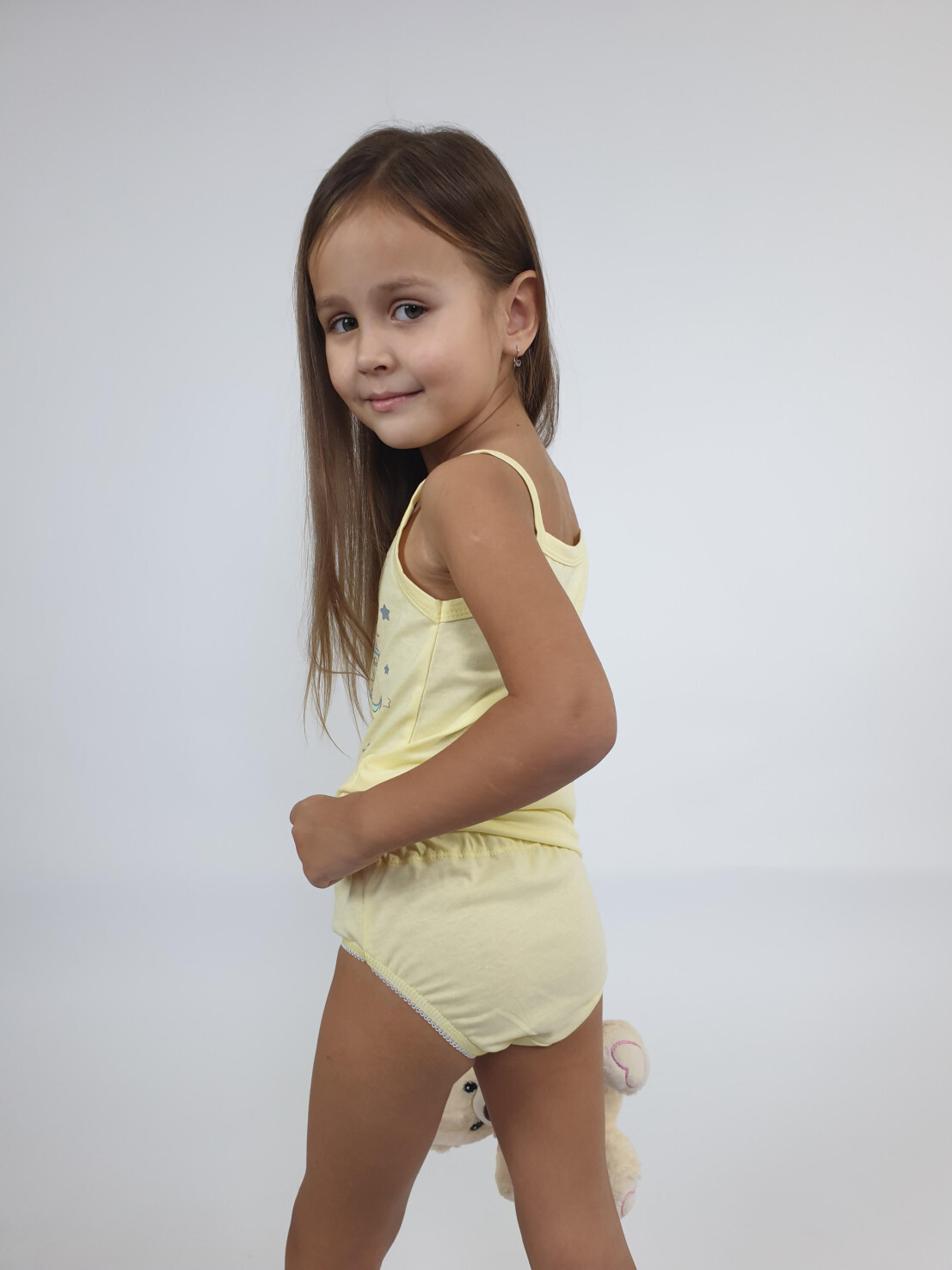 Кулирное полотно: 100% х/б. Майка-на бретелях,перед с печатью. Трусы-на резинке,ножки обработаны ажурной резинкой.