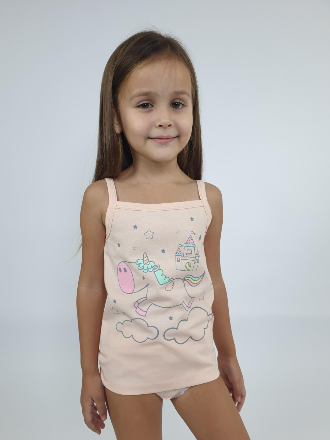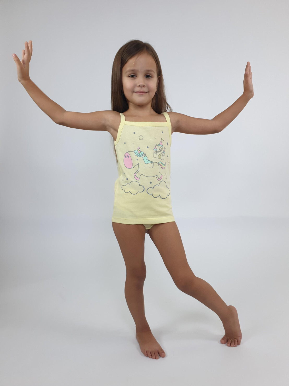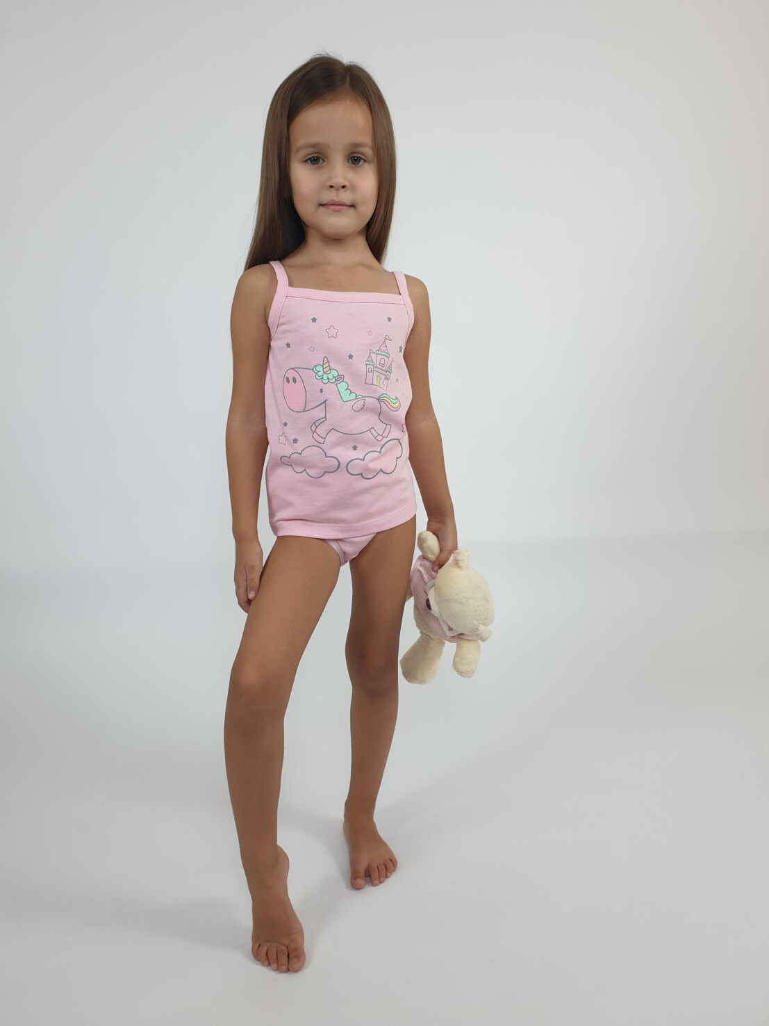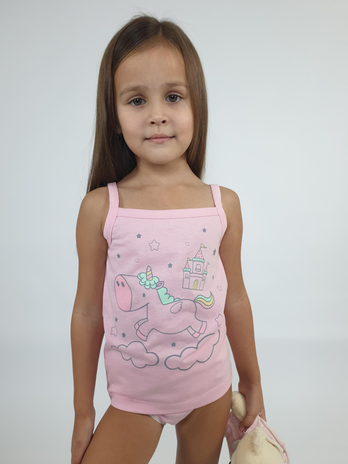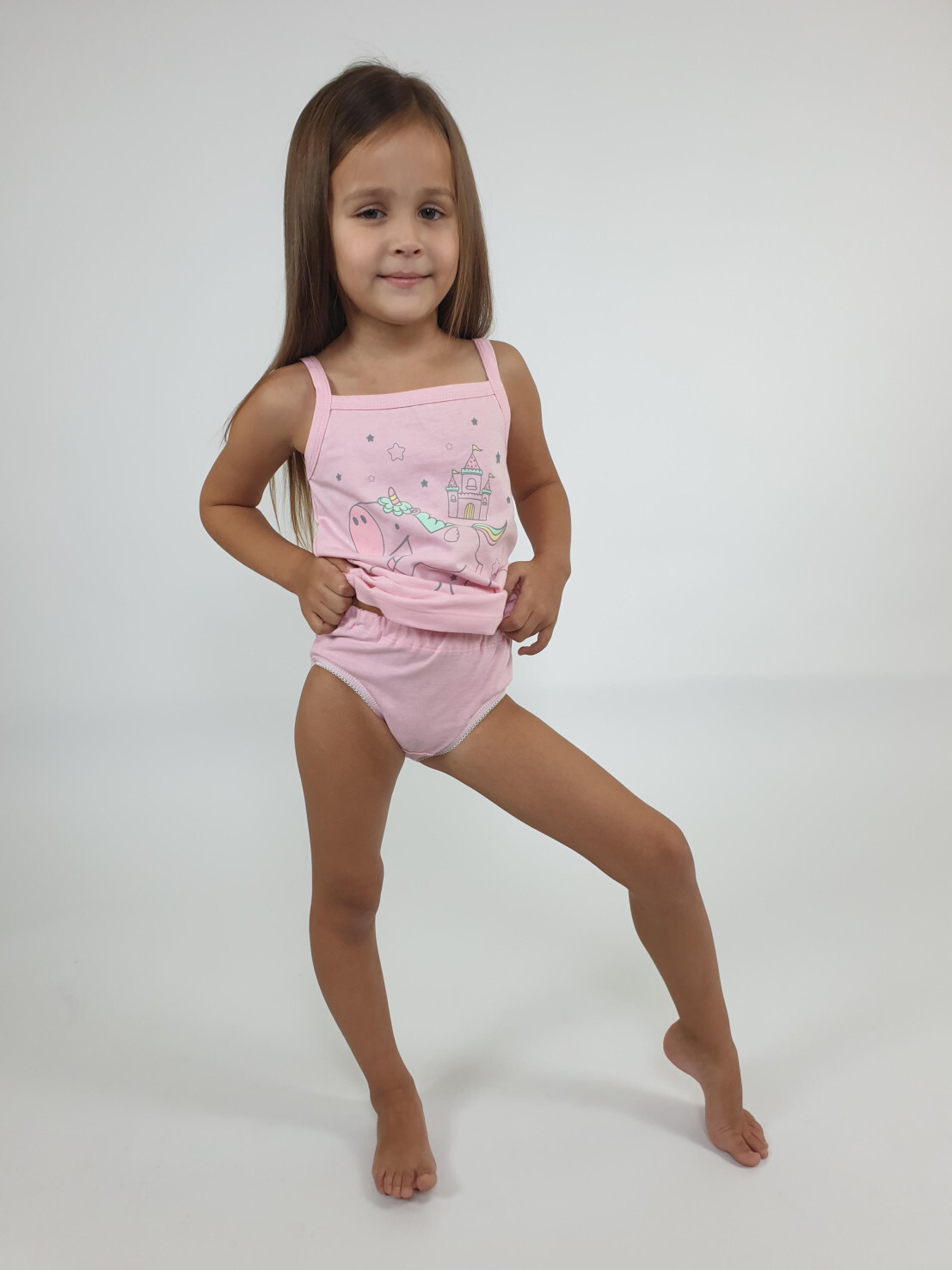 Кулирное полотно: 100% х/б. Майка-на бретелях,перед с печатью. Трусы-на резинке,ножки обработаны ажурной резинкой.