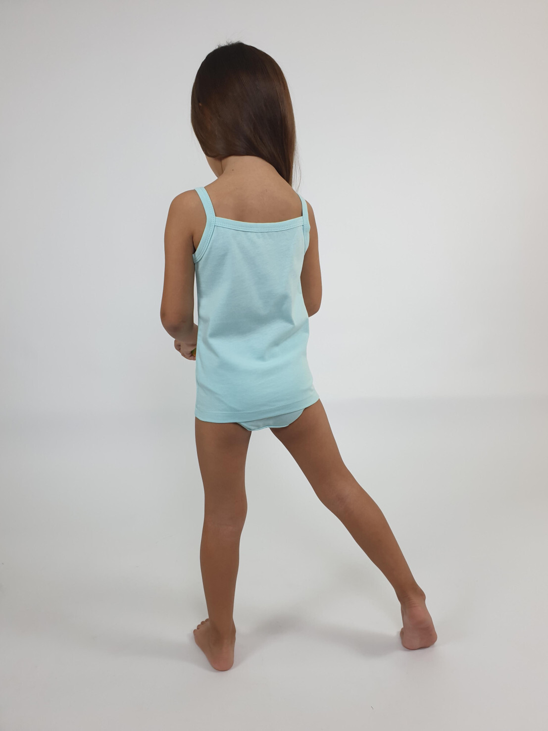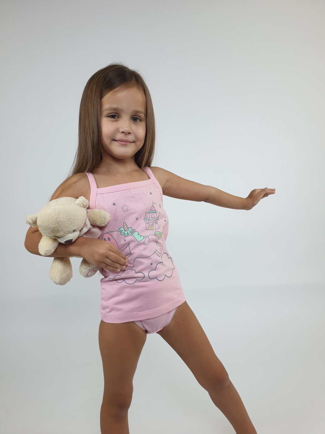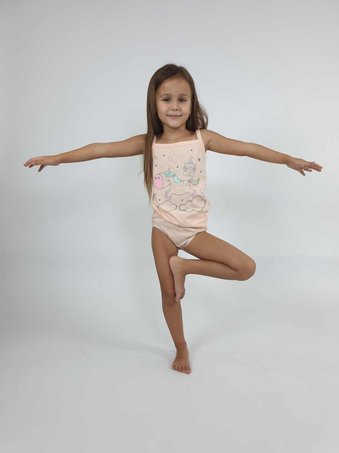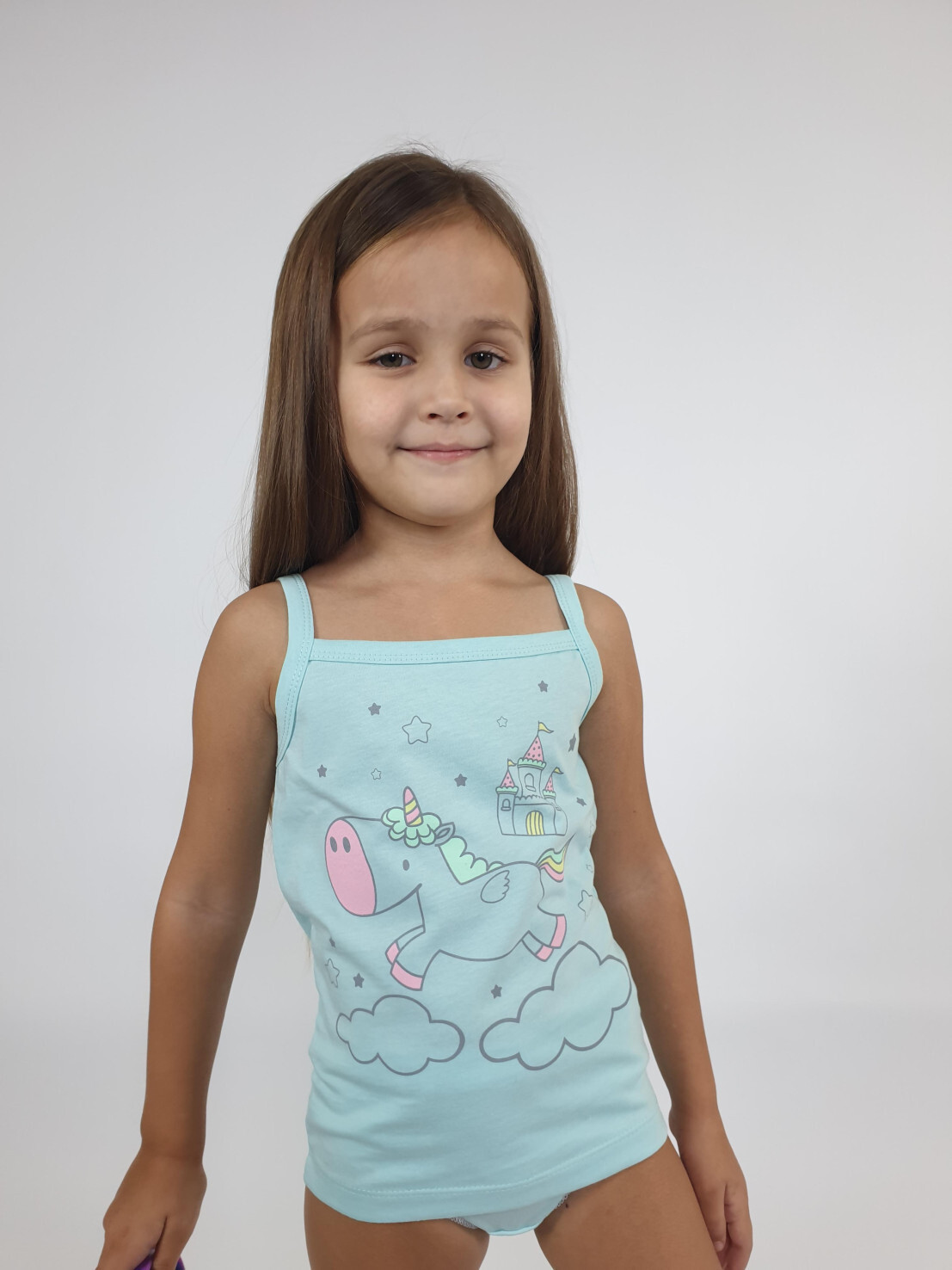 Кулирное полотно: 100% х/б. Майка-на бретелях,перед с печатью. Трусы-на резинке,ножки обработаны ажурной резинкой.