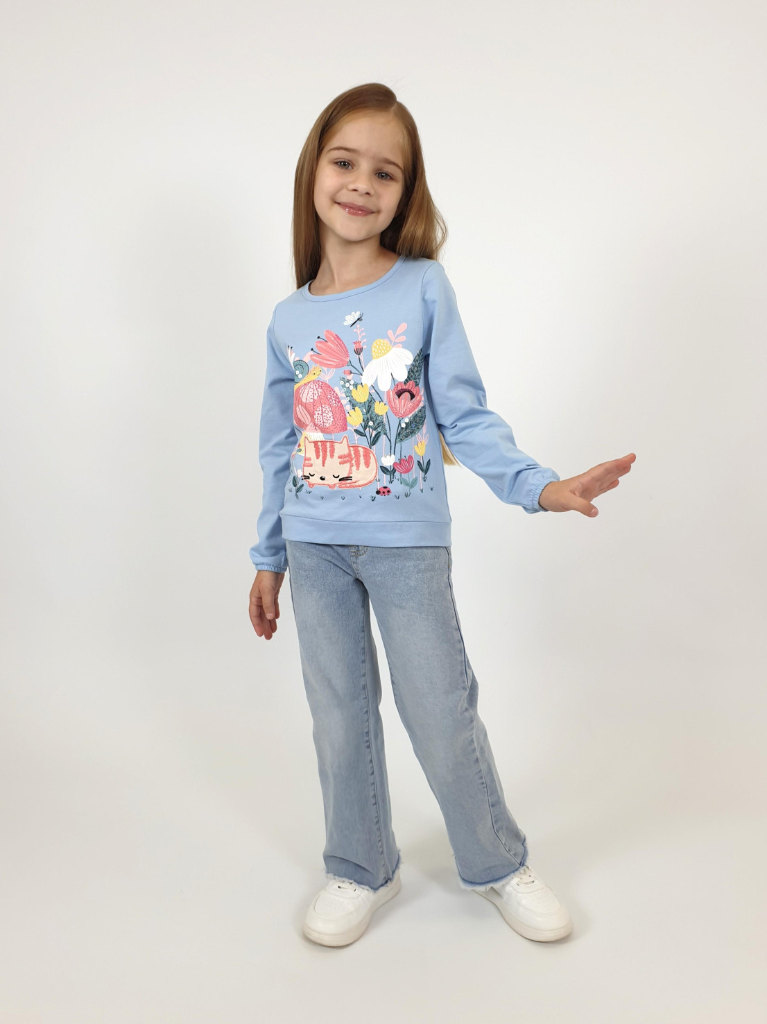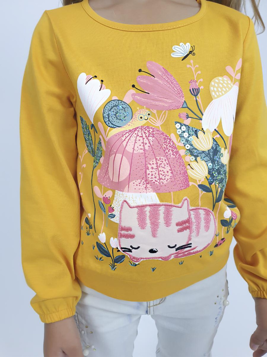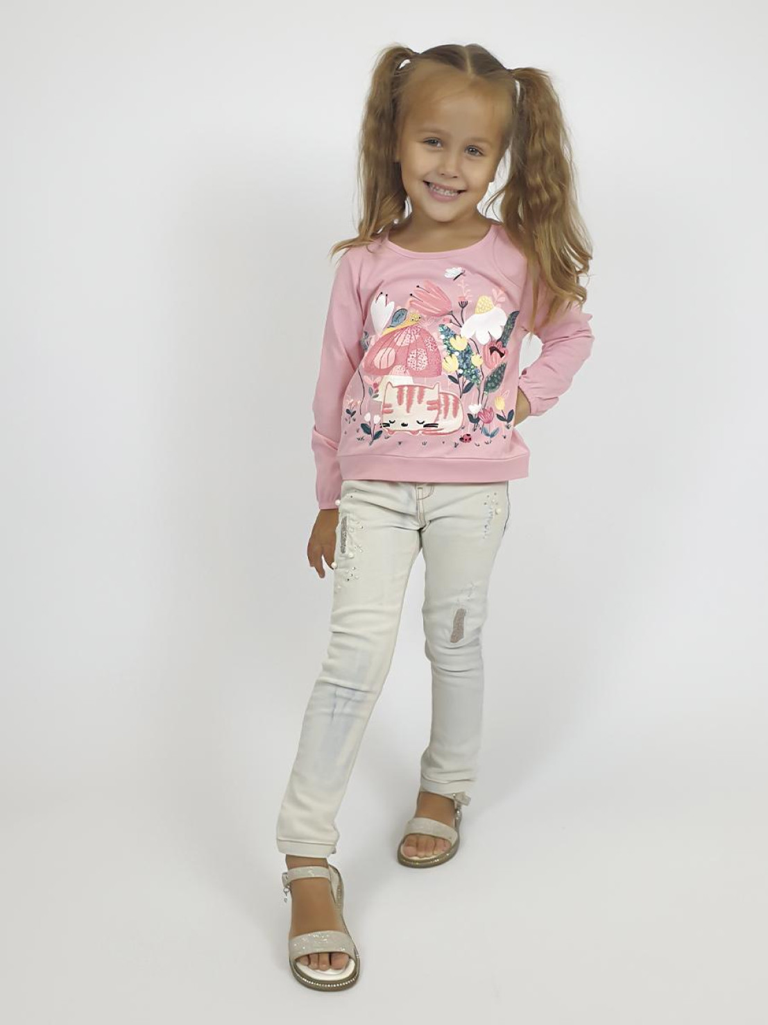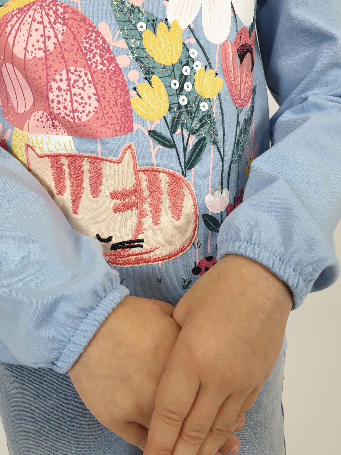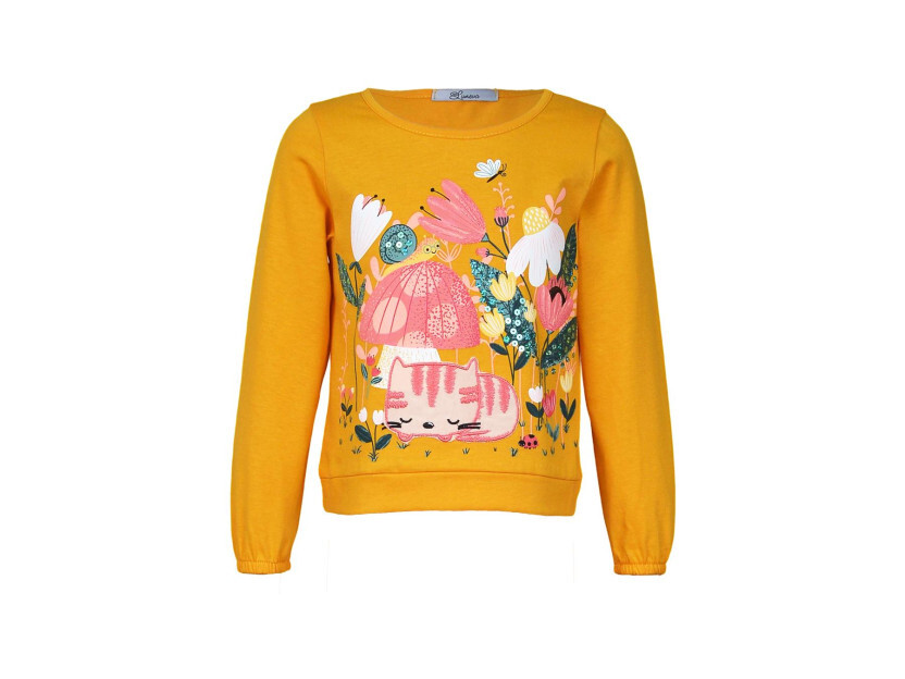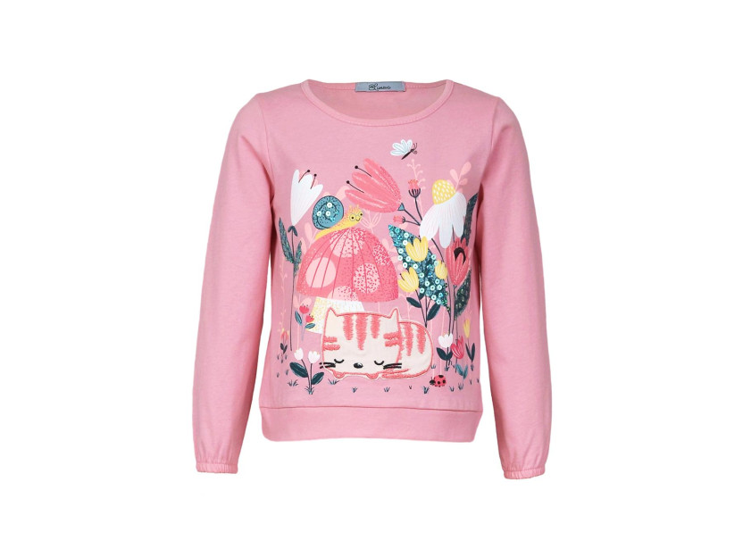 Кулирное полотно:100% х/б. Джемпер-прямого силуэта,на поясе.Печать на переде и вышивка(пайетки) с аппликацией,втачной длинный рукав на резинке.Горловина окантована.