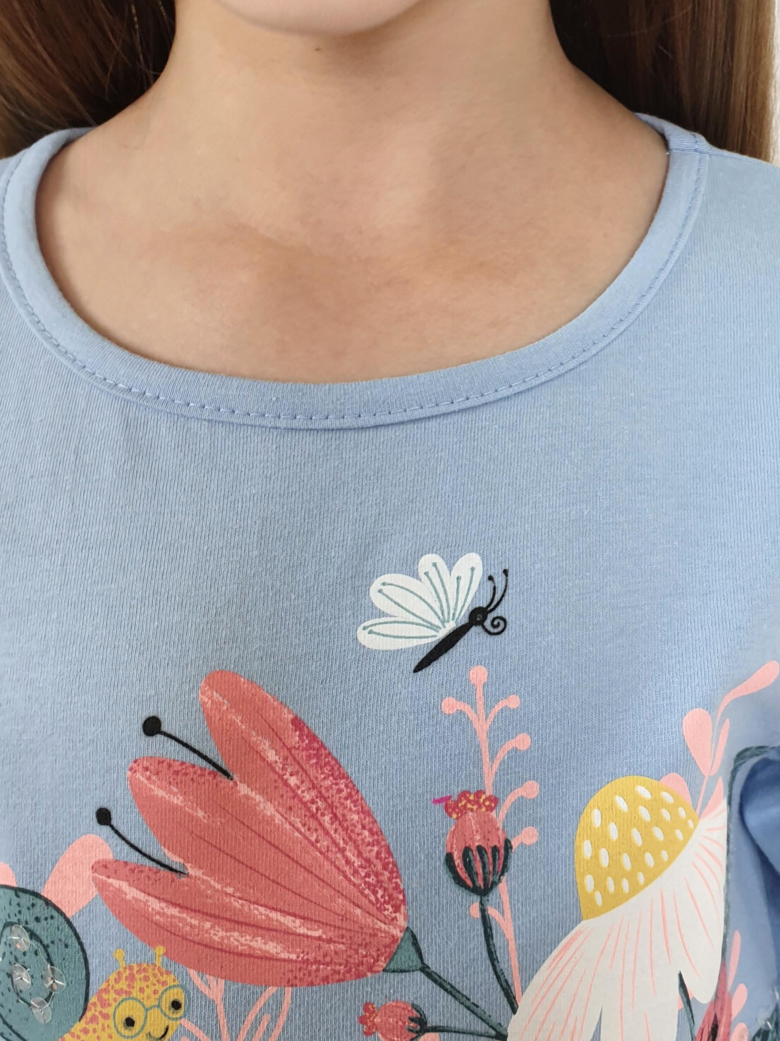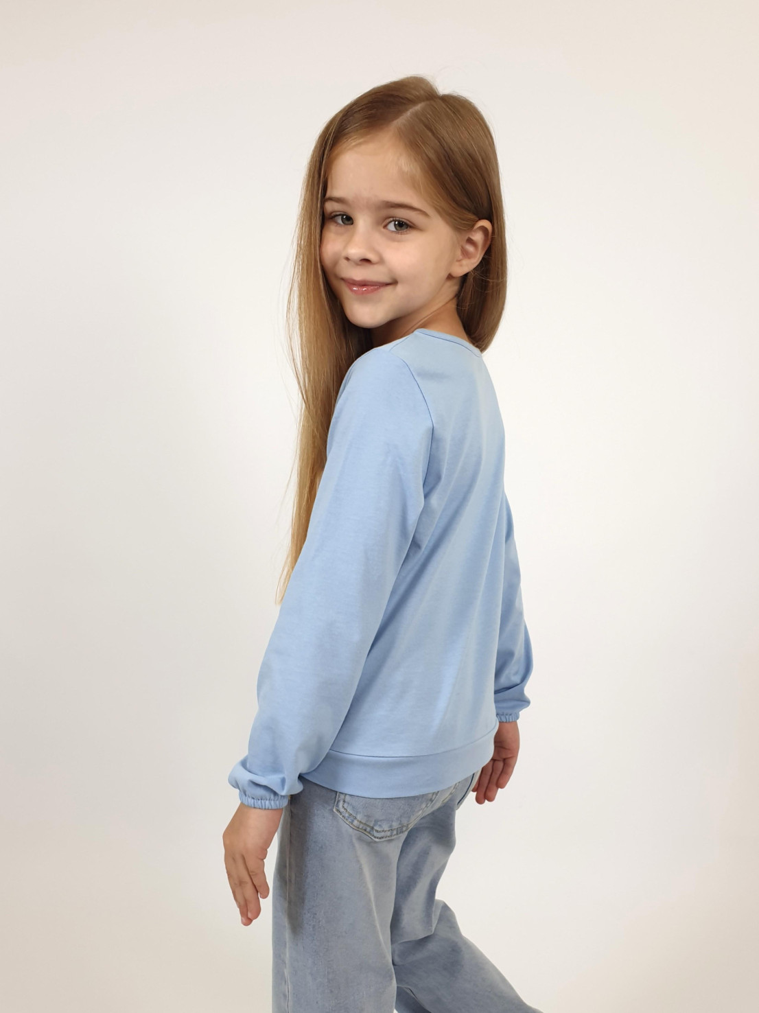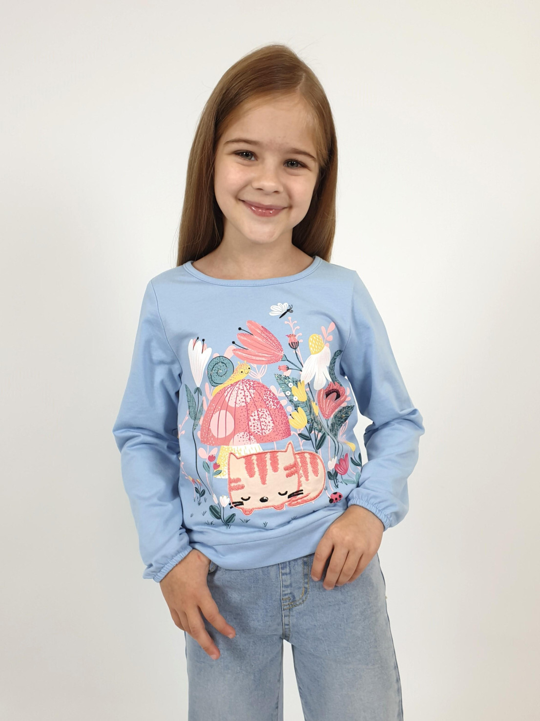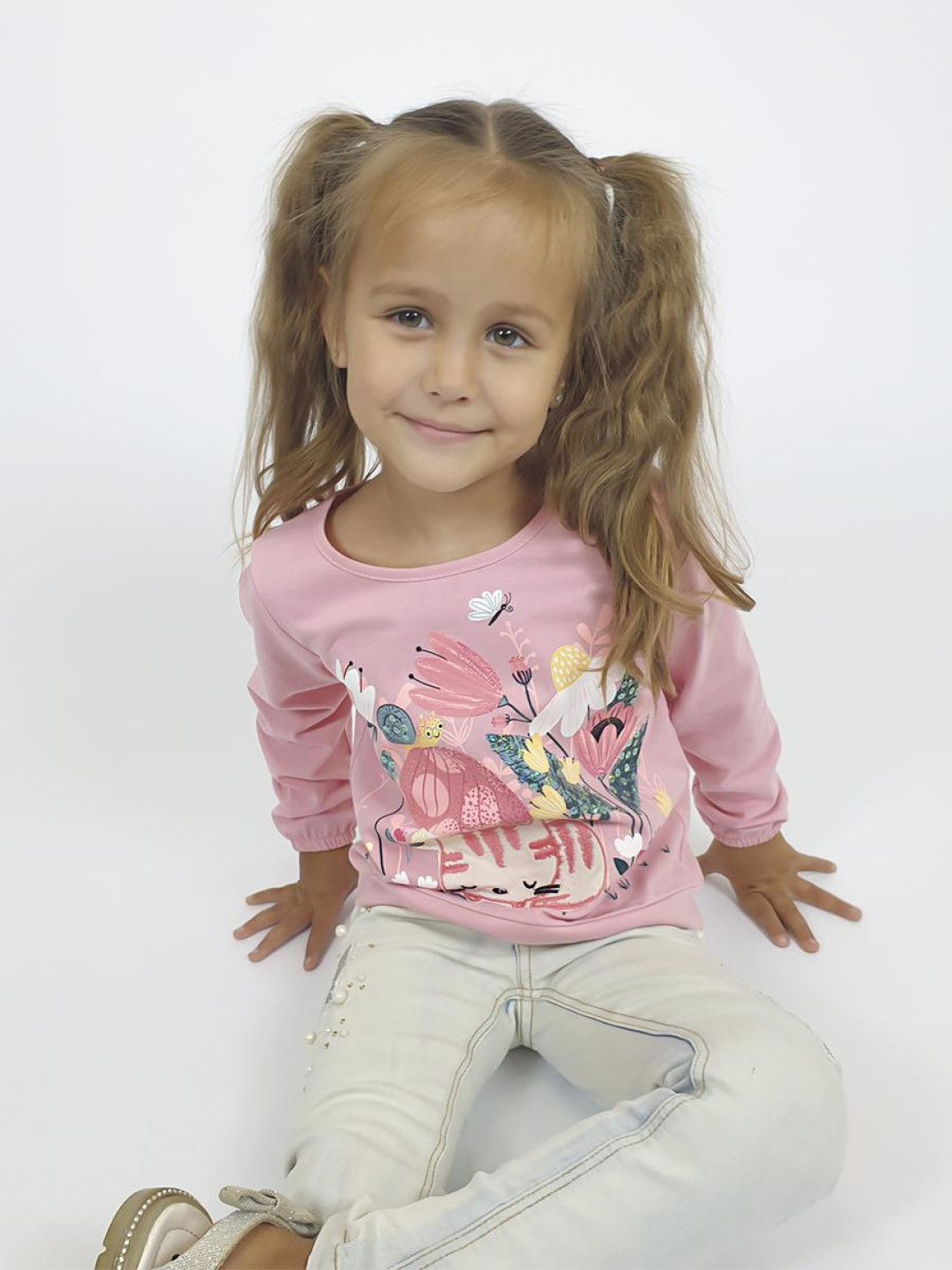 Кулирное полотно:100% х/б. Джемпер-прямого силуэта,на поясе.Печать на переде и вышивка(пайетки) с аппликацией,втачной длинный рукав на резинке.Горловина окантована.