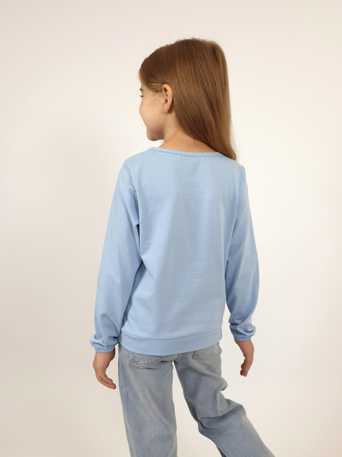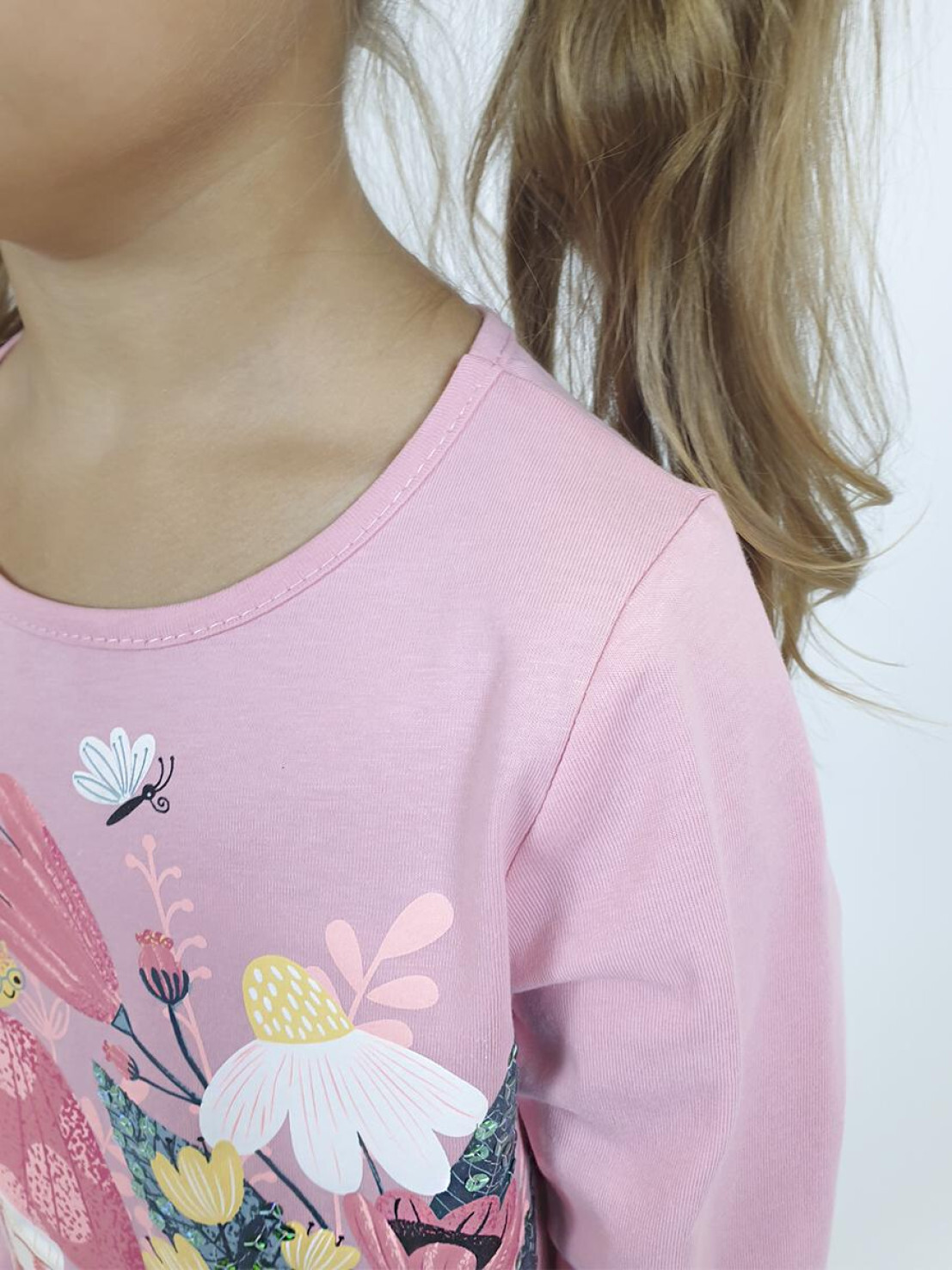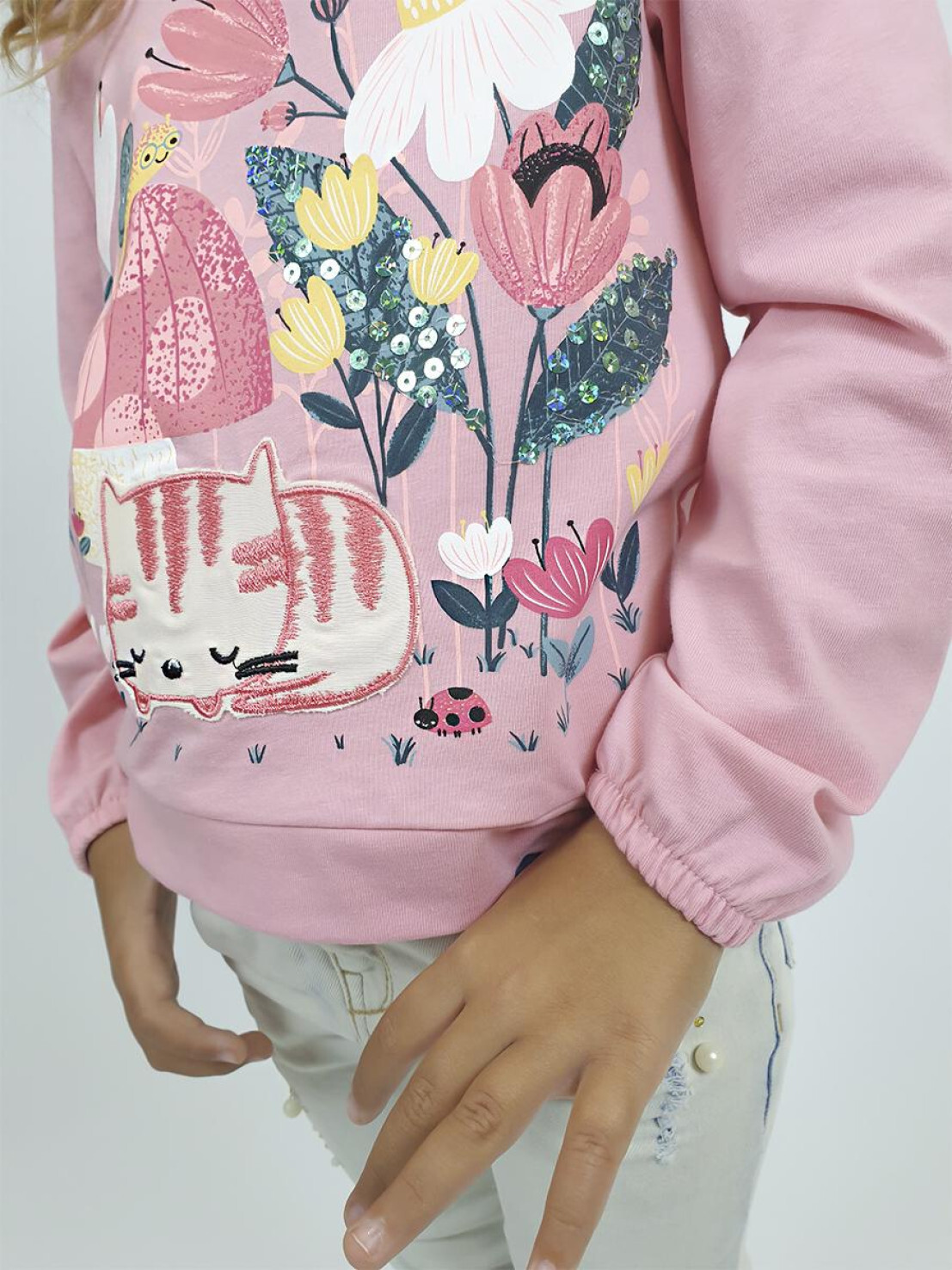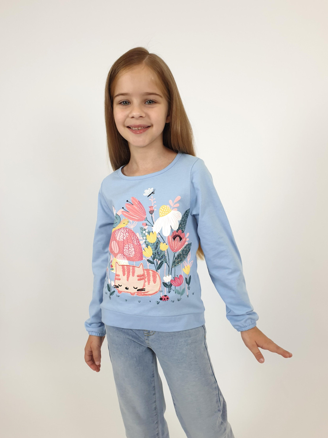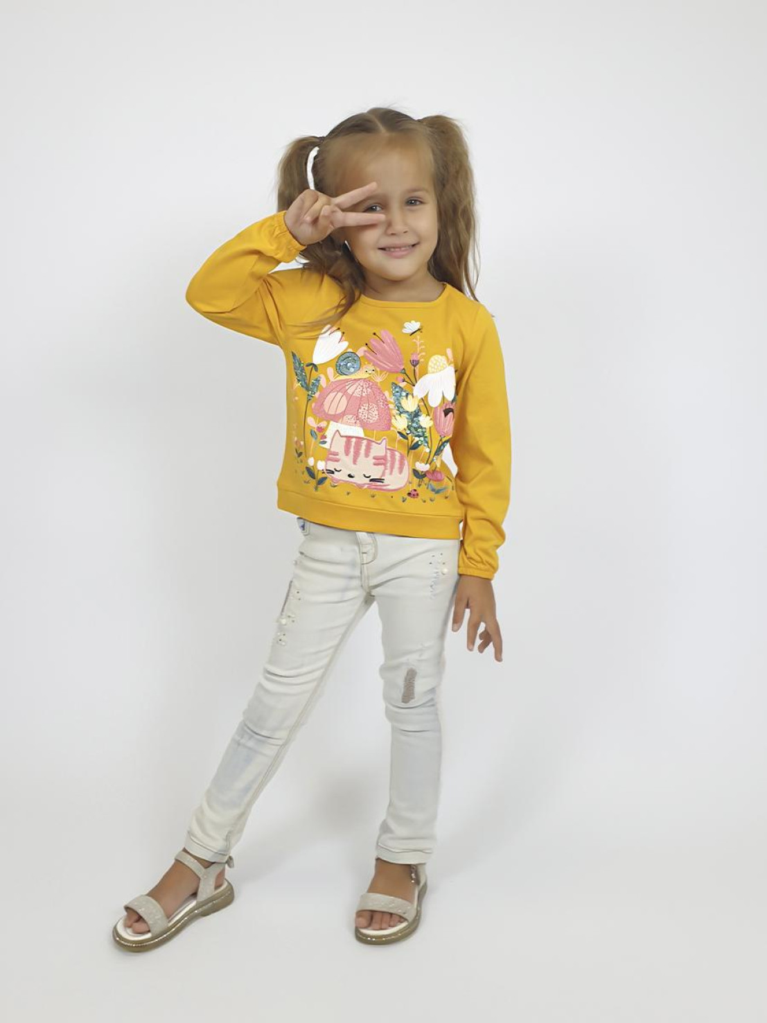 Кулирное полотно:100% х/б. Джемпер-прямого силуэта,на поясе.Печать на переде и вышивка(пайетки) с аппликацией,втачной длинный рукав на резинке.Горловина окантована.