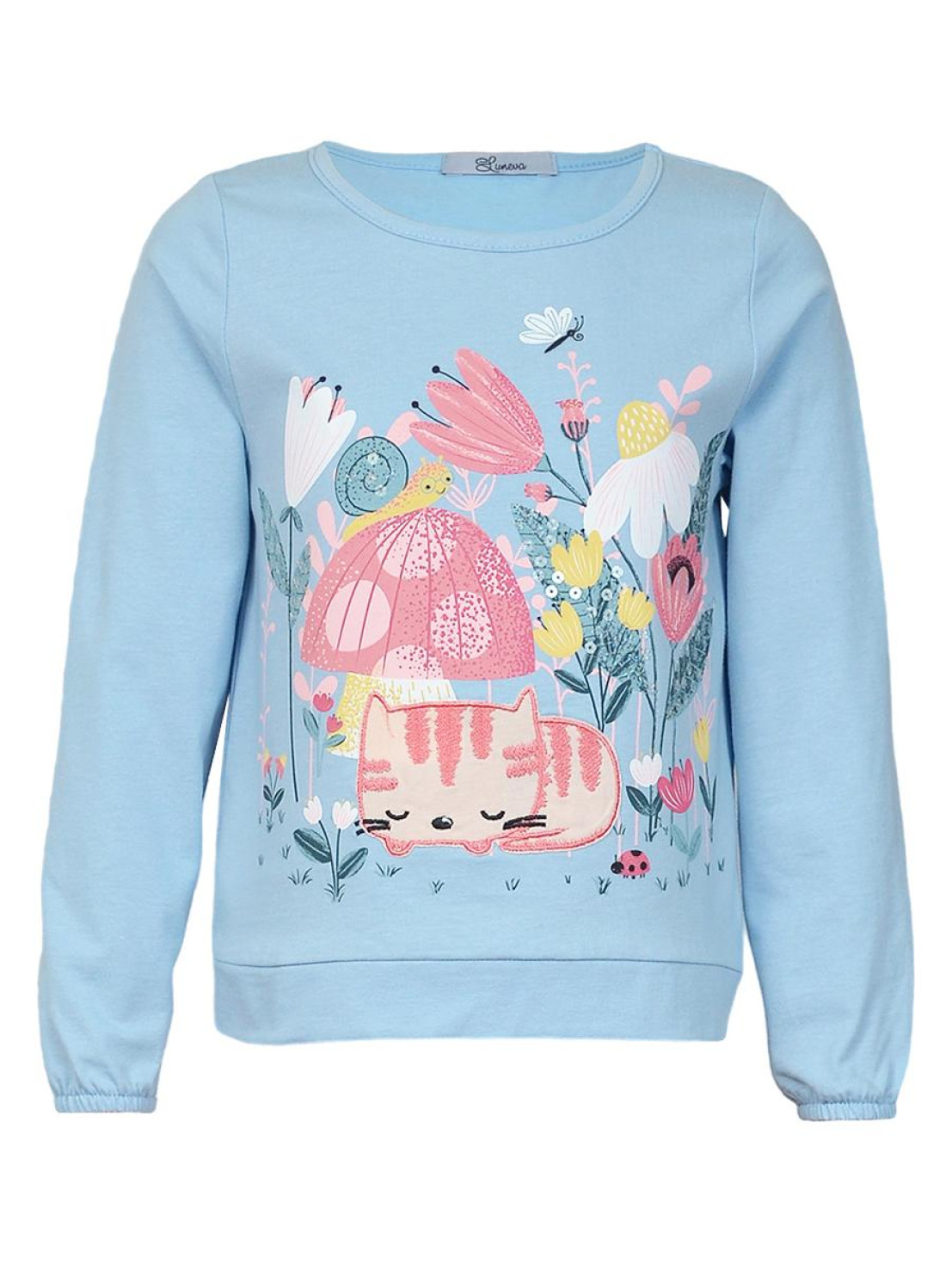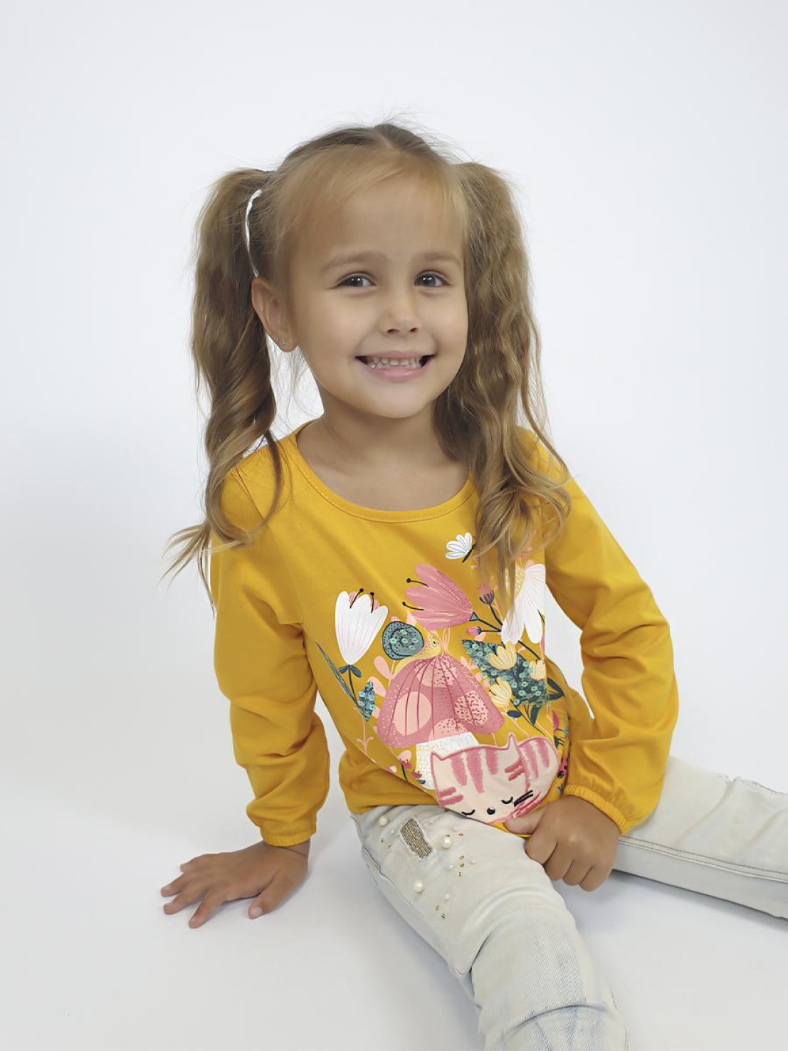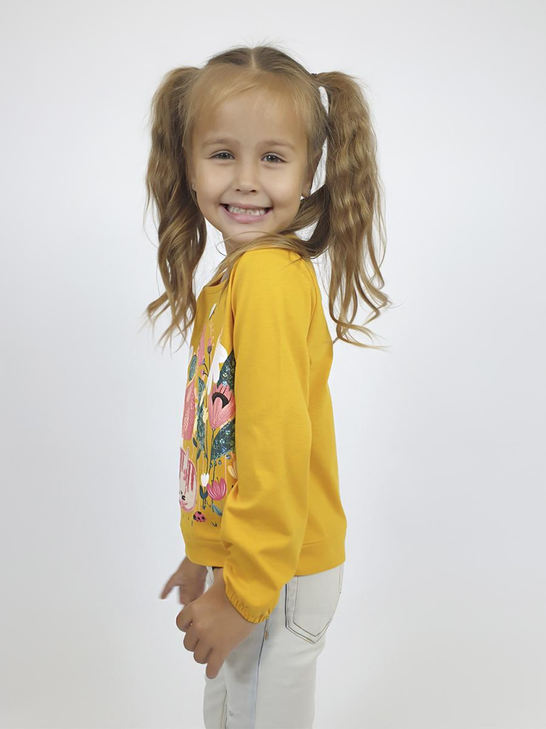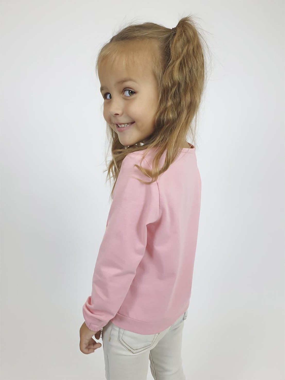 Кулирное полотно:100% х/б. Джемпер-прямого силуэта,на поясе.Печать на переде и вышивка(пайетки) с аппликацией,втачной длинный рукав на резинке.Горловина окантована.