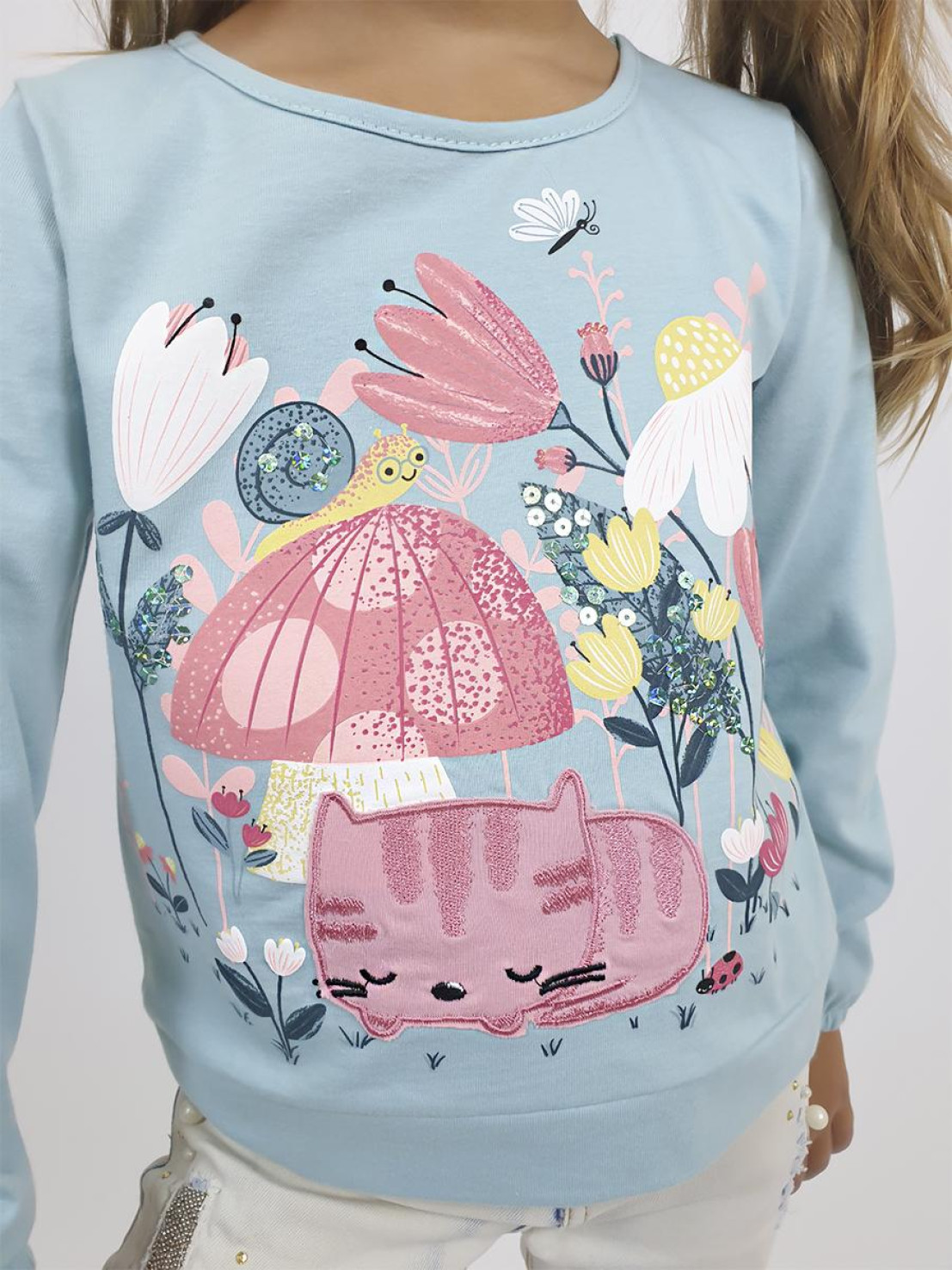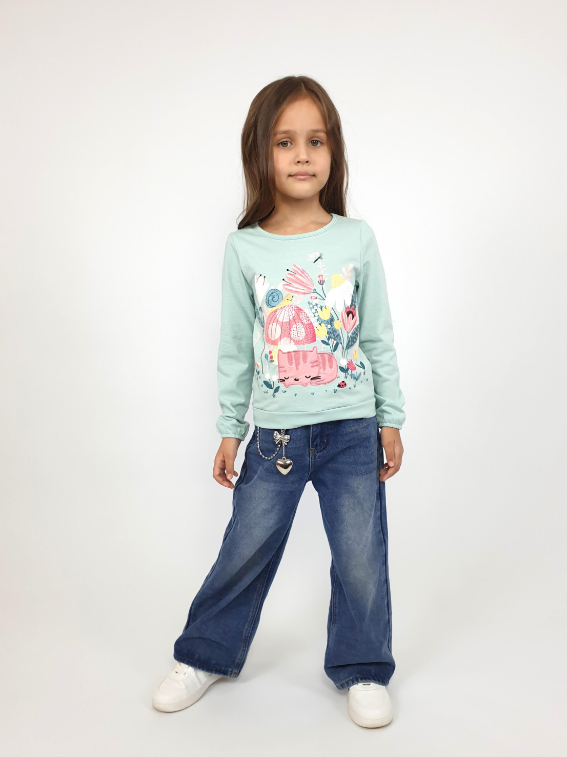 Кулирное полотно:100% х/б. Джемпер-прямого силуэта,на поясе.Печать на переде и вышивка(пайетки) с аппликацией,втачной длинный рукав на резинке.Горловина окантована.