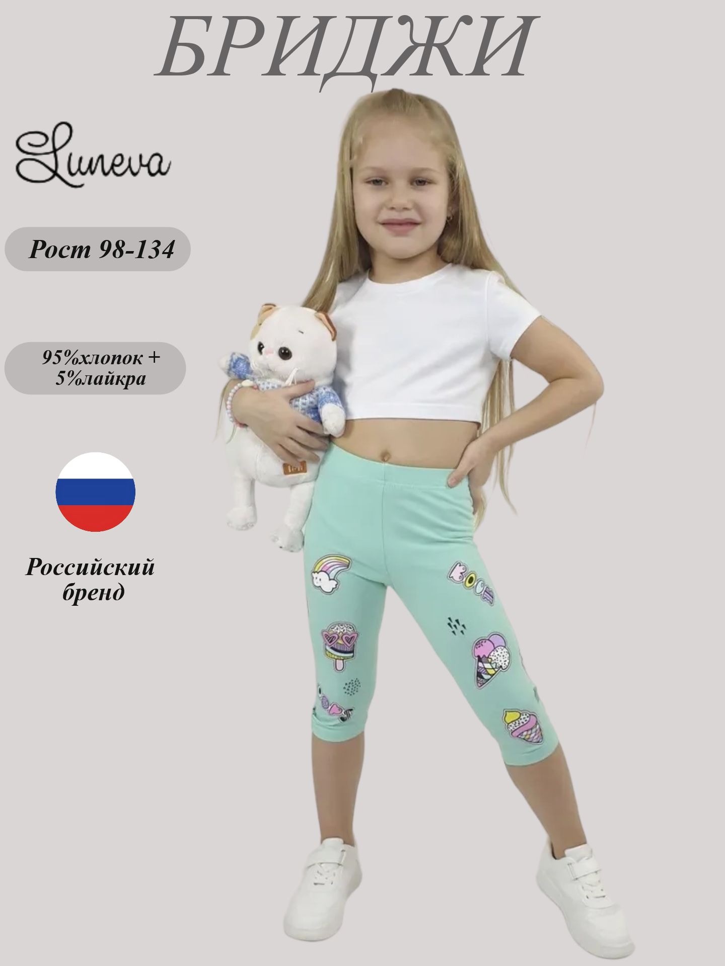 Кулирное полотно:95% х/б,5% лайкра. Лосины-укороченные с печатью,без бокового шва.