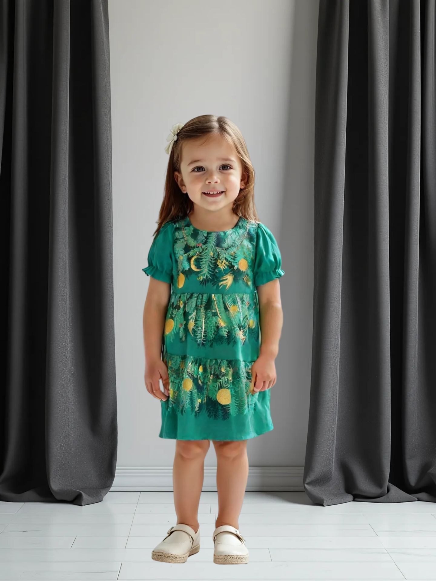 Кулирное полотно:100% х/б. Платье-силуэт трапеция,короткий рукав "фонарик". Юбка переда и спинки из двух воланов,по передним воланом печать и вышивка(пайетки).Кокетка переда с печатью и вышивкой(пайетки,застежка по спинке на пуговицы.Горловина окантована и подшита.