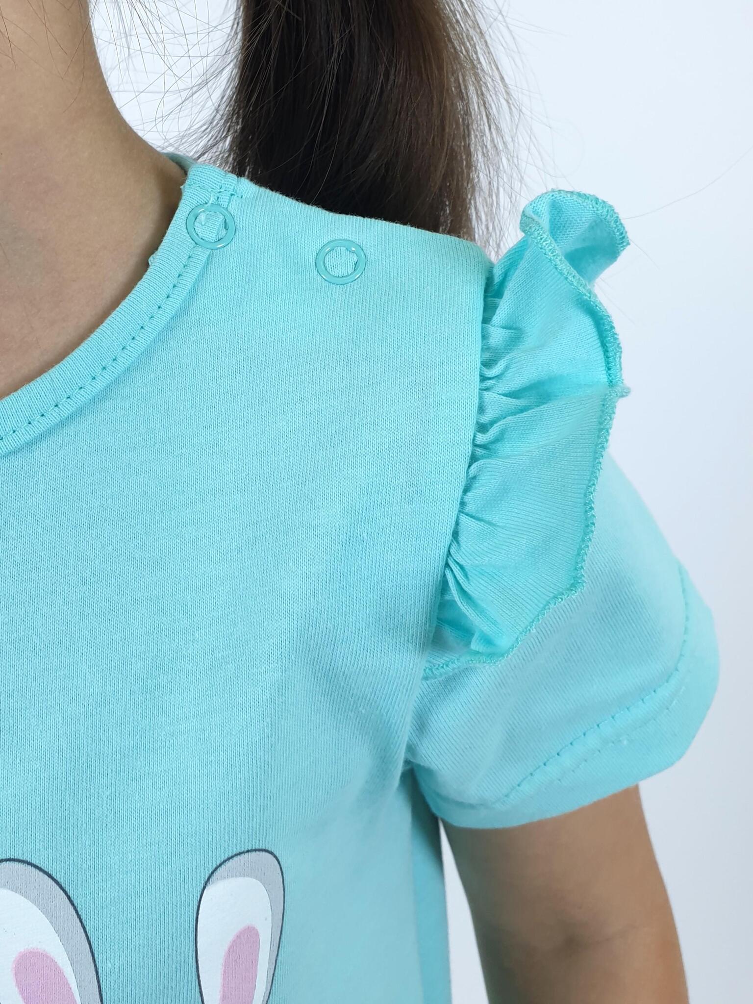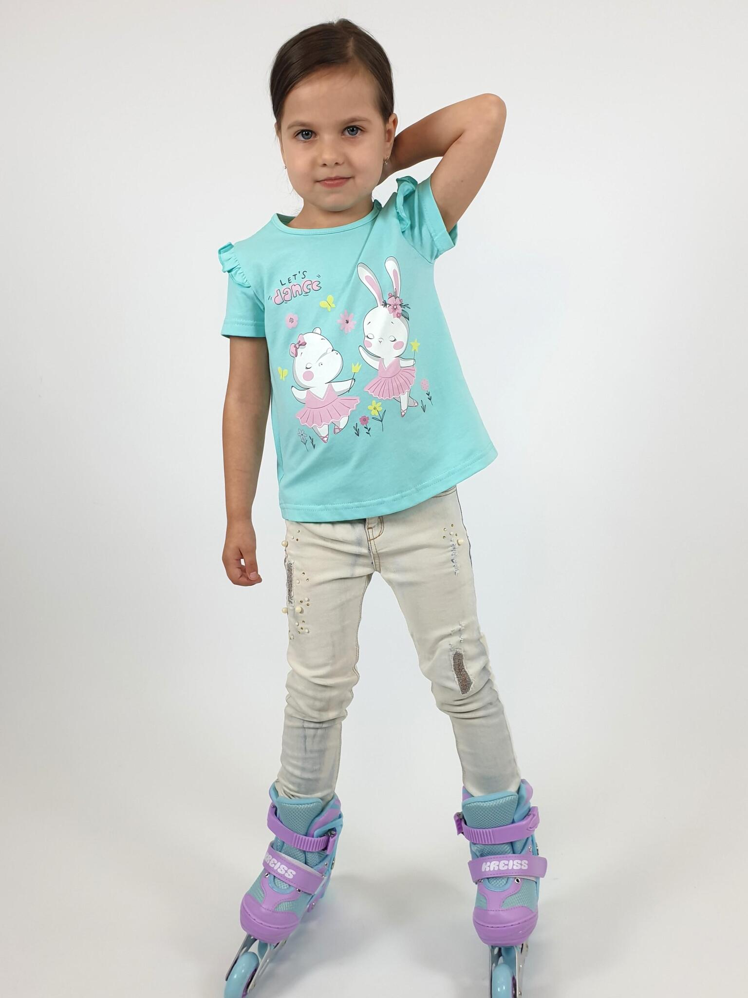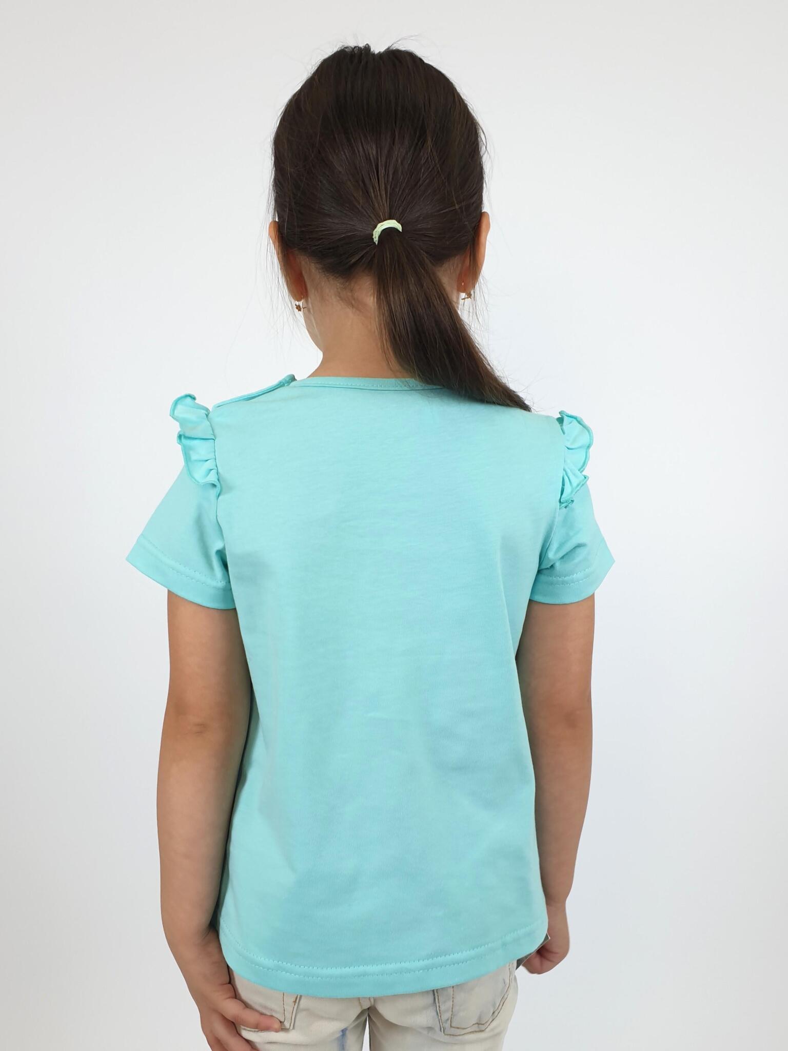 Фуфайка-силуэт трапеция,короткий втачной рукав,в пройме рюша..Горловина окантована,застежка в плечевом шве на кнопки.Печать на переде.
