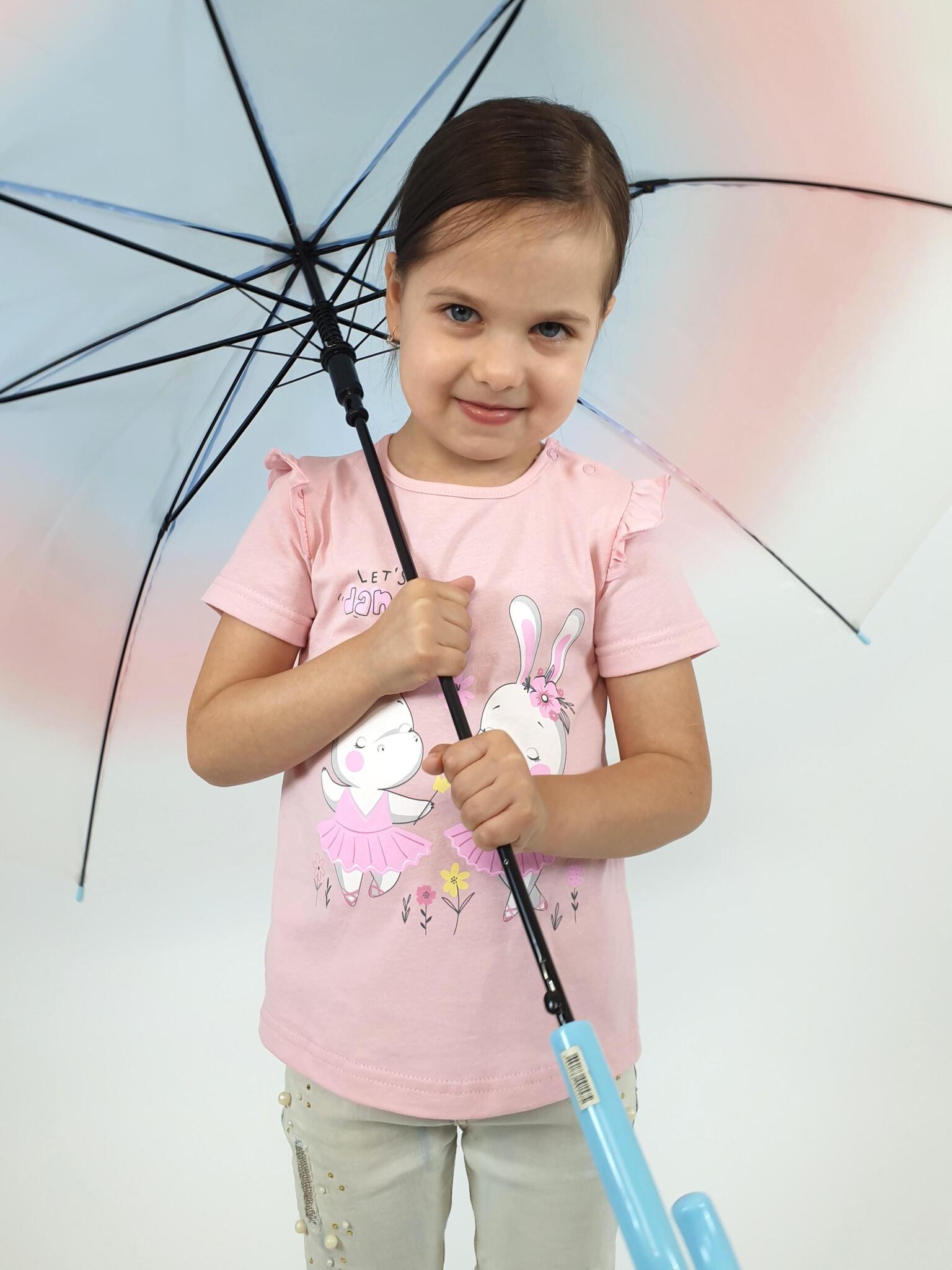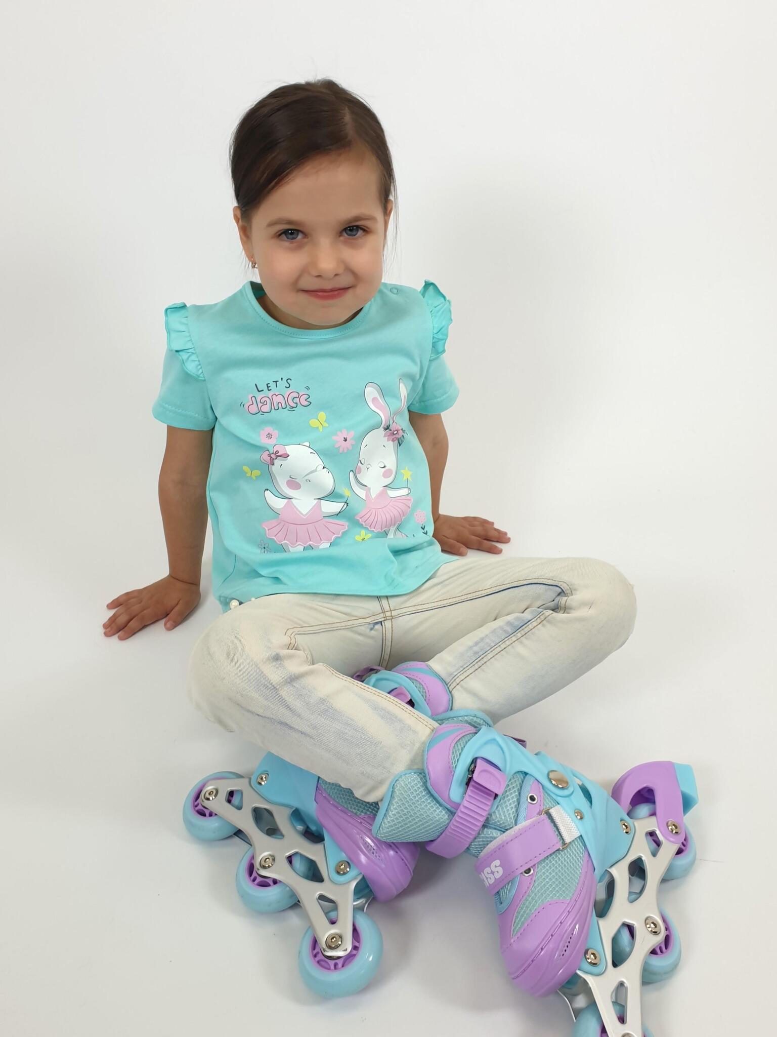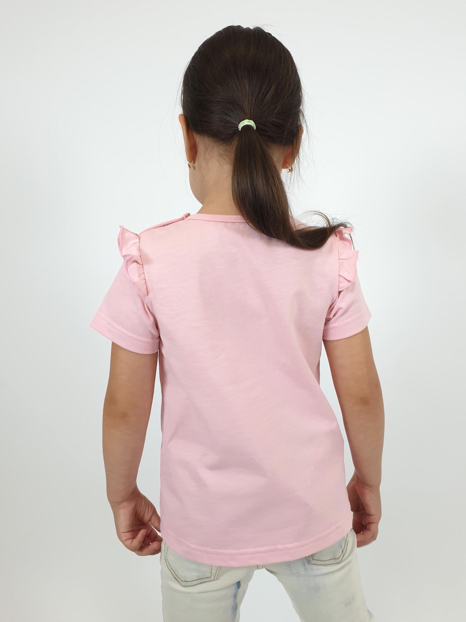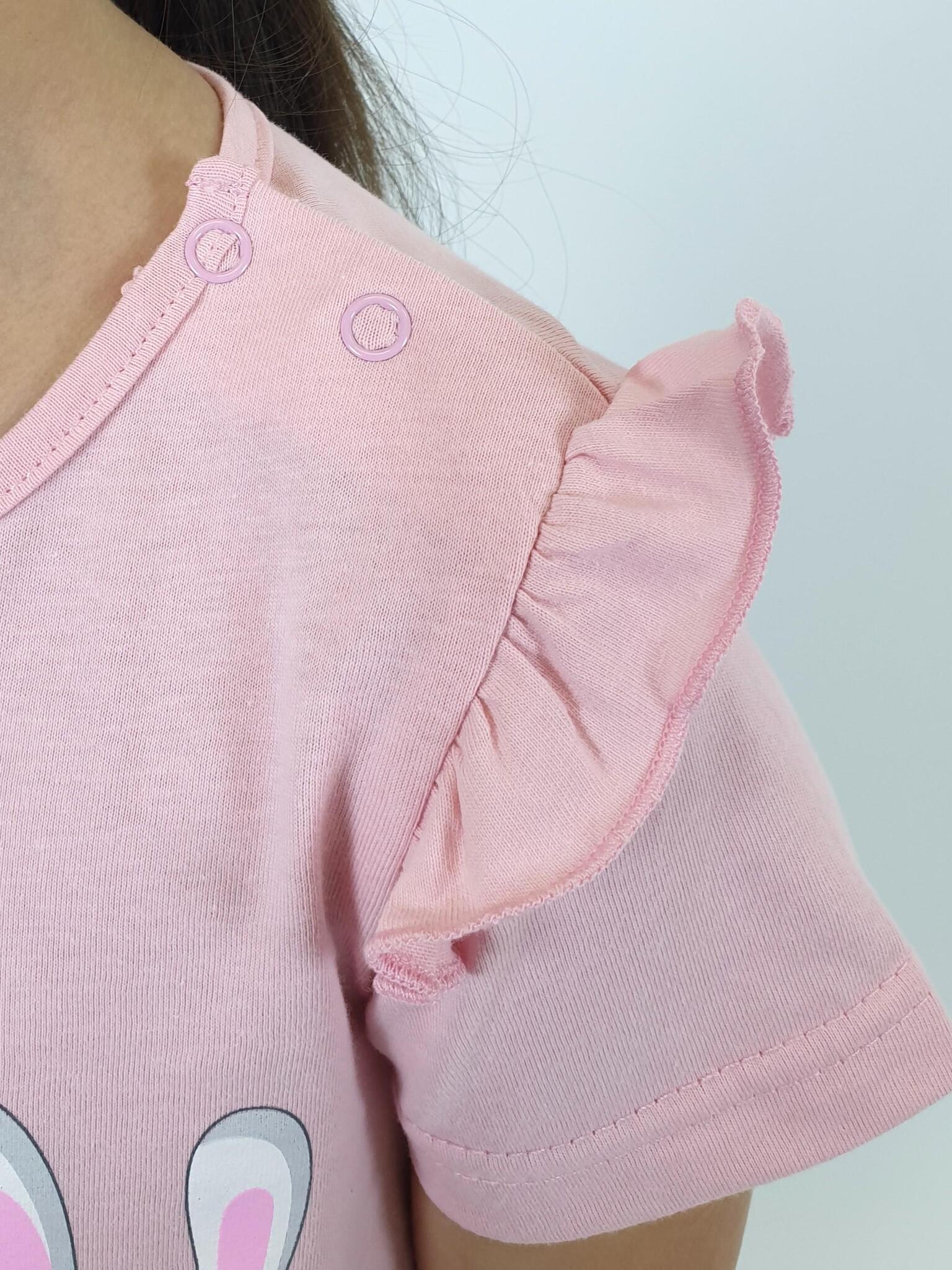 Фуфайка-силуэт трапеция,короткий втачной рукав,в пройме рюша..Горловина окантована,застежка в плечевом шве на кнопки.Печать на переде.