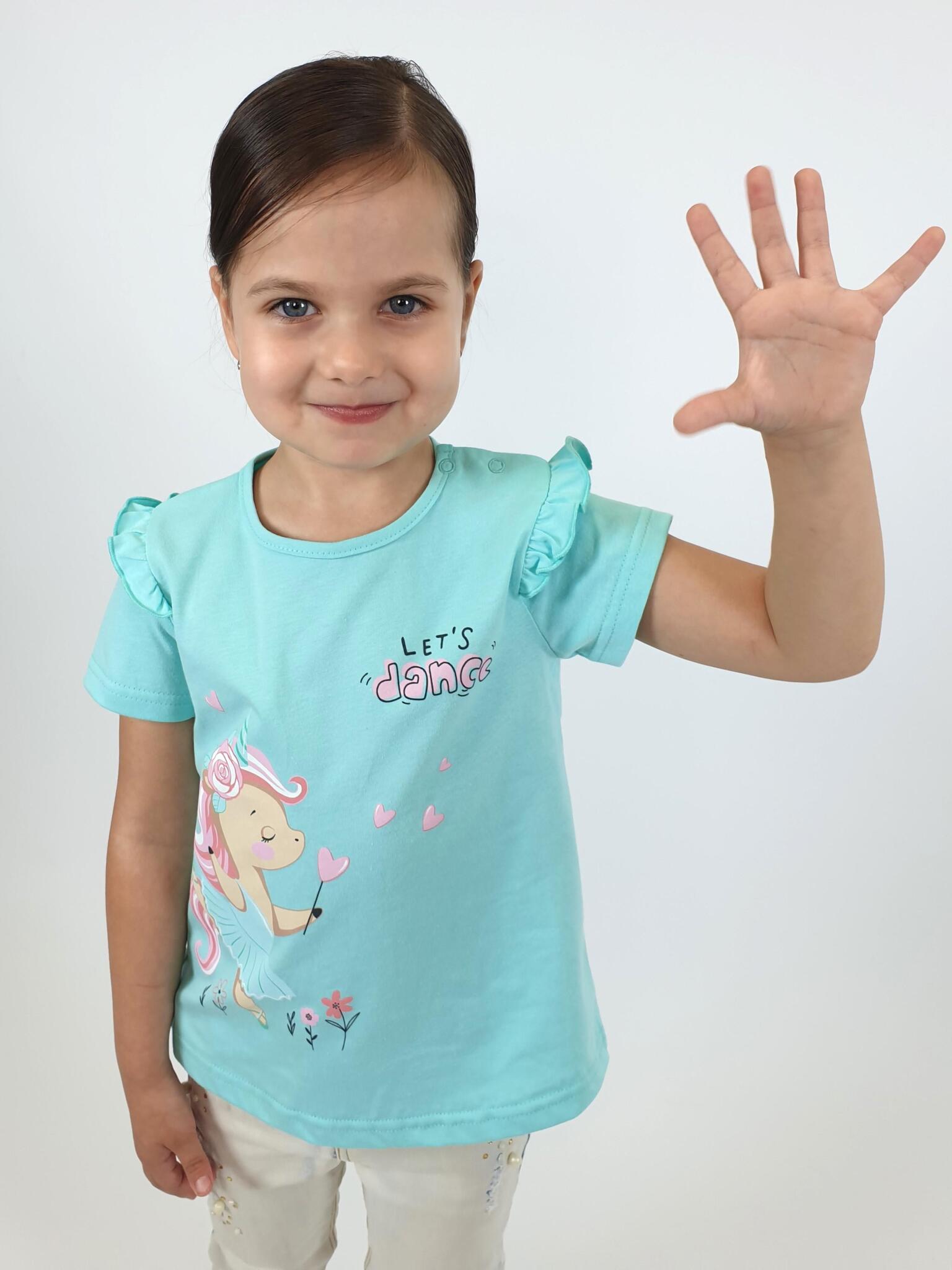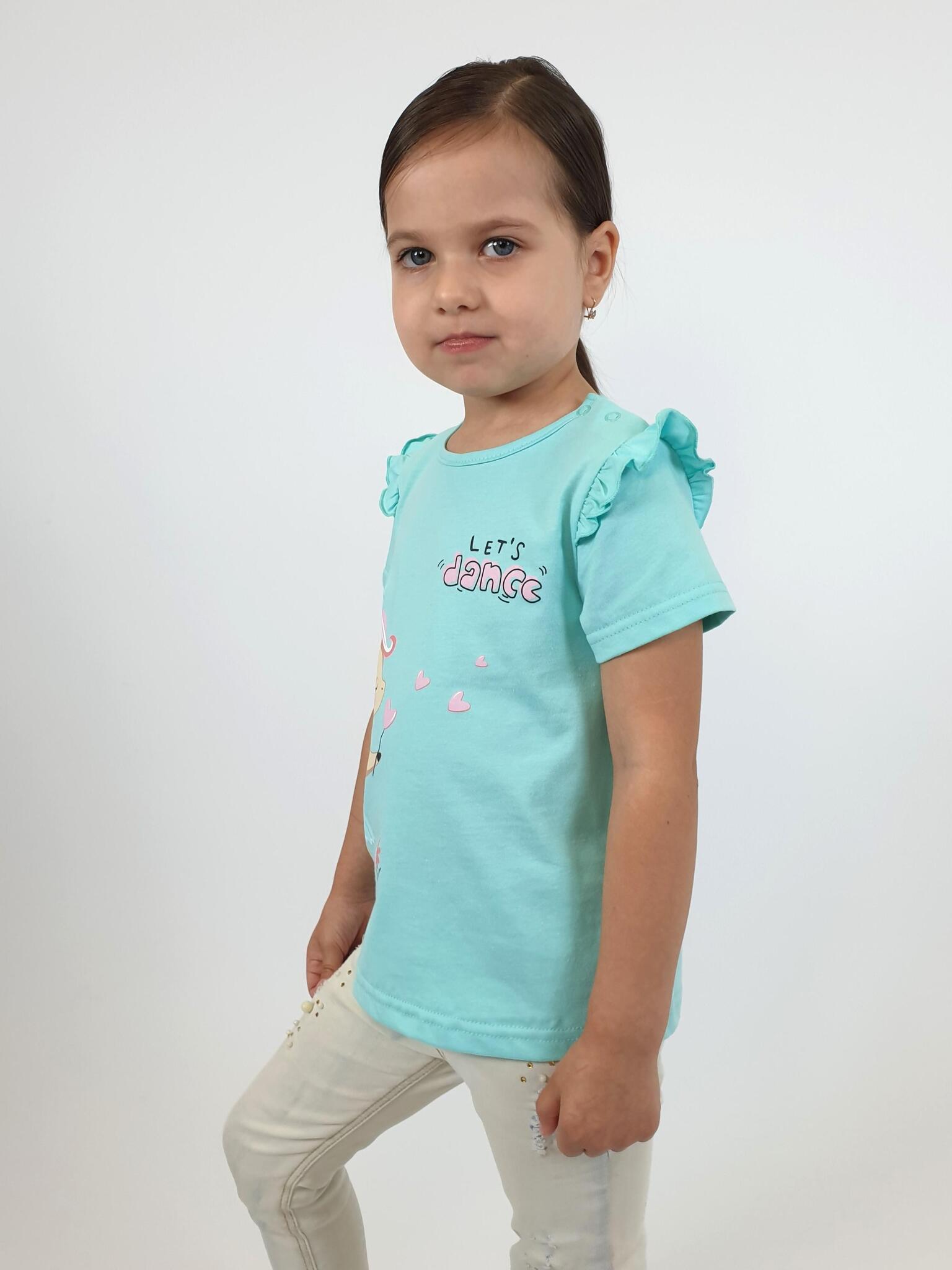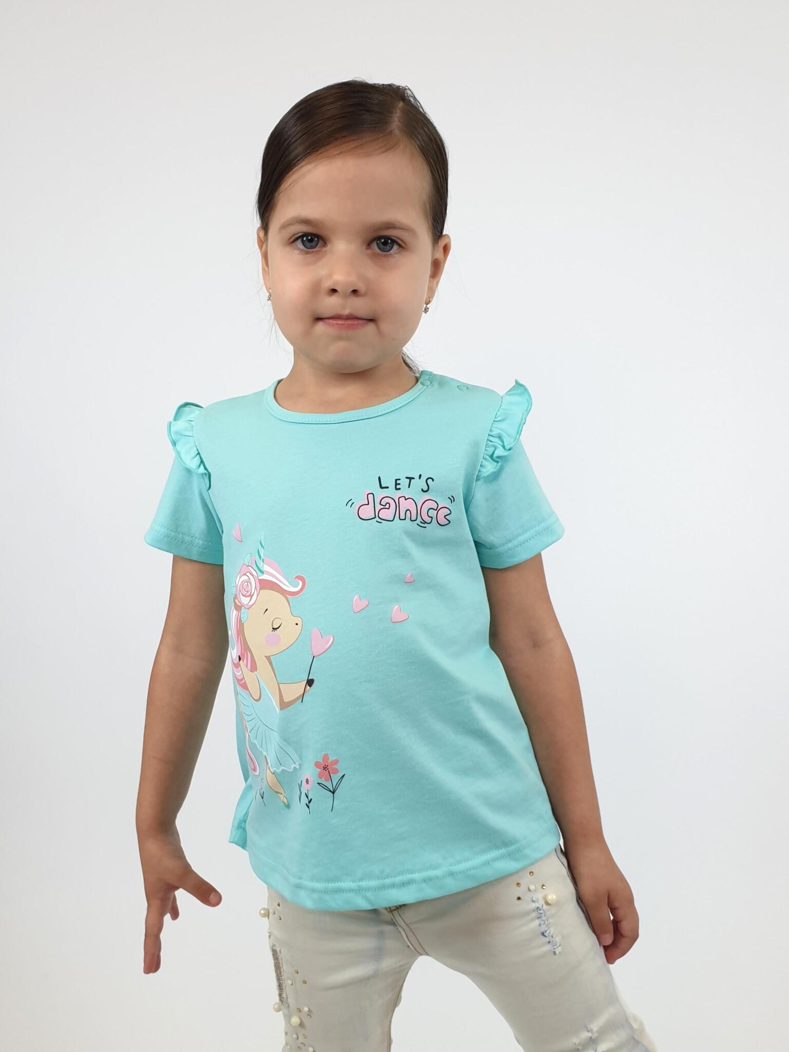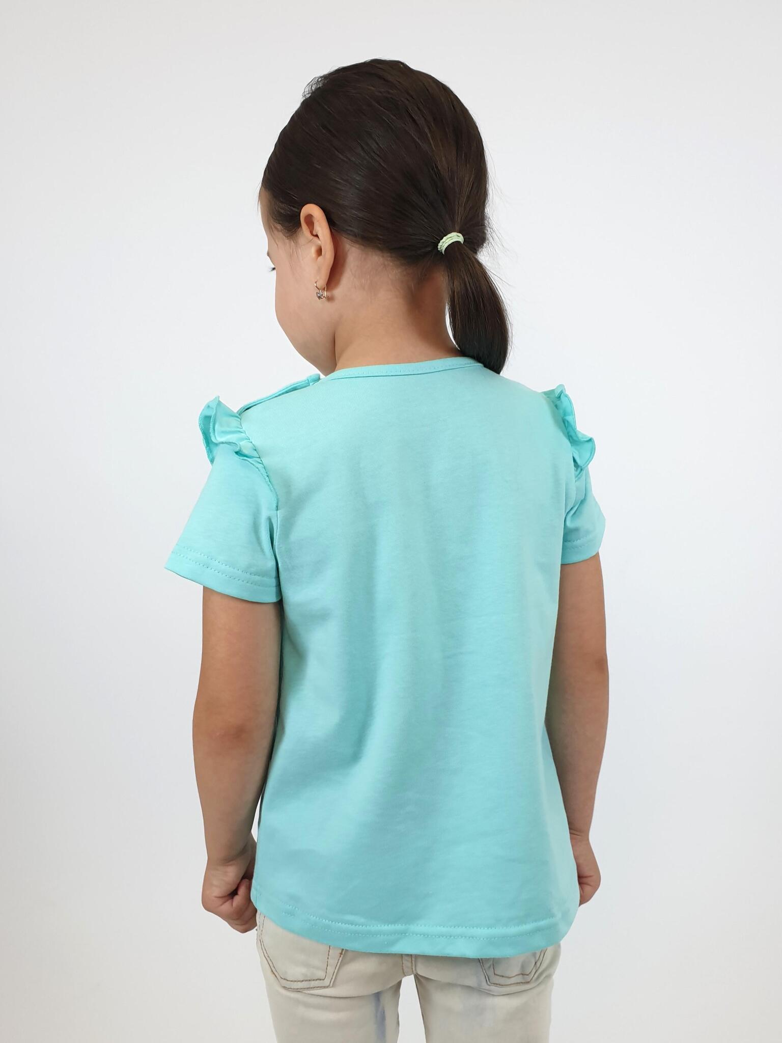 Кулирное полотно:100% х/б. Фуфайка-силуэт трапеция,короткий втачной рукав,в пройме рюша. Горловина окантована,застежка в плечевом шве на кнопки.Печать на переде.
