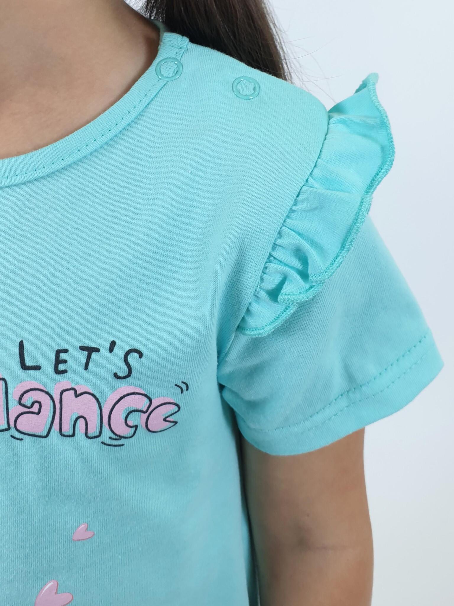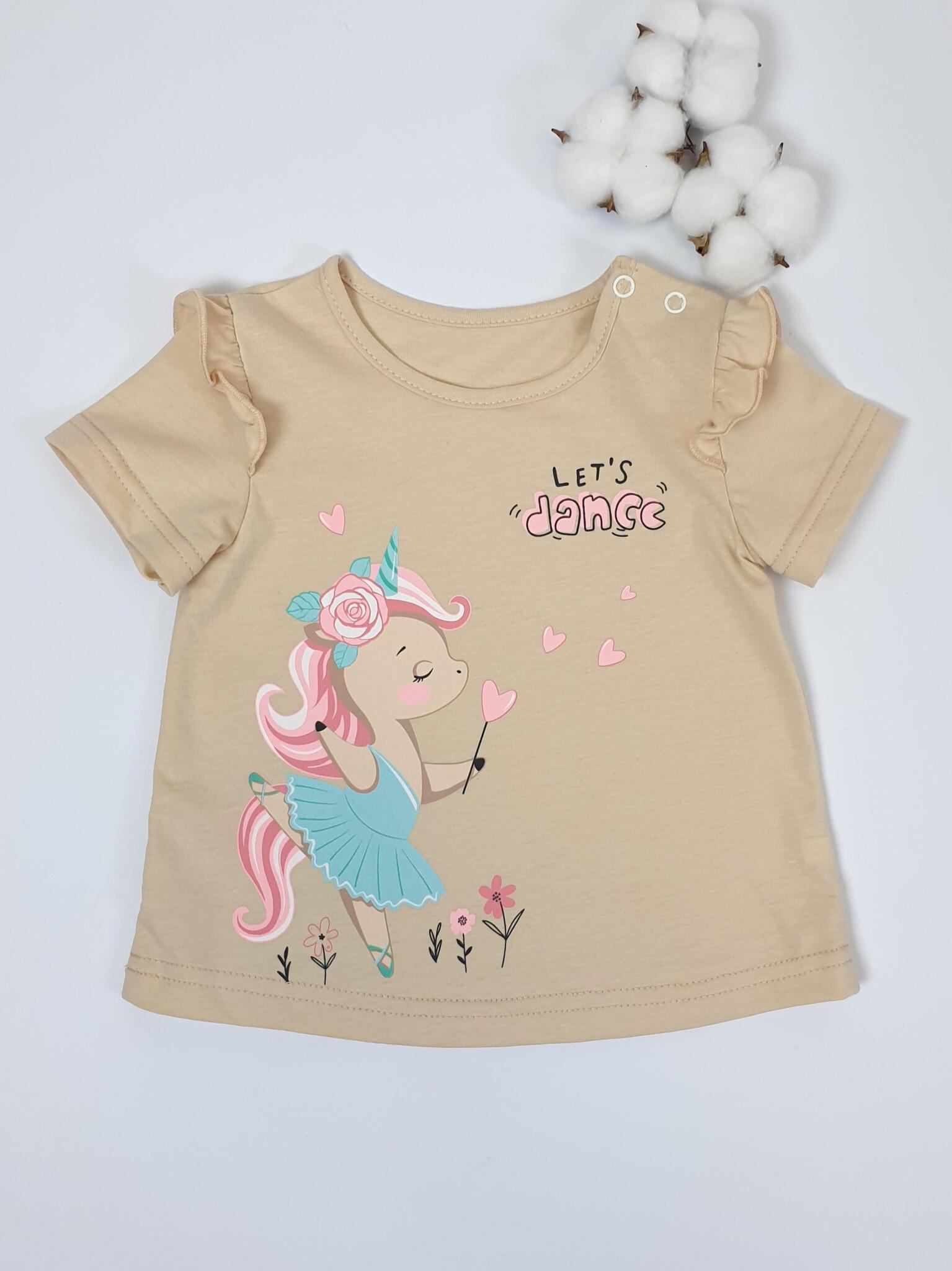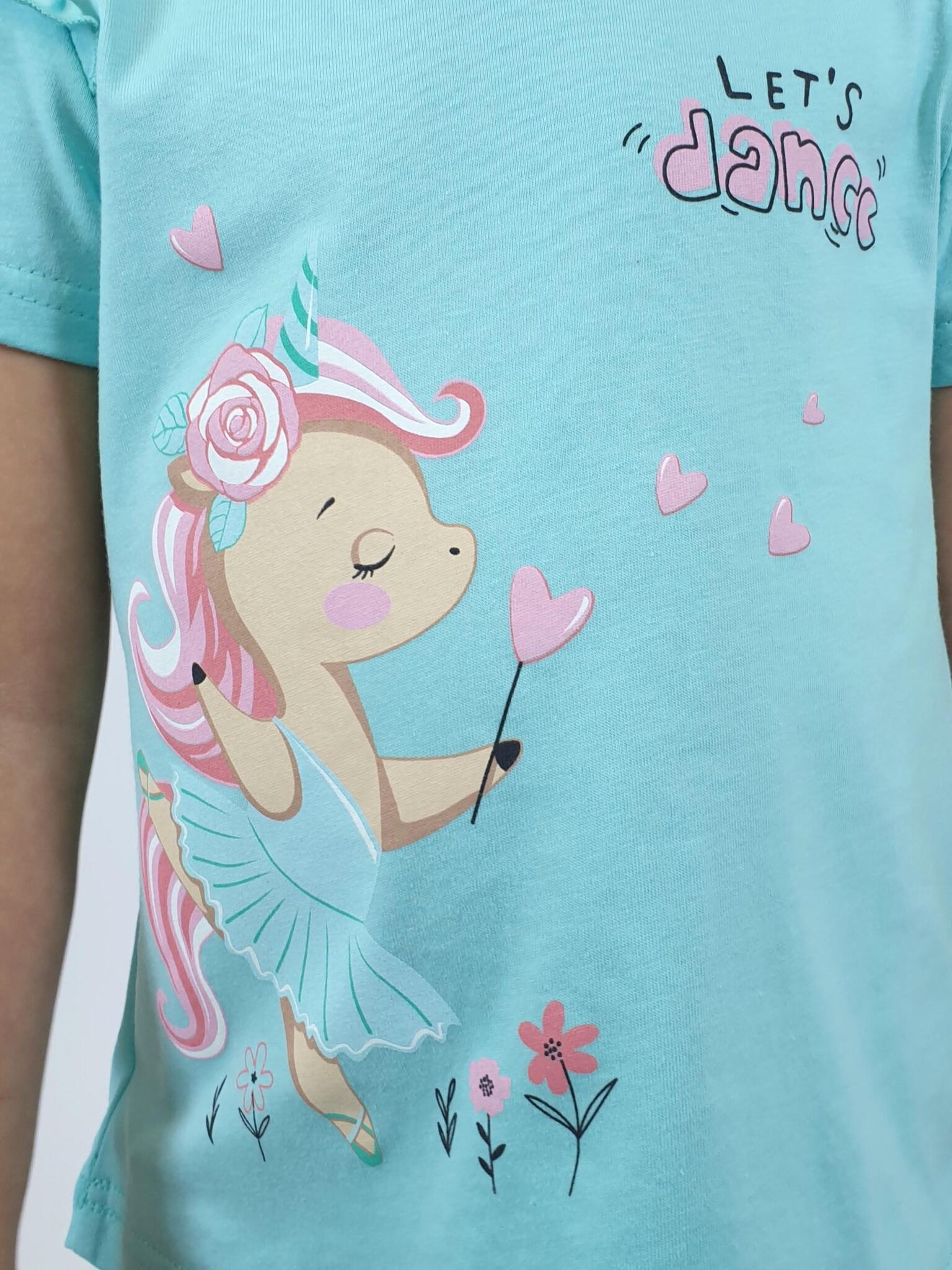 Кулирное полотно:100% х/б. Фуфайка-силуэт трапеция,короткий втачной рукав,в пройме рюша. Горловина окантована,застежка в плечевом шве на кнопки.Печать на переде.