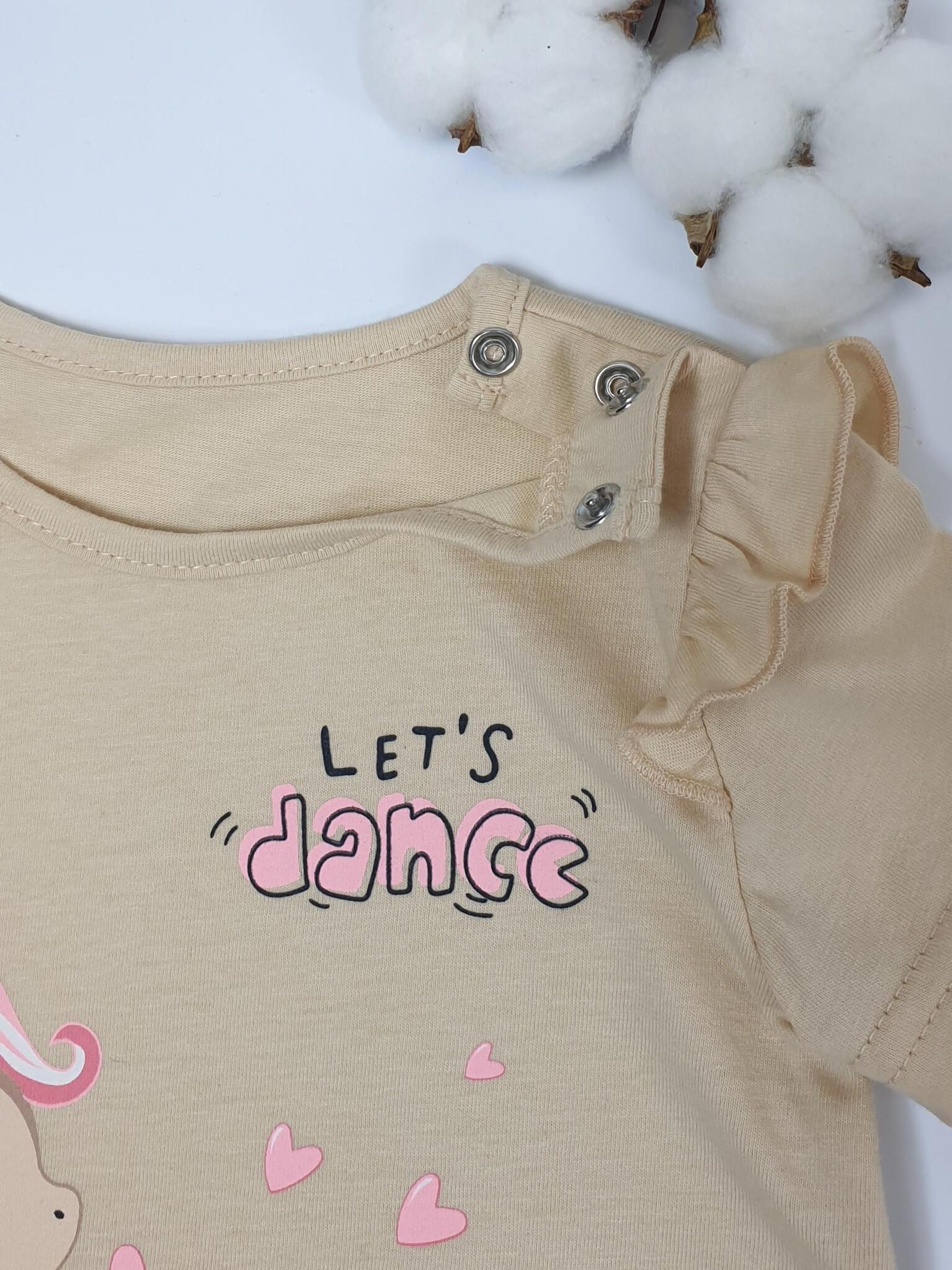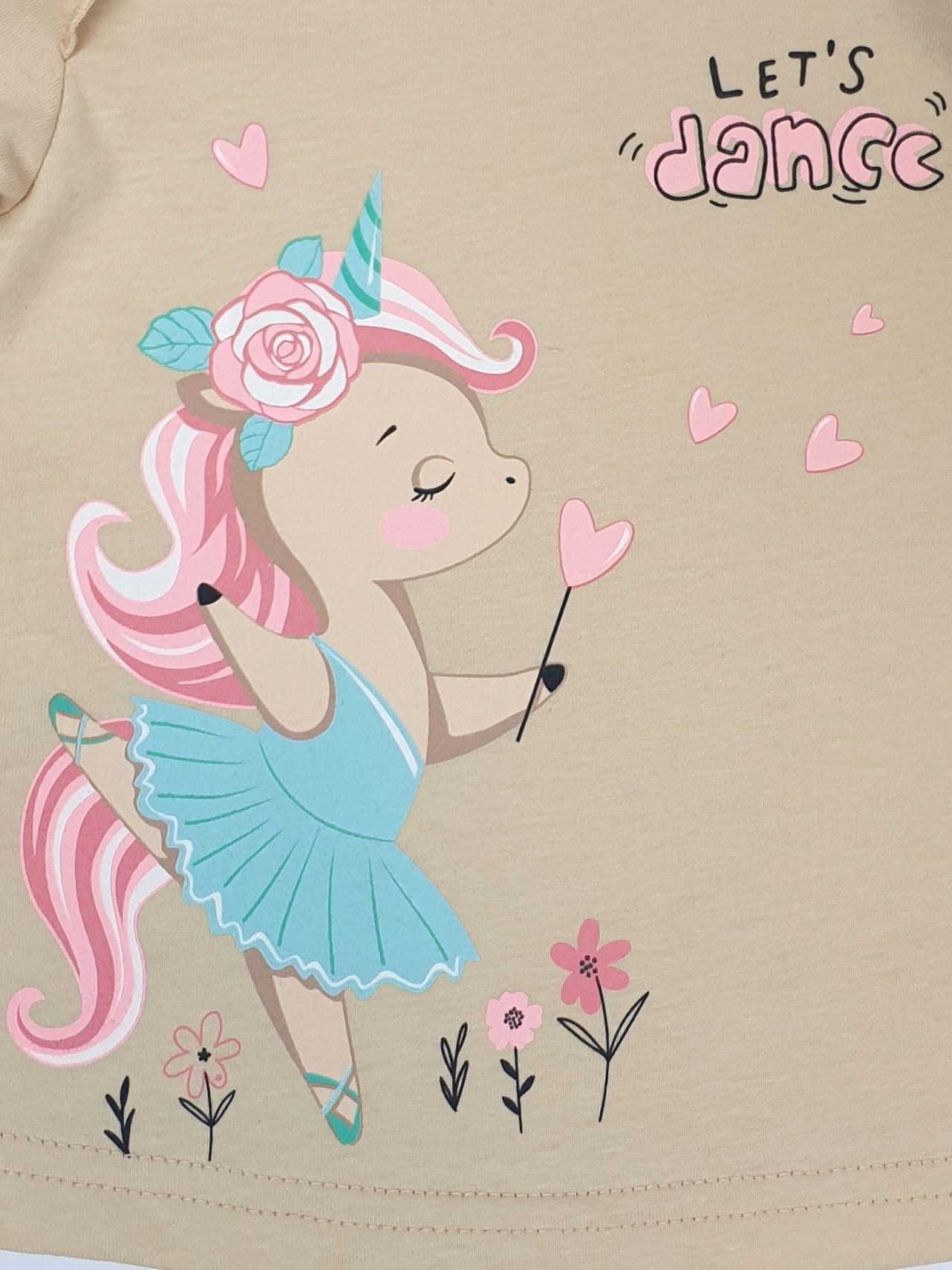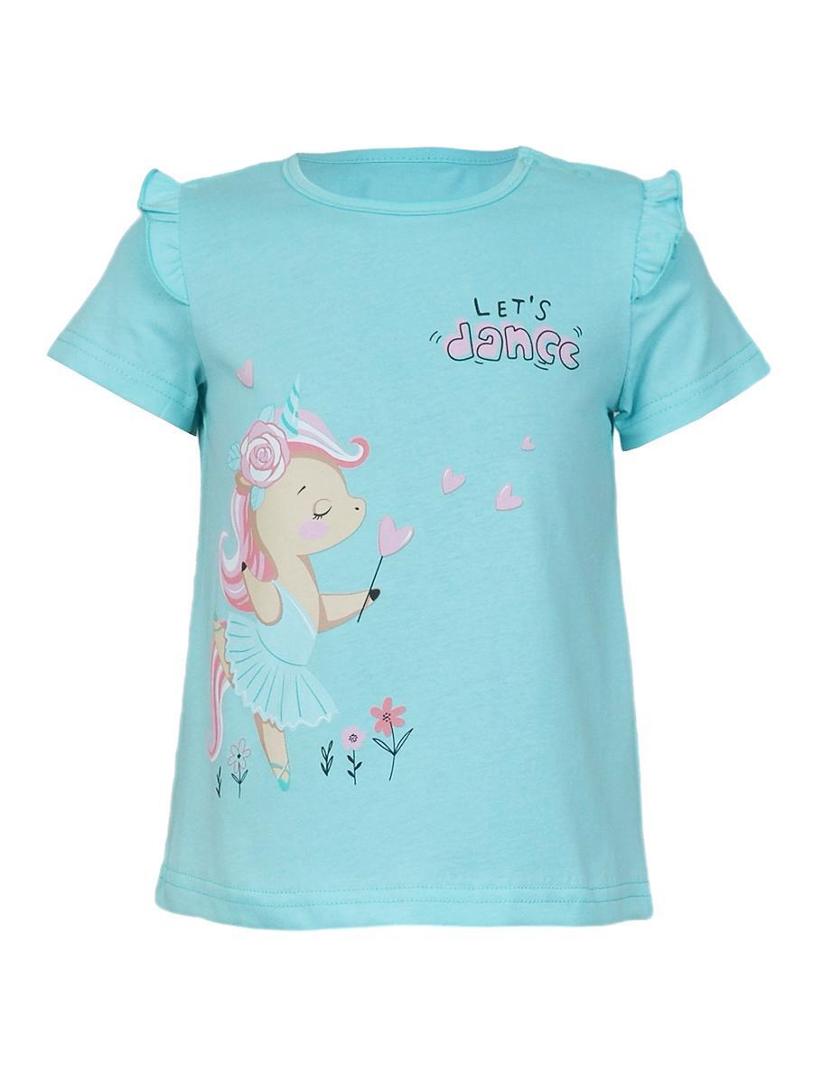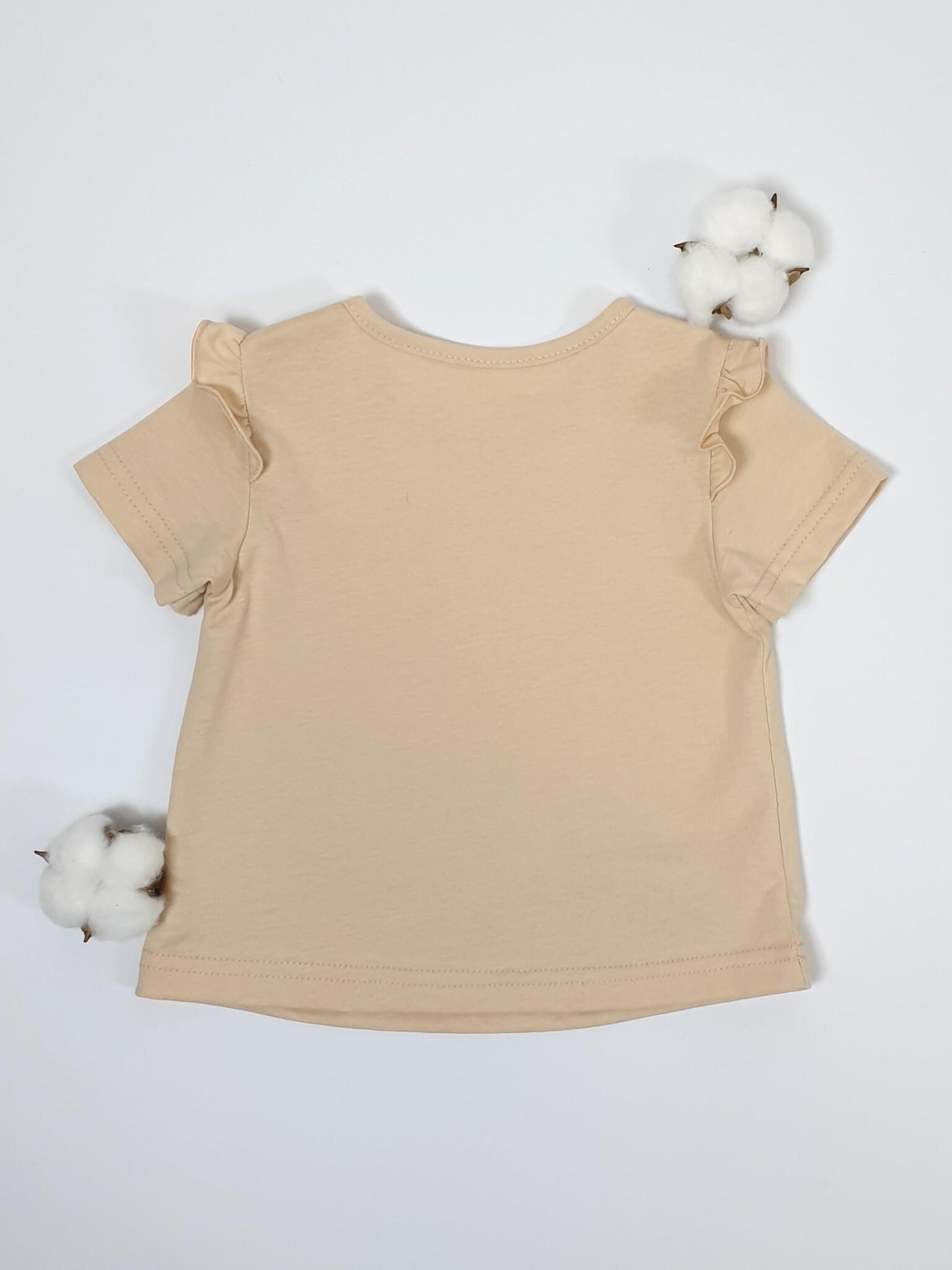 Кулирное полотно:100% х/б. Фуфайка-силуэт трапеция,короткий втачной рукав,в пройме рюша. Горловина окантована,застежка в плечевом шве на кнопки.Печать на переде.