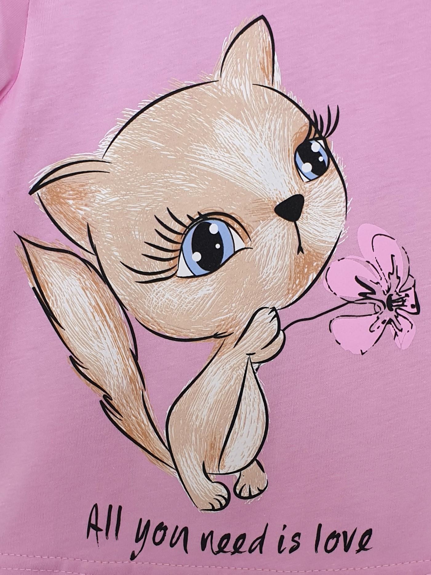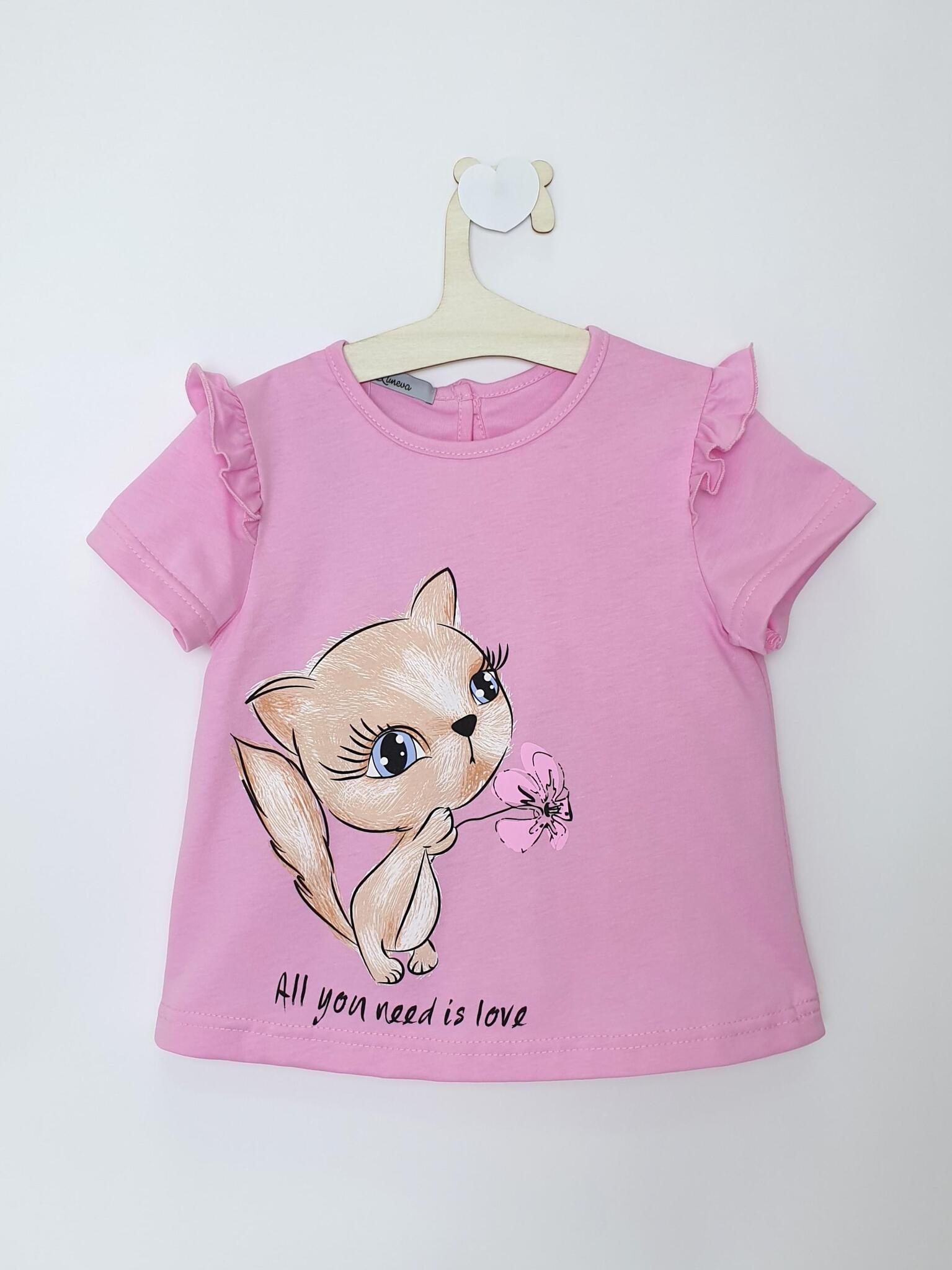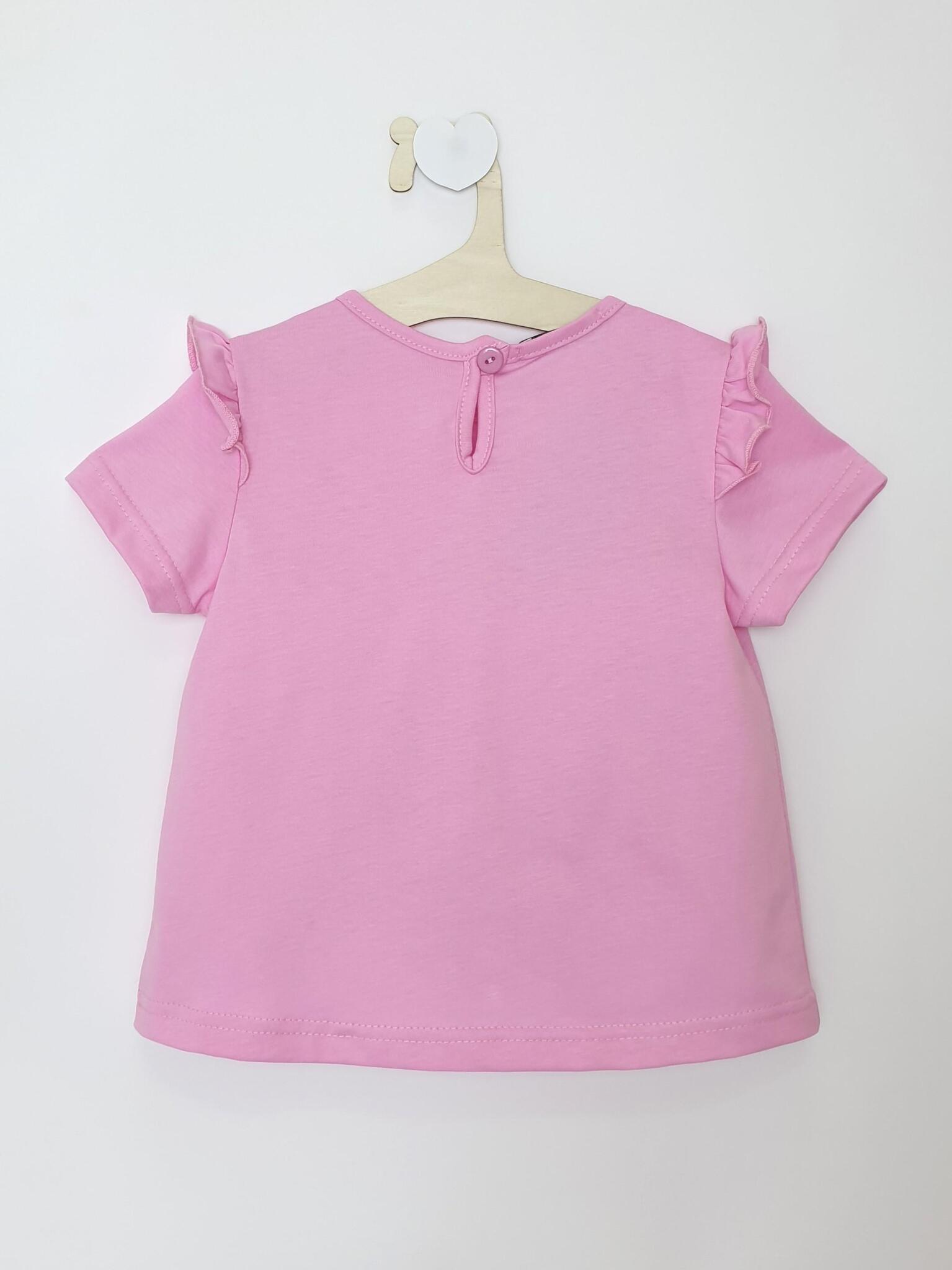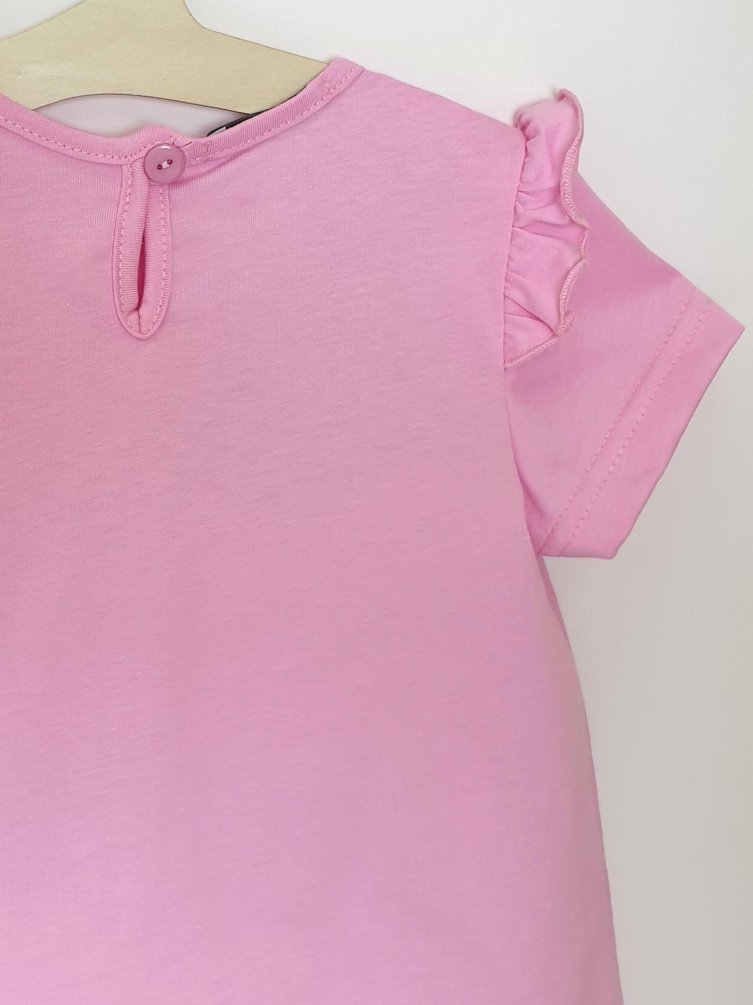 Кулирное полотно: 100% х/б. Фуфайка-силуэт трапеция,короткий втачной рукав,в пройме рюша.Горловина окантована,застежка на пуговицу по спинке.Печать на переде..