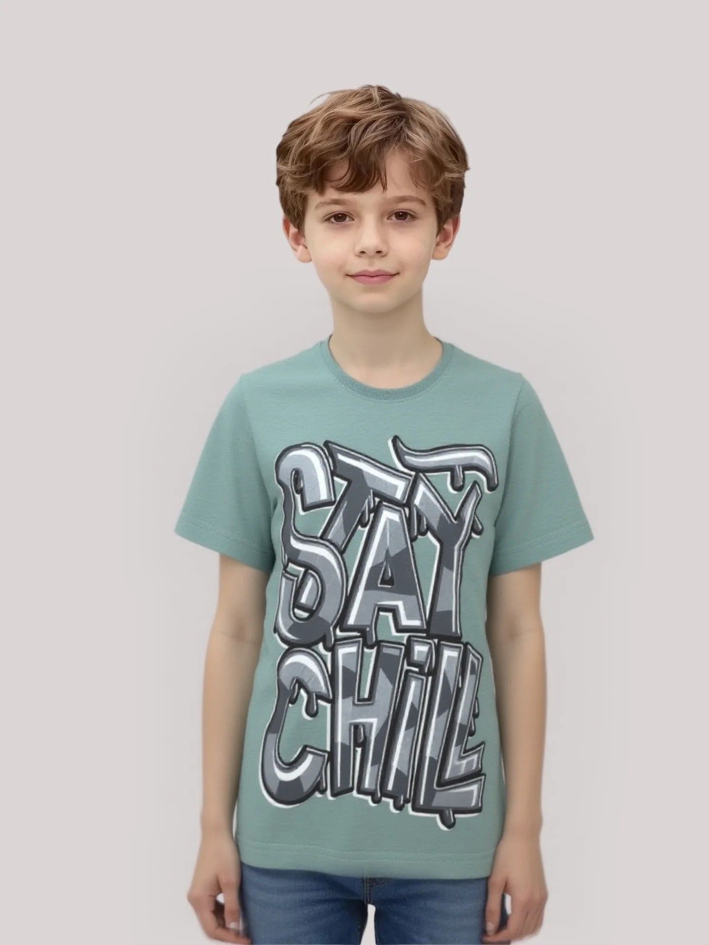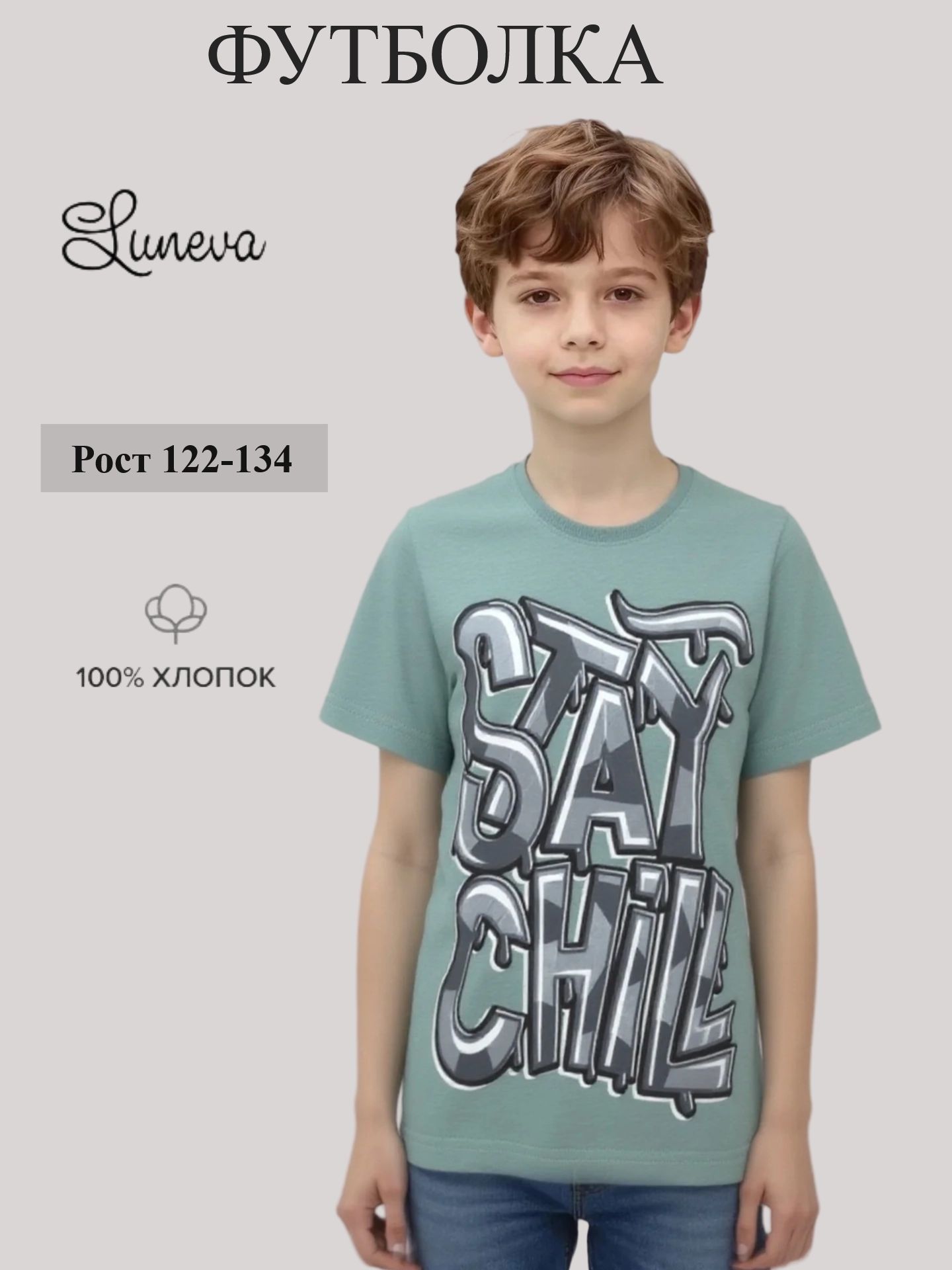 Футболка-прямого силуэта,перед с печатью.Рукав втачной короткий. Горловина обработана ластиком.Низ изделия и рукава подшиты.