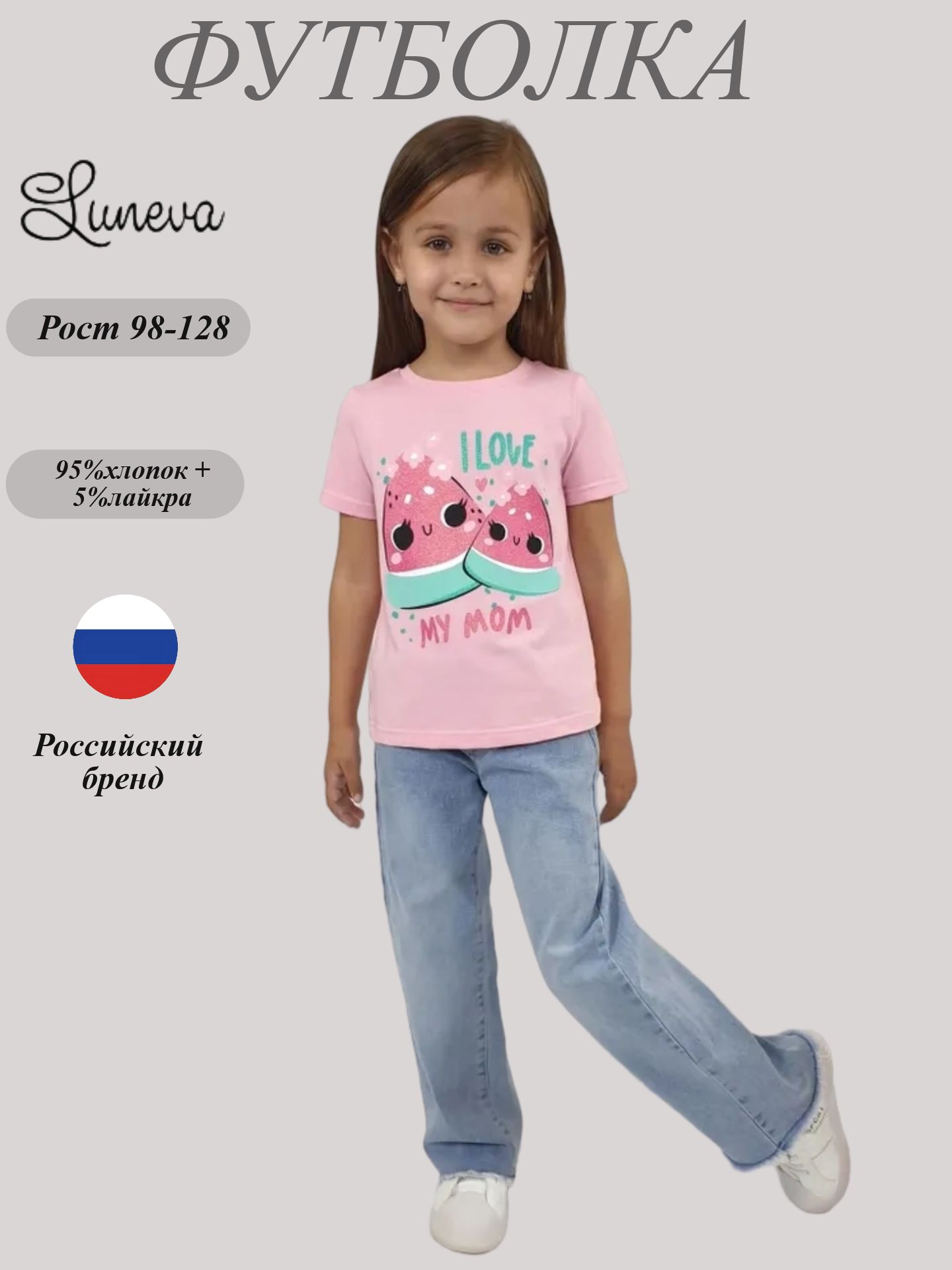 Кулирное полотно:95% х/б,5% лайкра. Фуфайка-прямой силуэт,печать на переде,короткий втачной рукав.Низ рукава и фуфайки подшит.Горловина обработана ластиком.