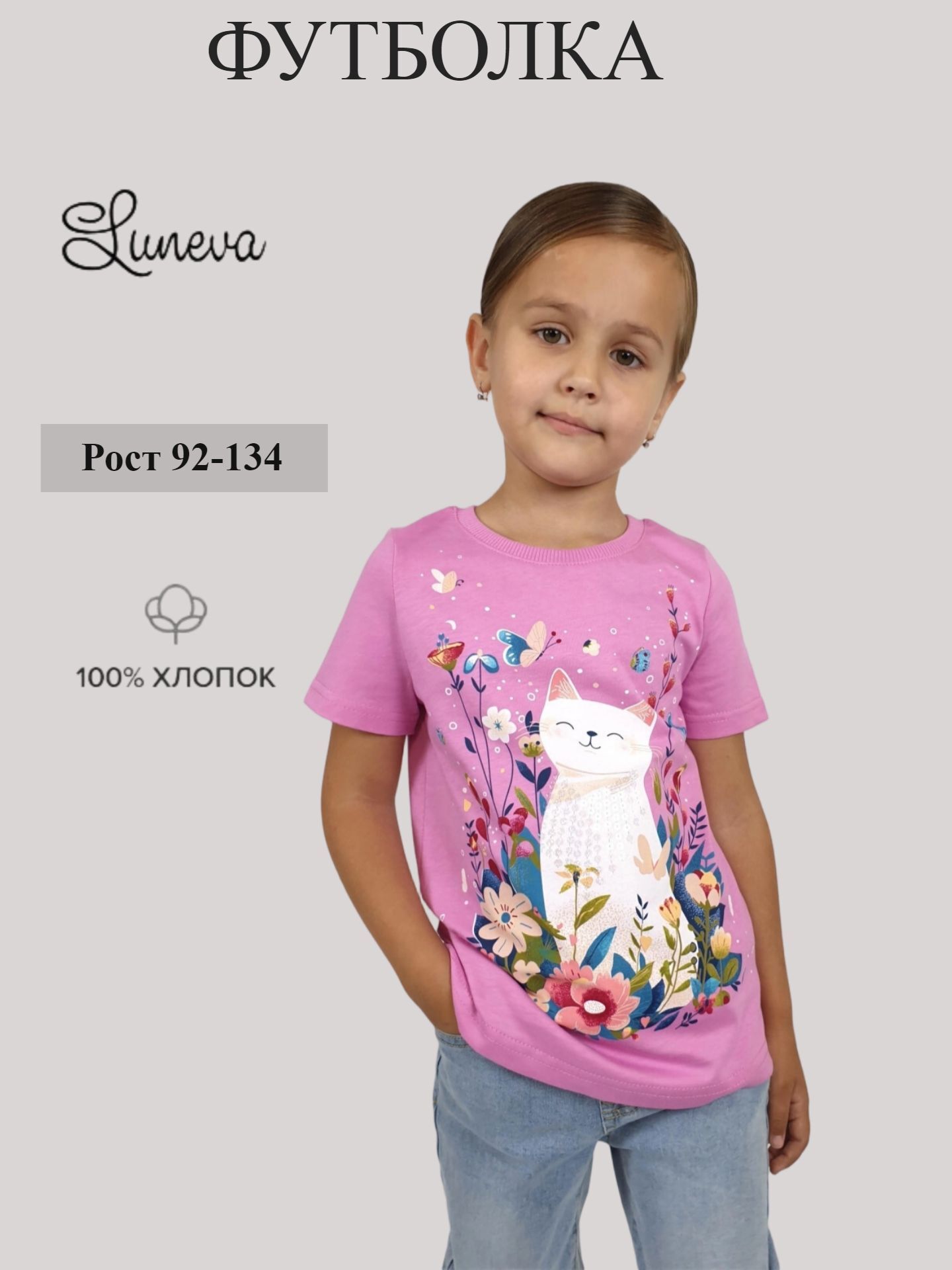 Кулирное полотно:100% х/б. Фуфайка-прямой силуэт,печать и вышивка(пайетки) на переде,короткий втачной рукав.Низ рукава и фуфайки подшит.Горловина обработана ластиком.