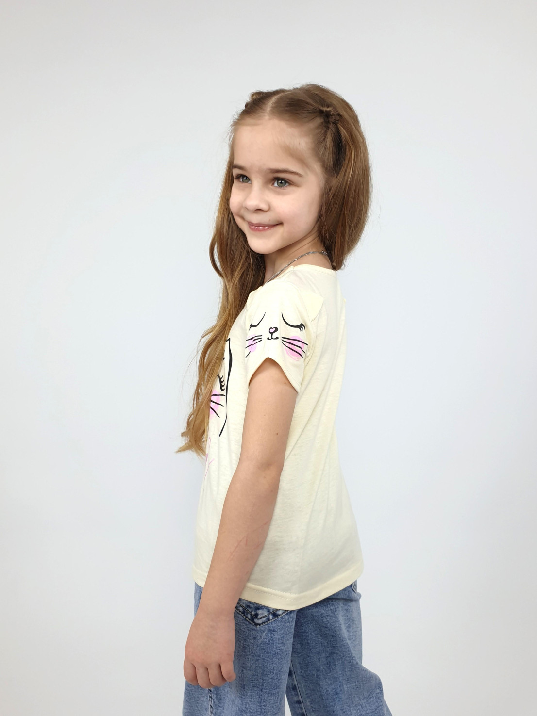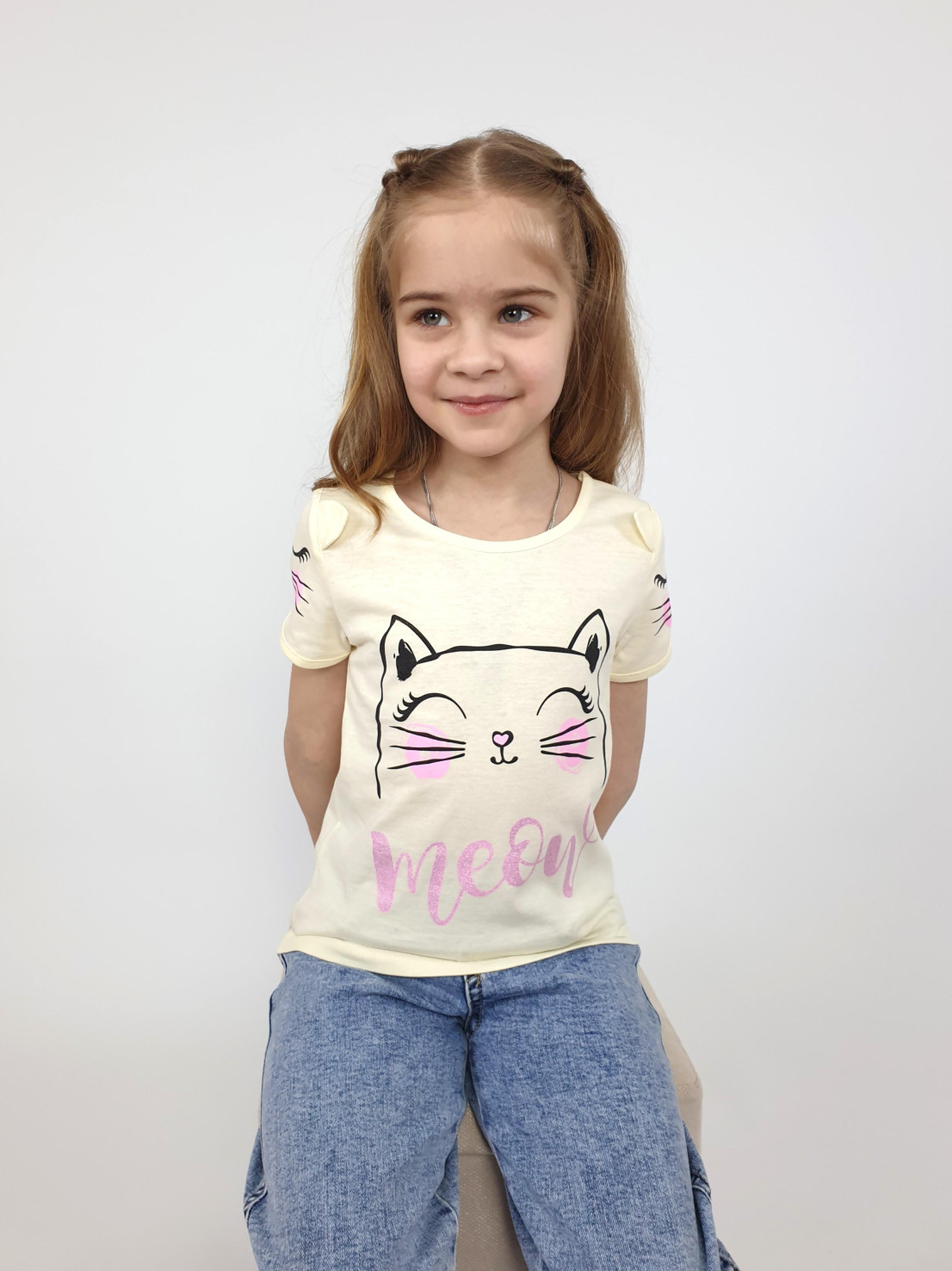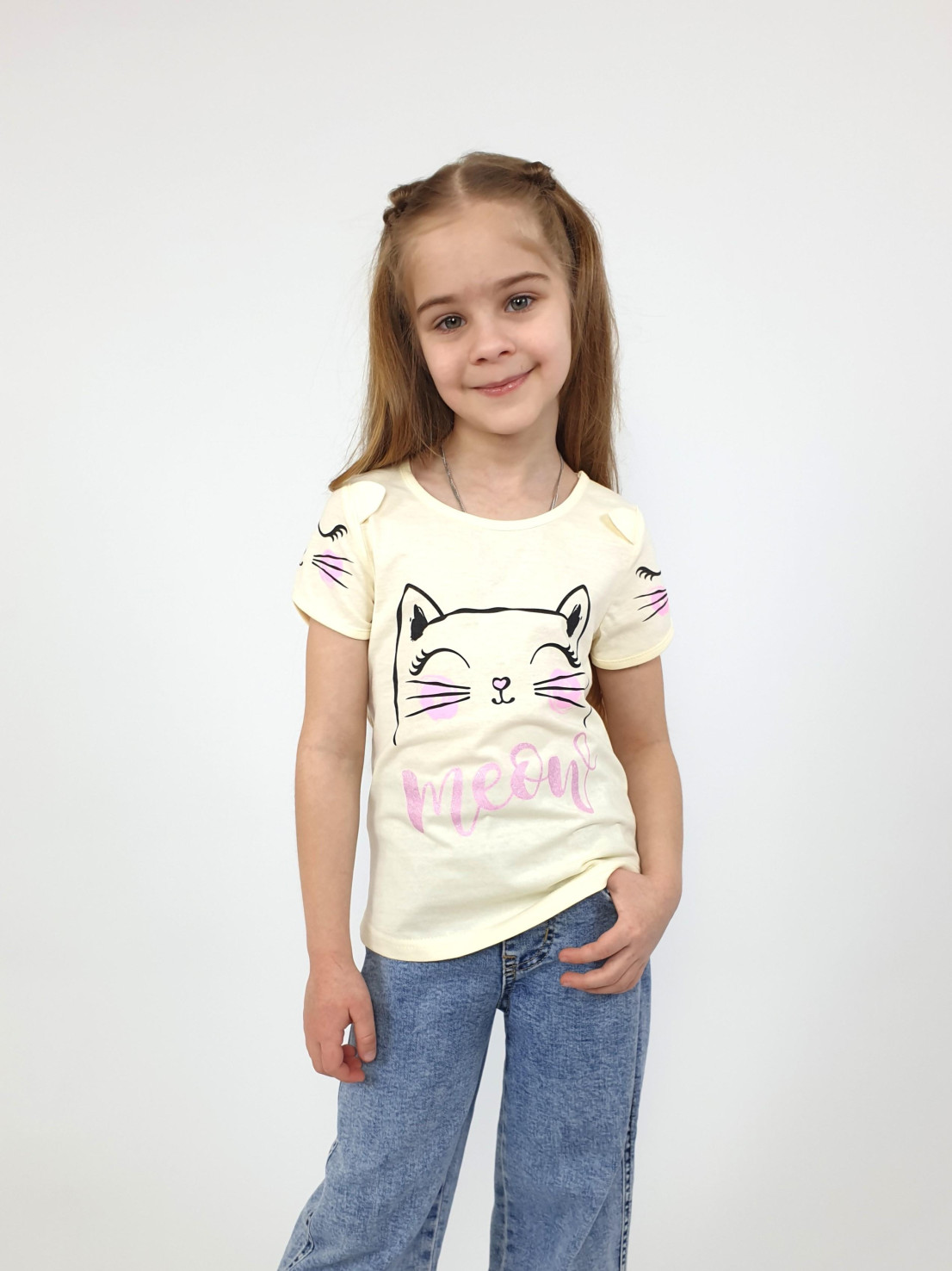 Кулирное полотно:100% х/б. Фуфайка-прямого силуэта,перед и рукава с печатью.Рукав втачной,короткий,с отделочными "ушками".Горловина и низ окантованы.