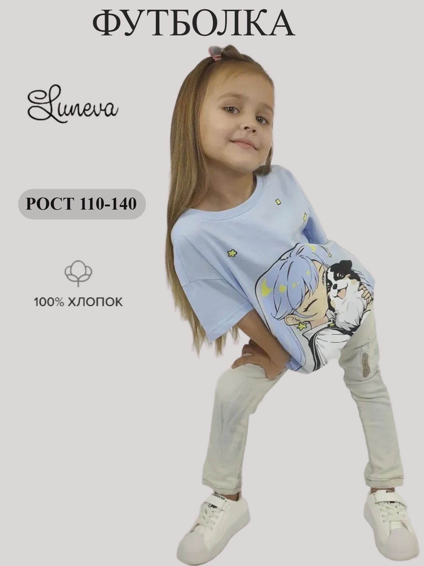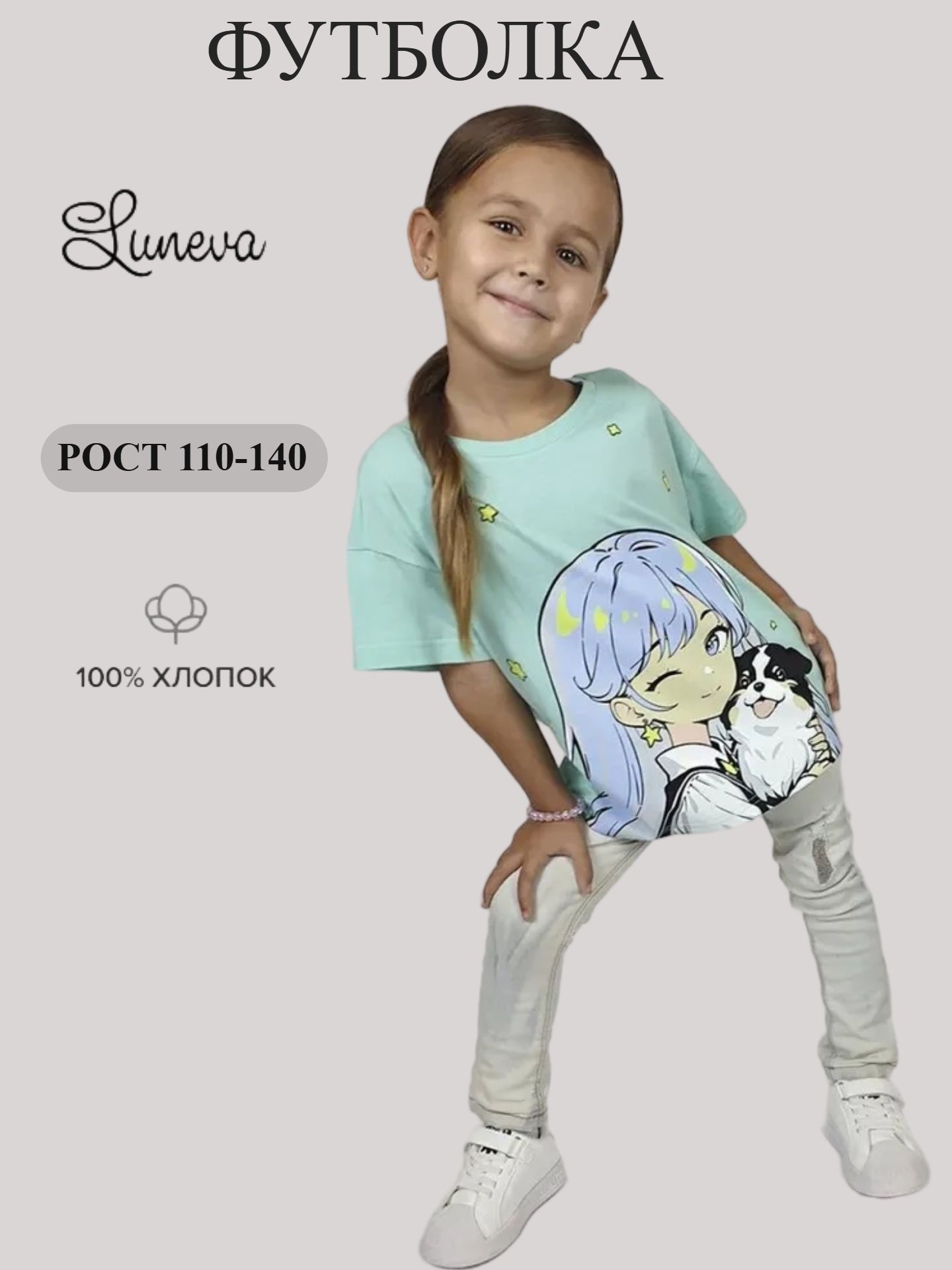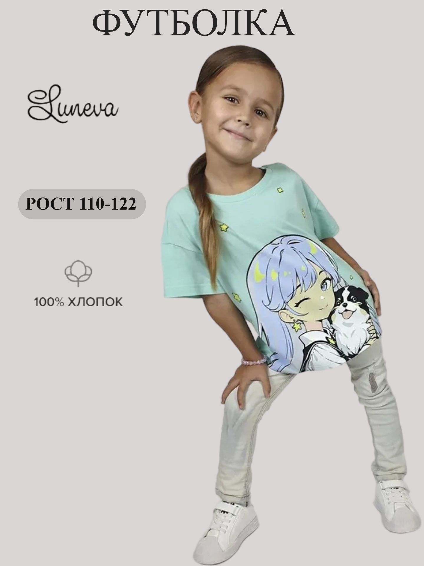 Кулирное полотно: 100% х/б. Футболка(оверсайз)-прямой силуэт,спущенное плечо,короткий рукав,перед с печатью.Горловина обработана притачной планкой.Низ изделия и рукава подшиты.