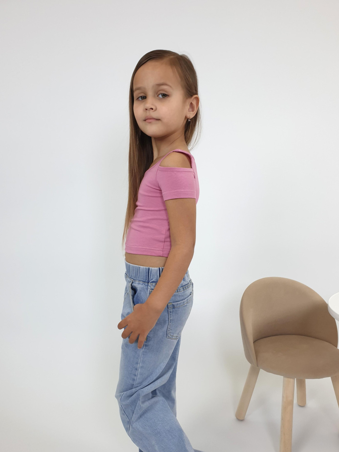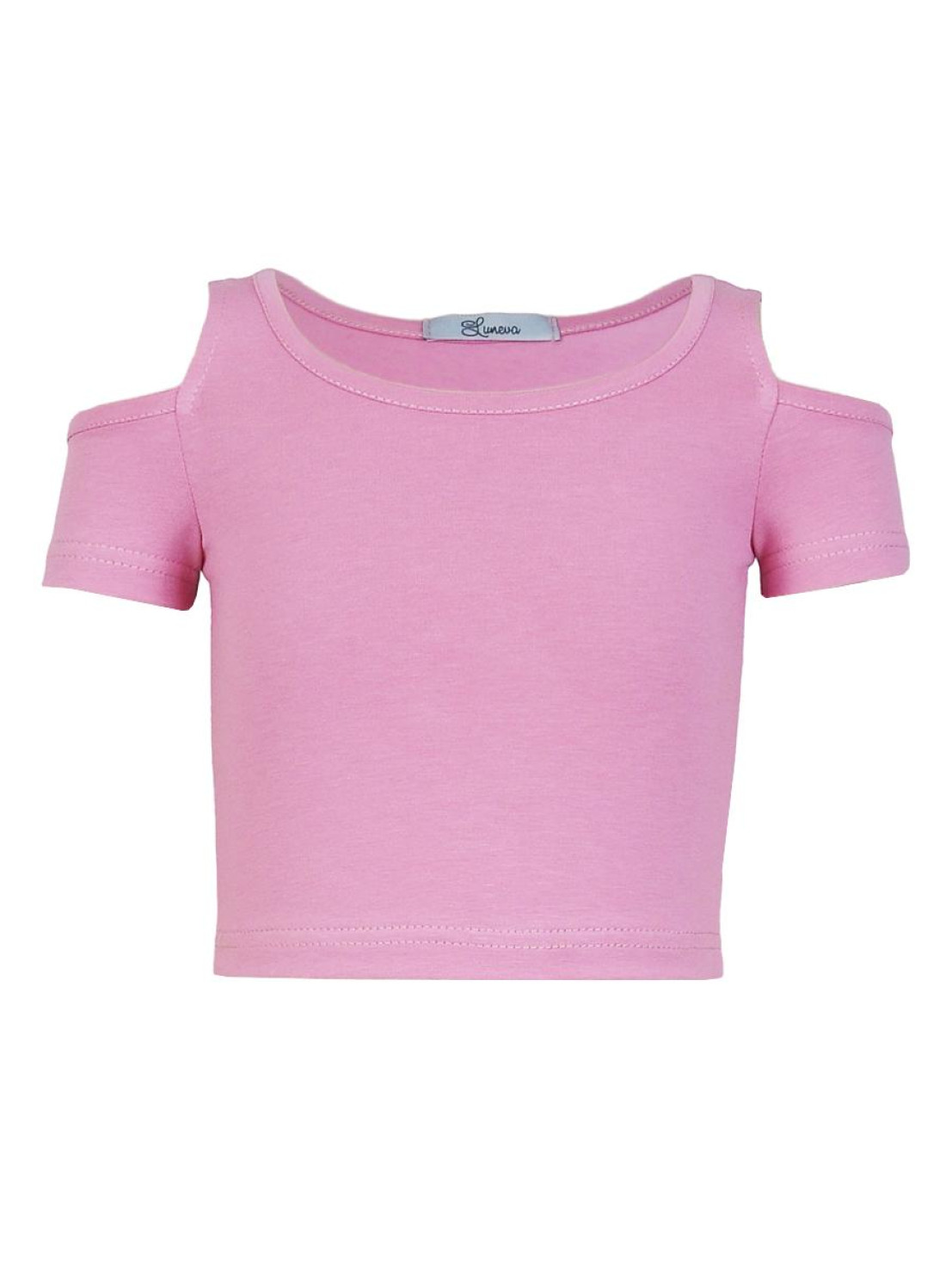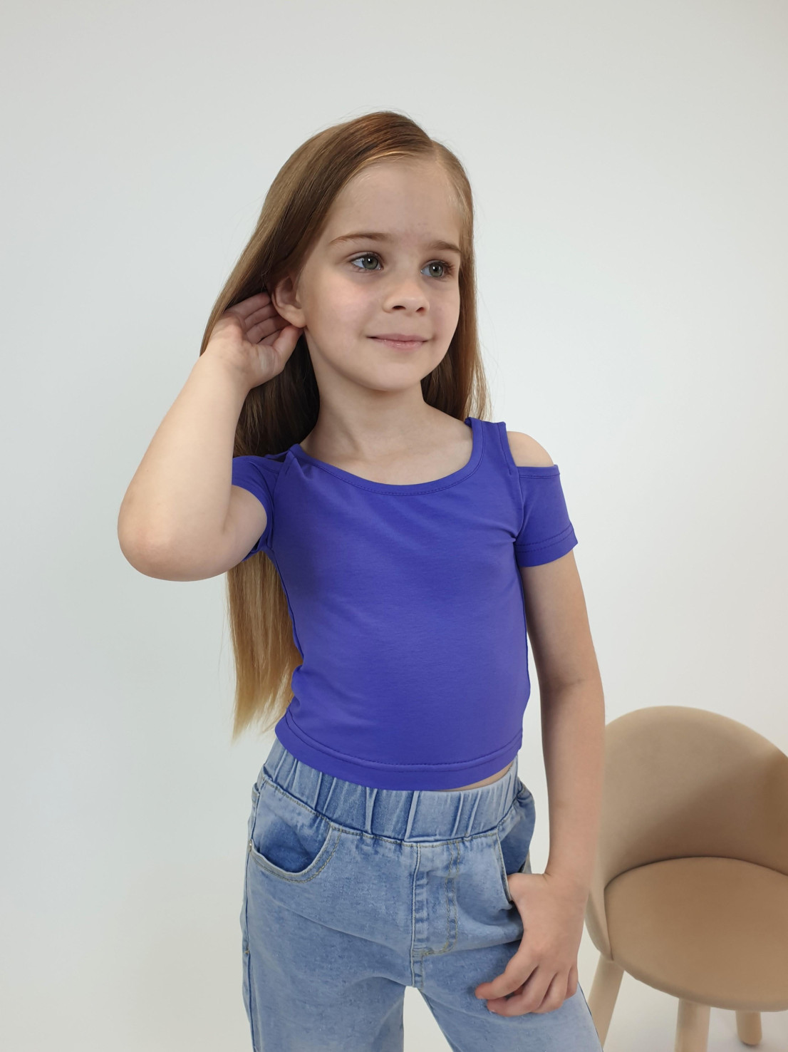 Кулирное полотно: 95% х/б,5% лайкра. Фуфайка-укороченная с коротким рукавом,с вырезом на плече.Горловина окантована.