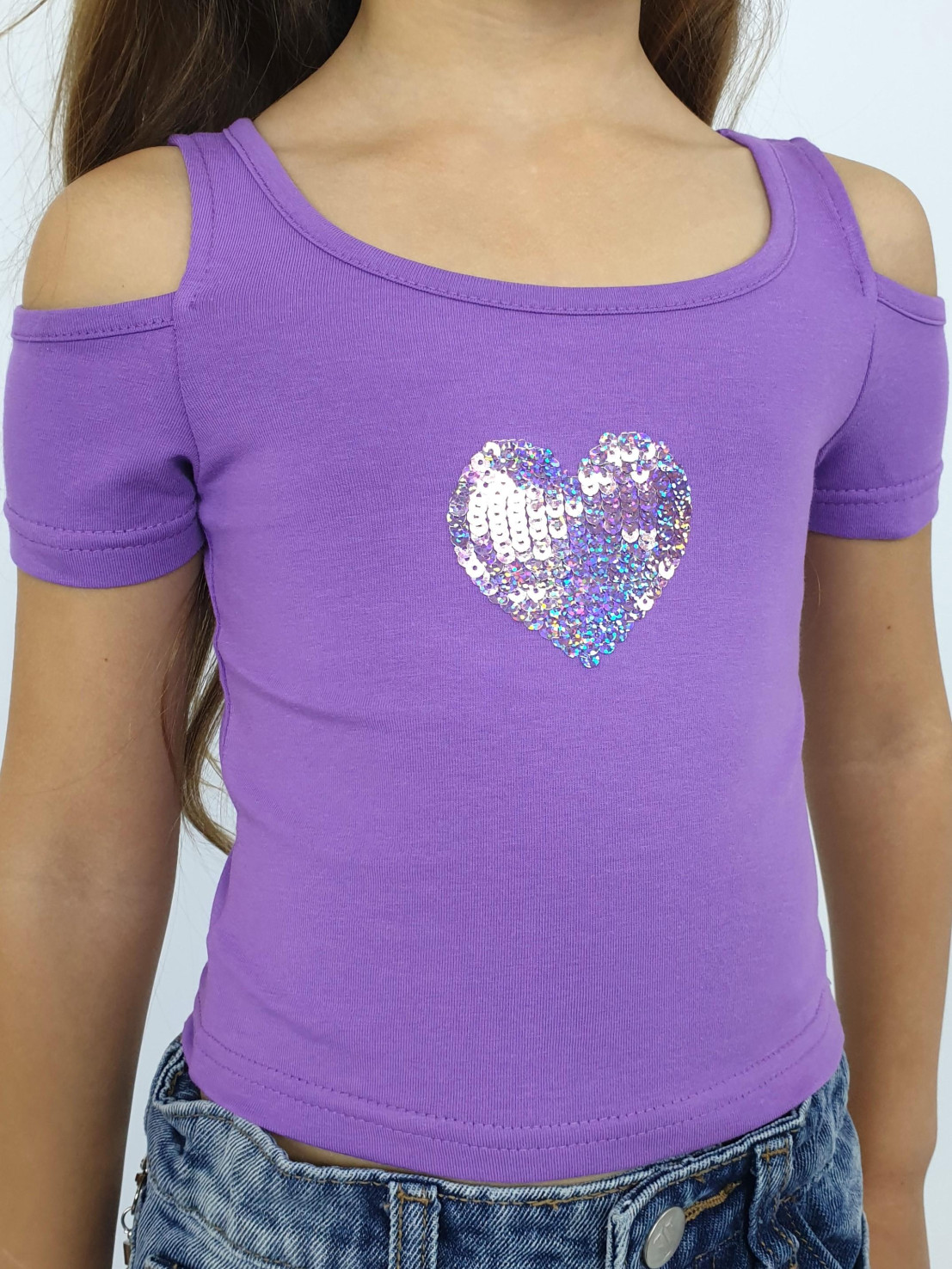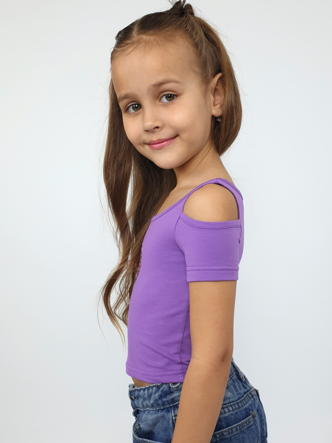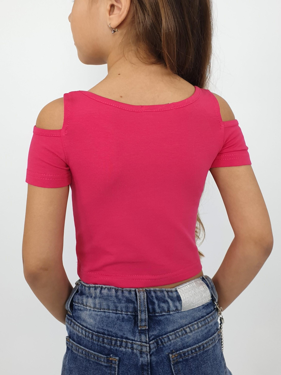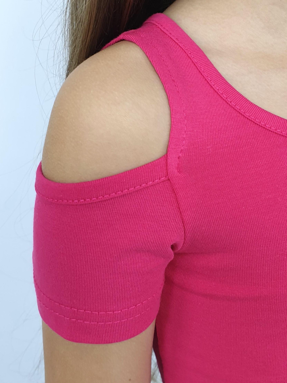 Кулирное полотно: 95% х/б,5% лайкра. Фуфайка-укороченная с коротким рукавом,с вырезом на плече.Горловина окантована.Перед с вышивкой.