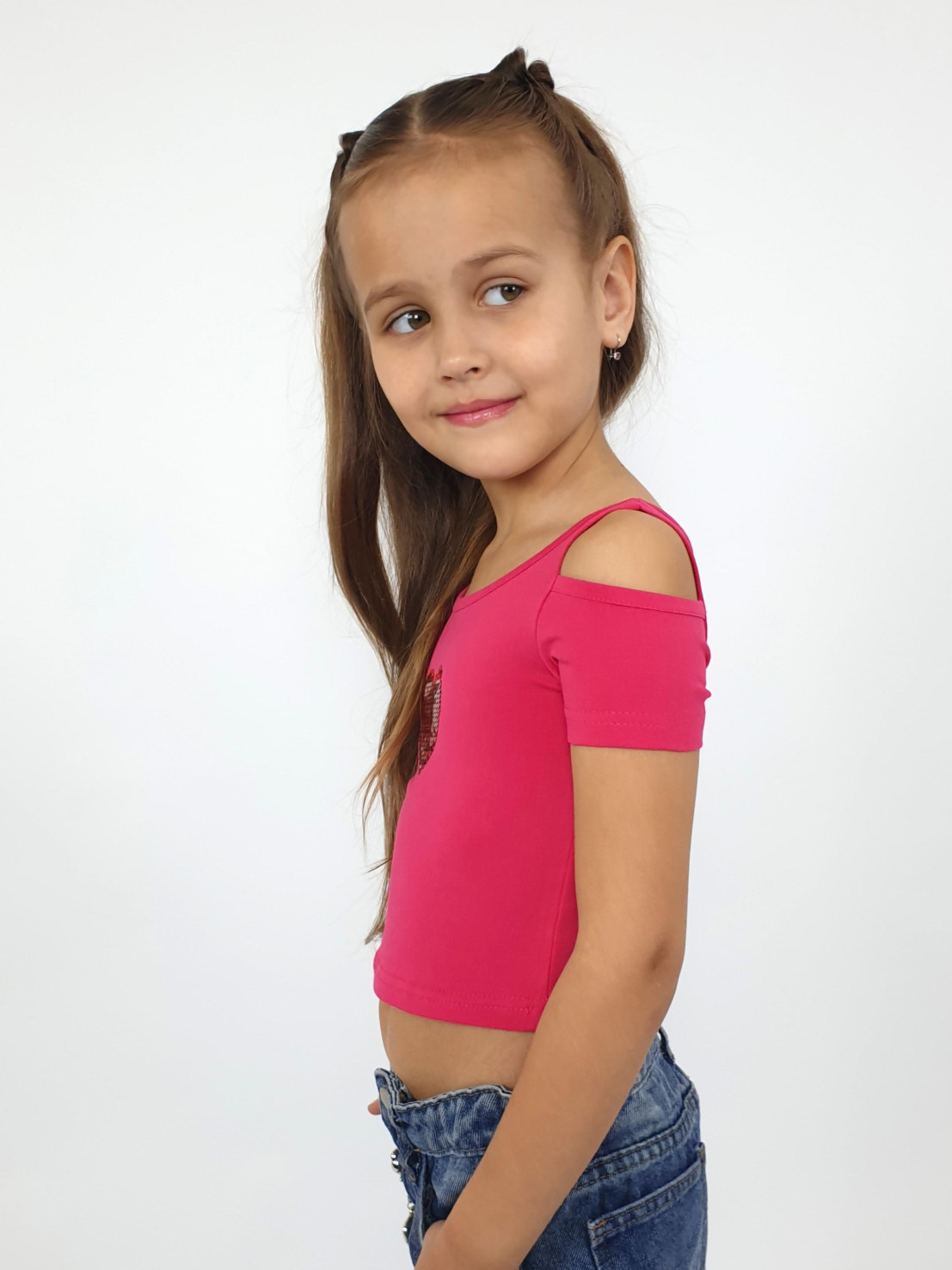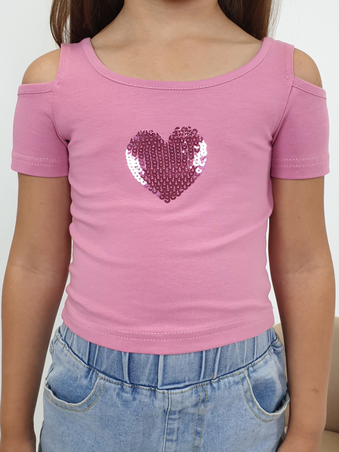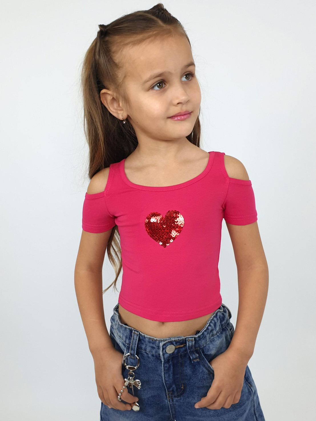 Кулирное полотно: 95% х/б,5% лайкра. Фуфайка-укороченная с коротким рукавом,с вырезом на плече.Горловина окантована.Перед с вышивкой.