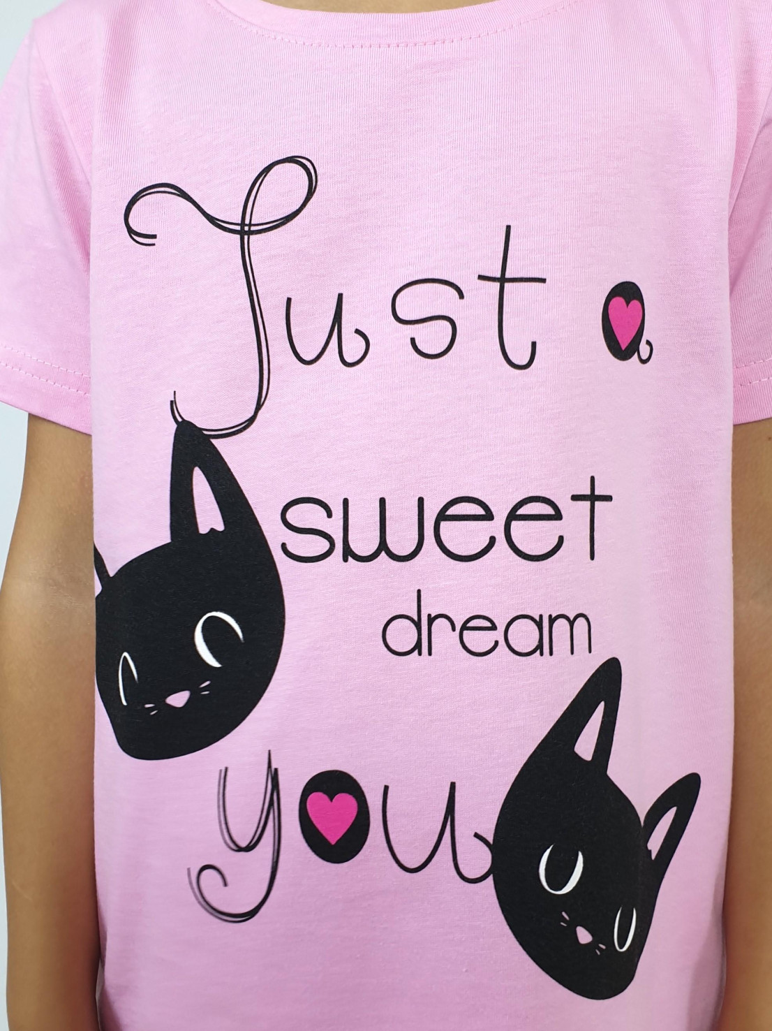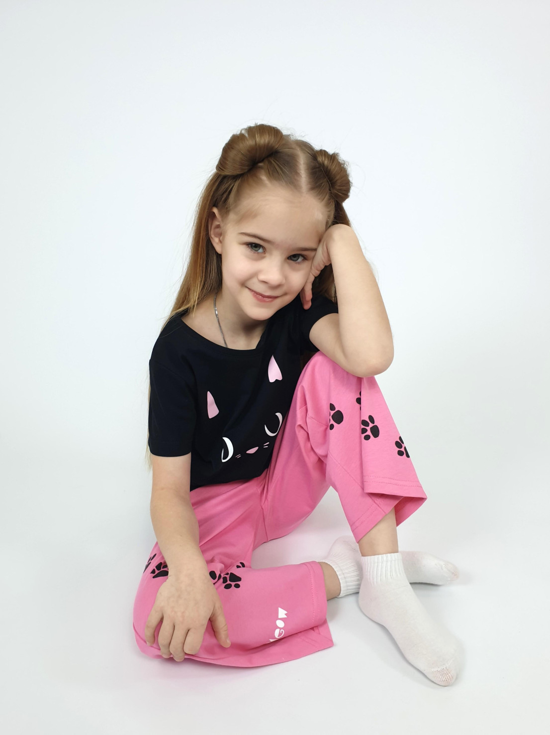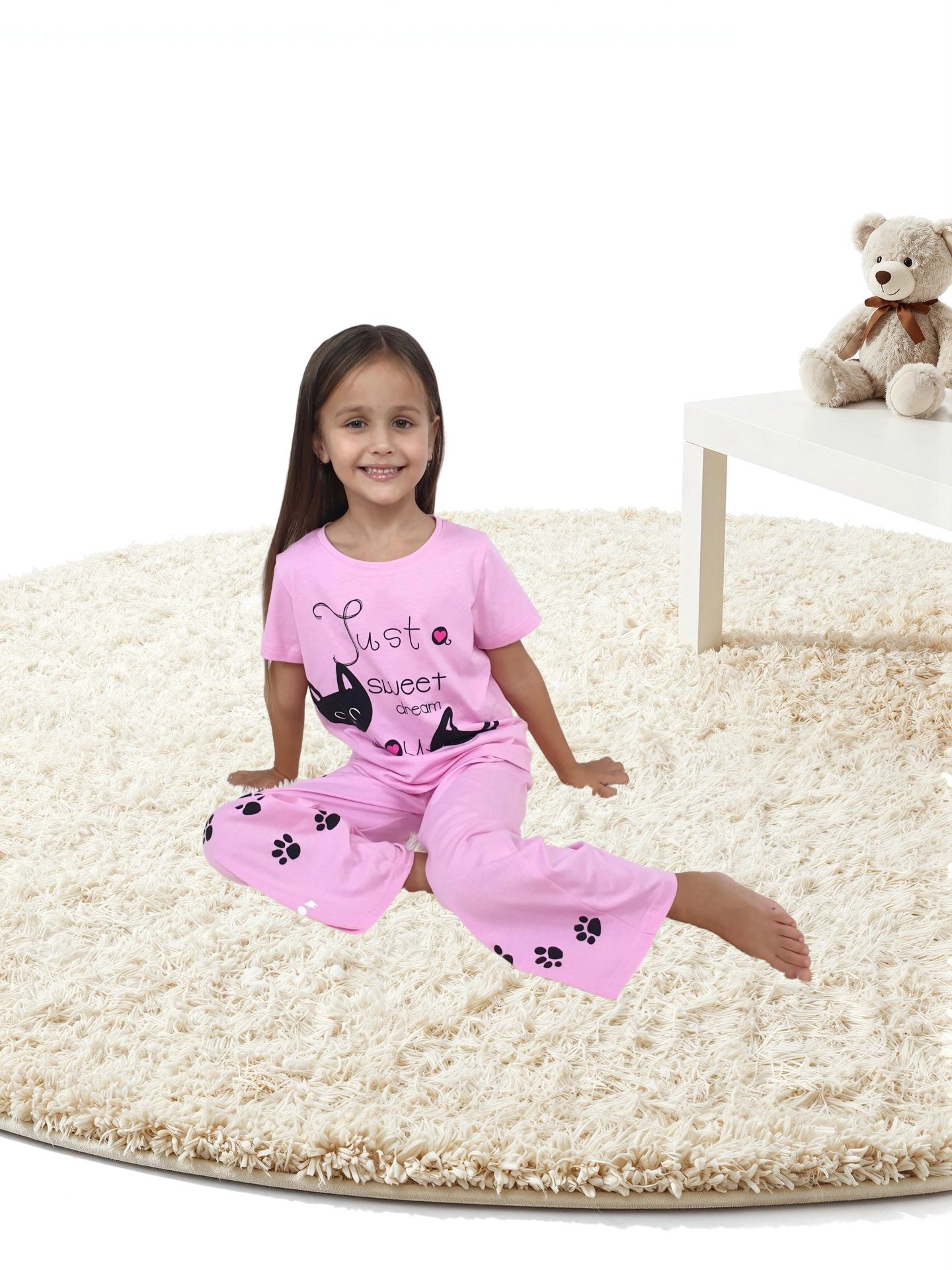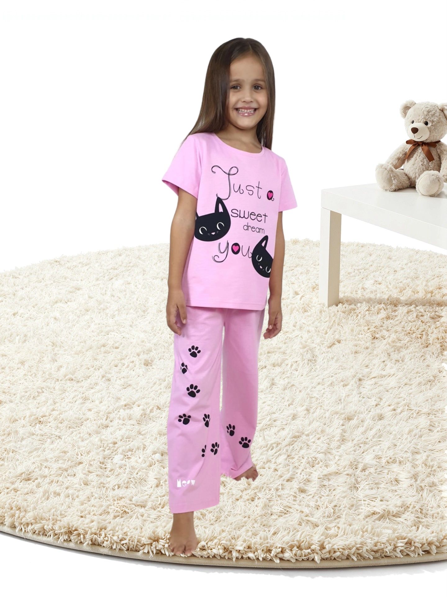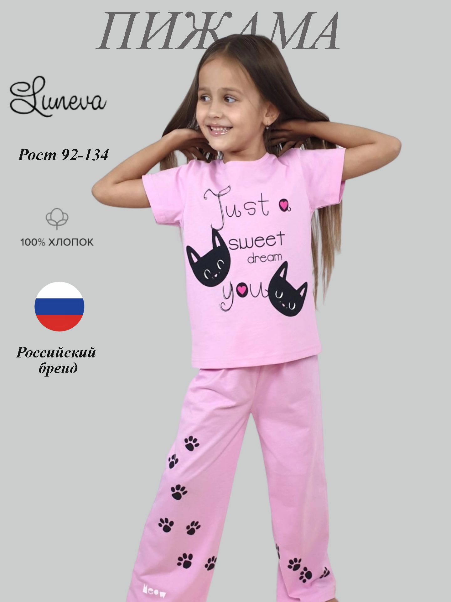 Нежнейшая пижама "Luneva" для маленьких принцесс! Комплект из мягкой фуфайки с коротким рукавом и удобных брючек украшен стильной печатью, добавляющей образу оригинальности. Прямой крой и кулирное полотно (100%-й натуральный хлопок) обеспечивают комфорт даже во время сна. Оттенок розового нюда подчеркнёт утончённость и изысканность вашего ребёнка.
