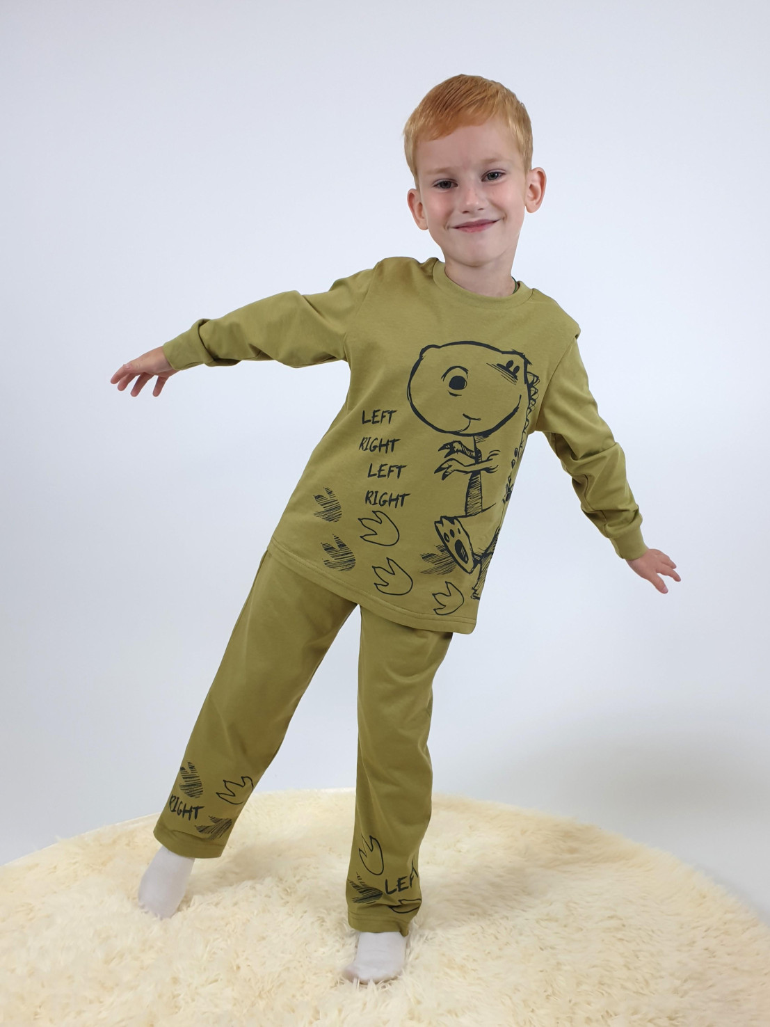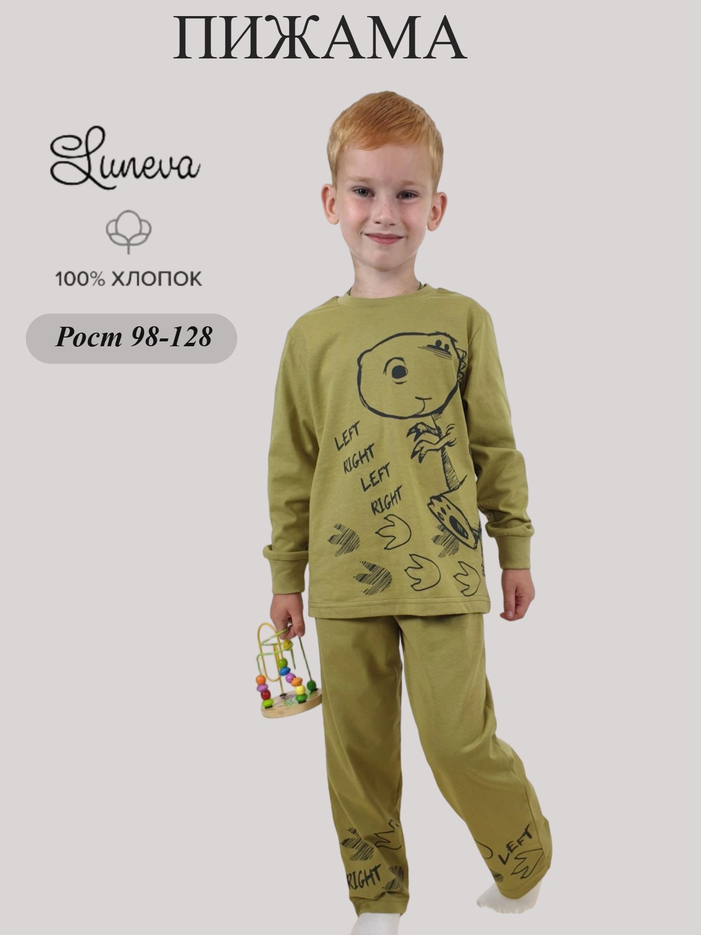 Изготавливается в России из приятного кулирного полотна (100% хлопок), обеспечивающего комфорт во время сна и безопасность для детской кожи. Пижама от бренда "Luneva" выполнена в стильных оливковых оттенах с оригинальным принтом, который обязательно понравится мальчикам. Удобный крой, резинки на талии брюк и рукавах футболки гарантируют свободу движений и идеальную посадку по фигуре. Идеальный подарок малышу!