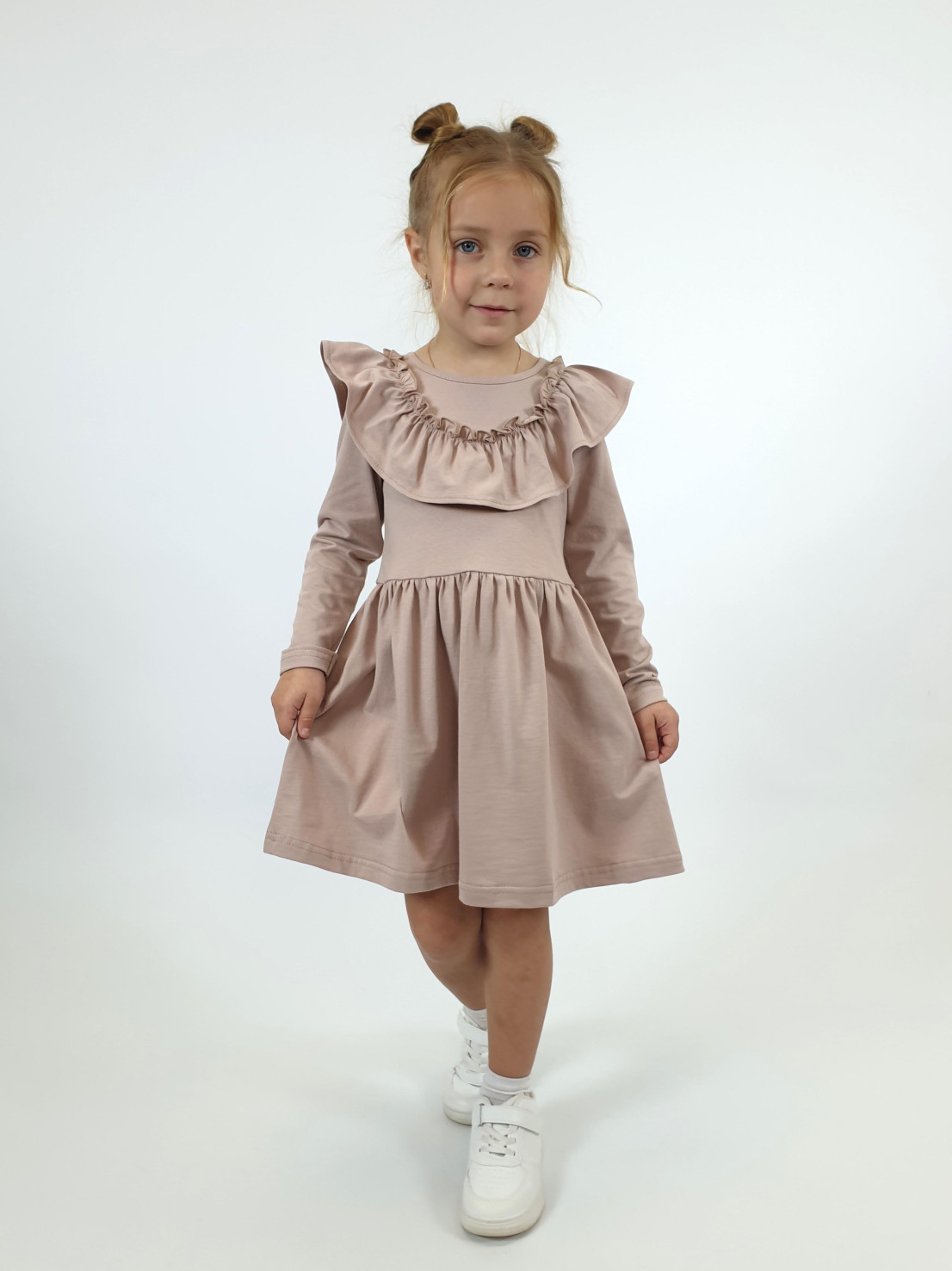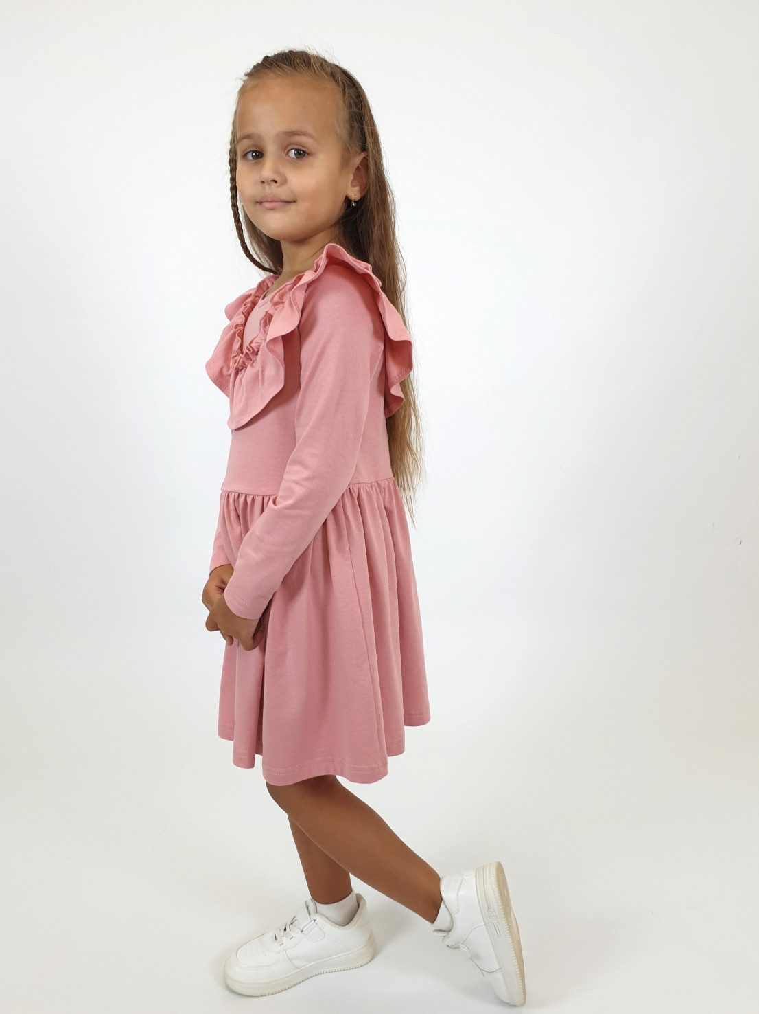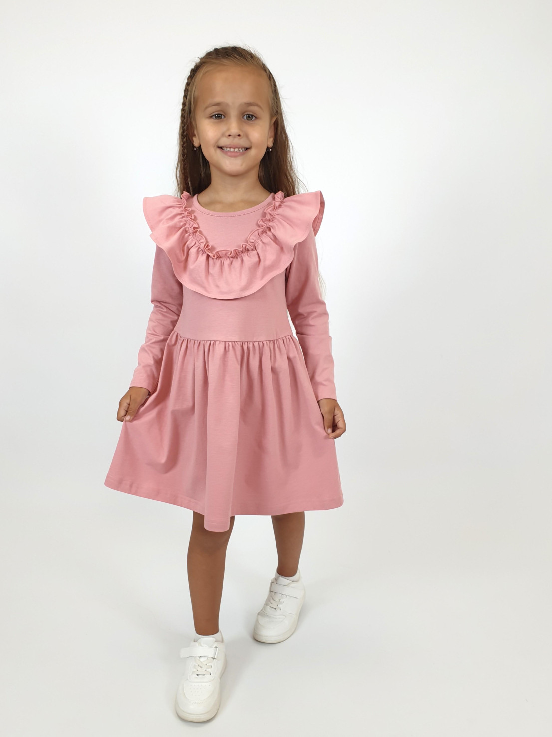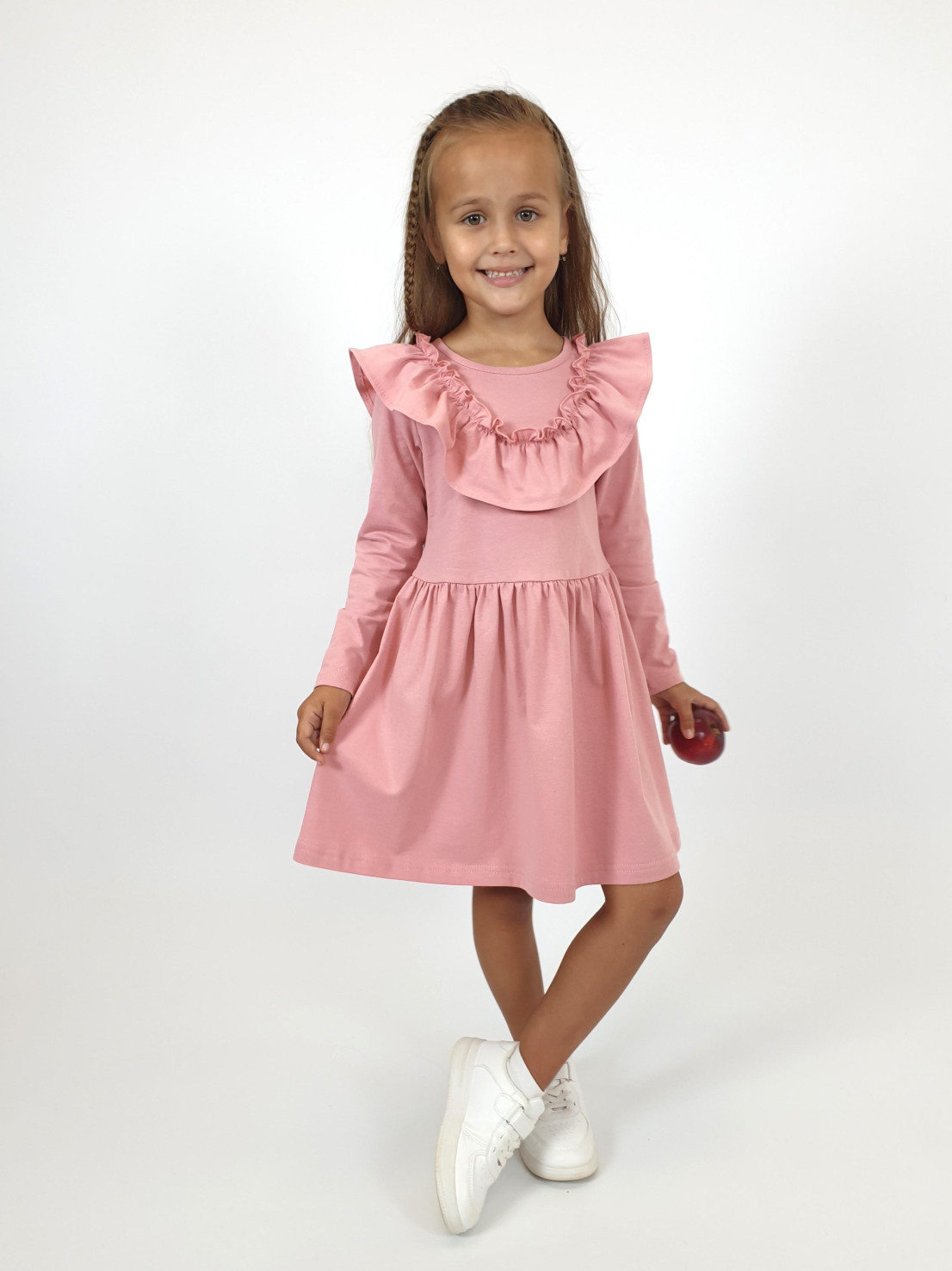 Кулирное полотно:100% х/б. Платье-полуприлегающего силуэта,отрезная юбка со сборкой.Втачной,длинный рукав.Рюша по переду и спинке.Застежка на спинке капля с пуговицей,горловина окантована.