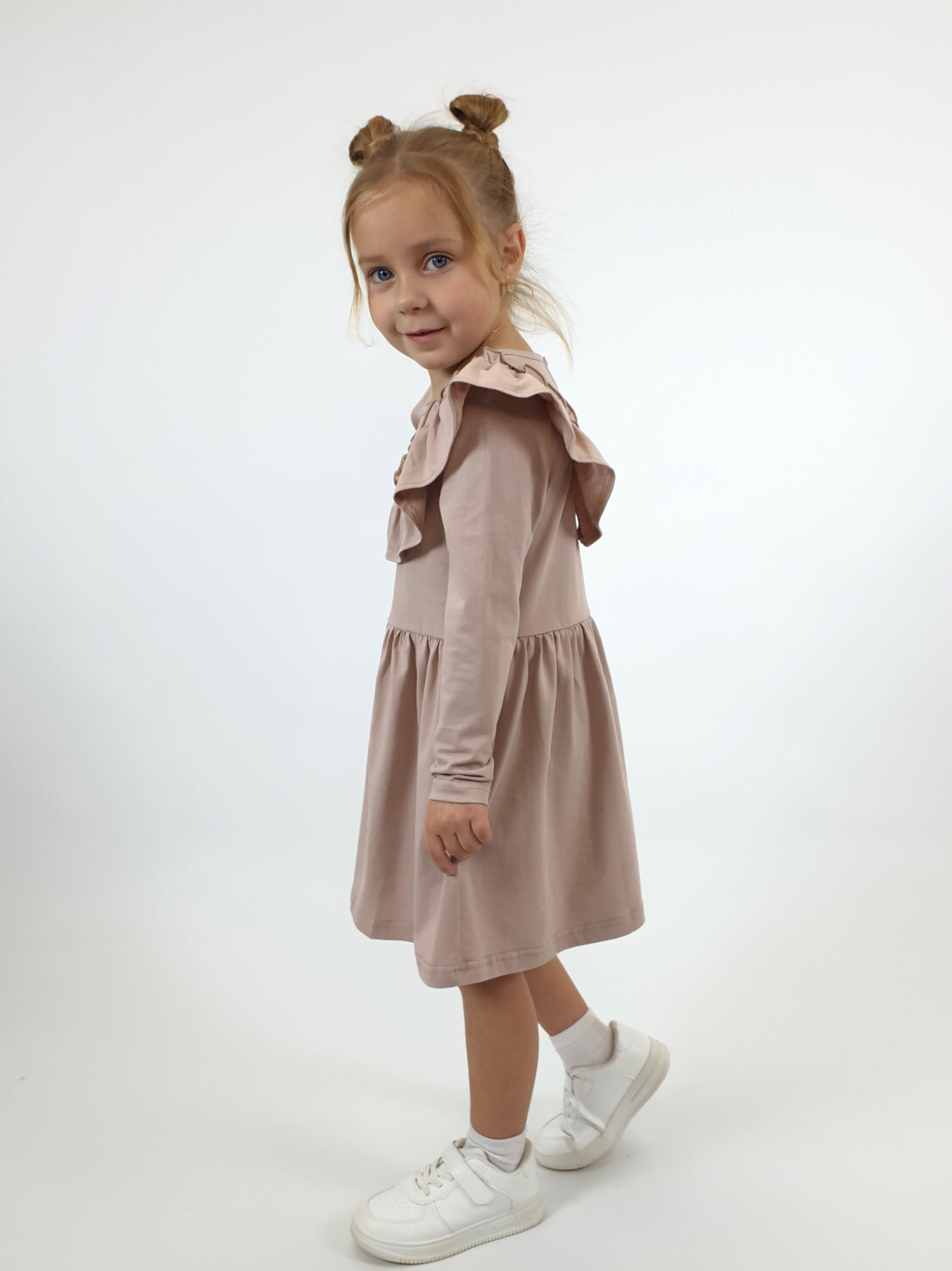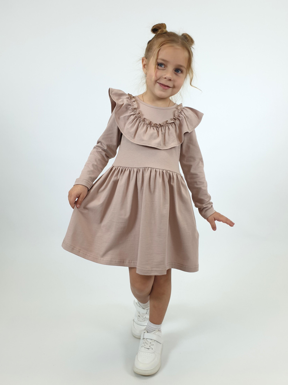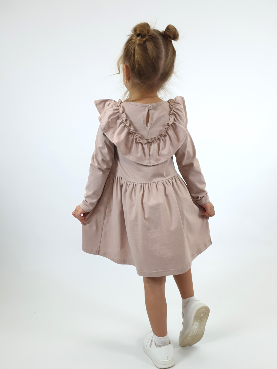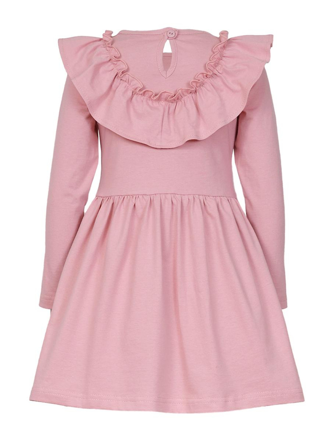 Кулирное полотно:100% х/б. Платье-полуприлегающего силуэта,отрезная юбка со сборкой.Втачной,длинный рукав.Рюша по переду и спинке.Застежка на спинке капля с пуговицей,горловина окантована.