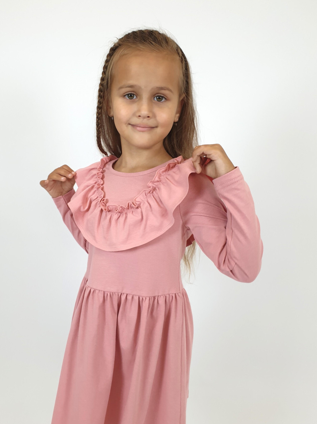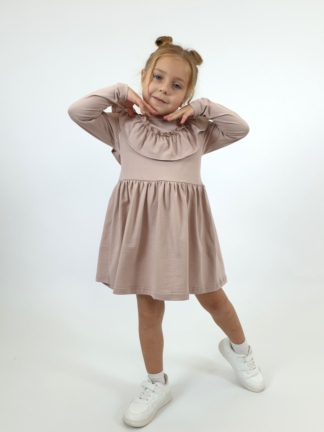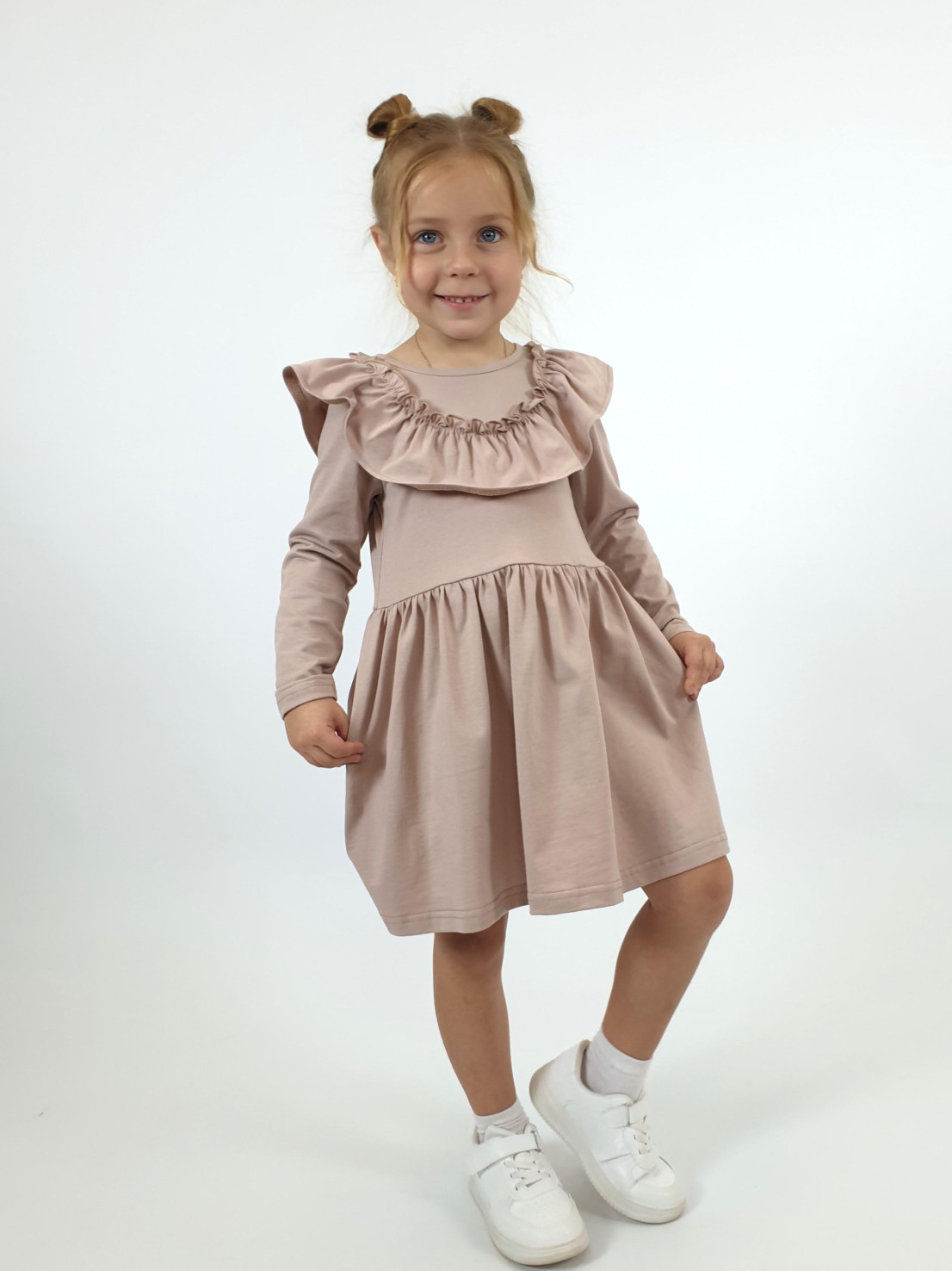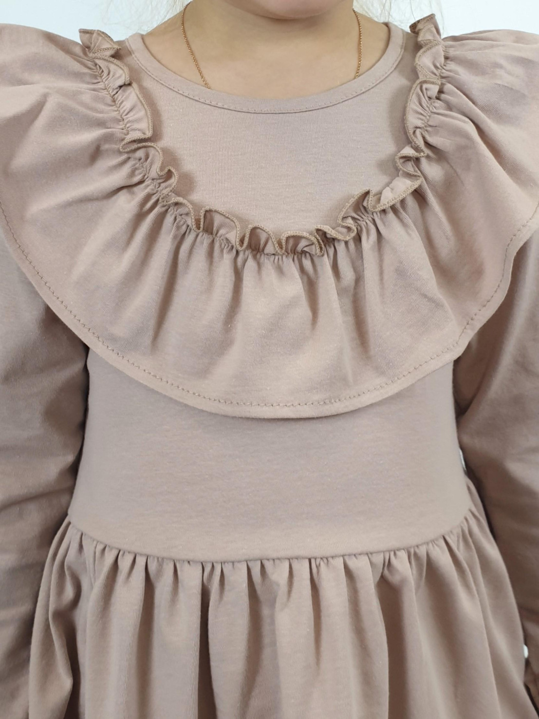 Кулирное полотно:100% х/б. Платье-полуприлегающего силуэта,отрезная юбка со сборкой.Втачной,длинный рукав.Рюша по переду и спинке.Застежка на спинке капля с пуговицей,горловина окантована.