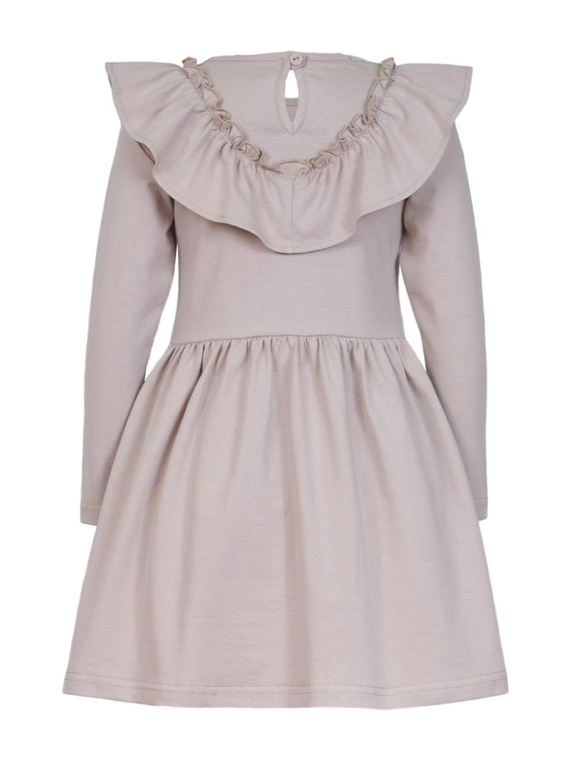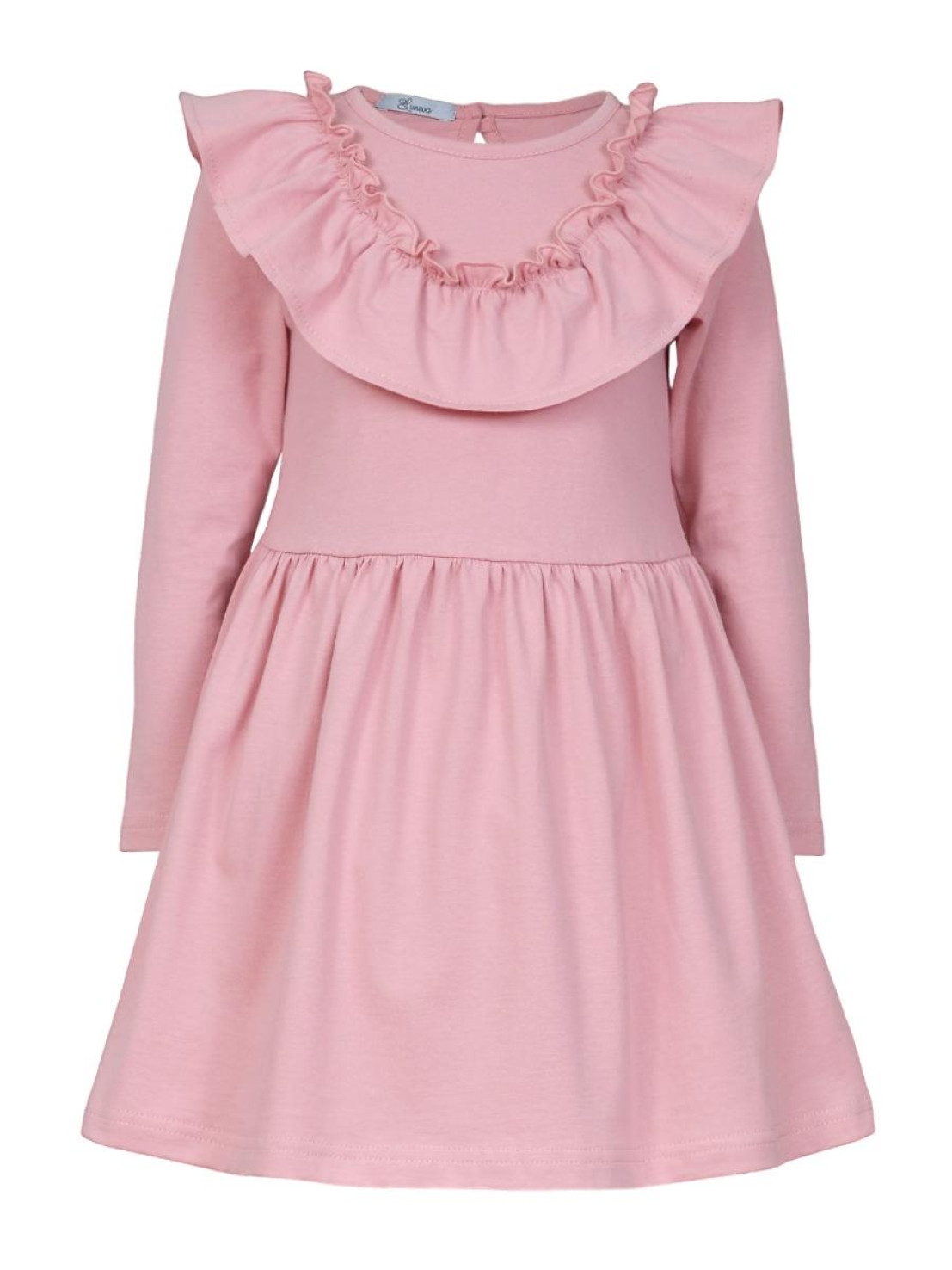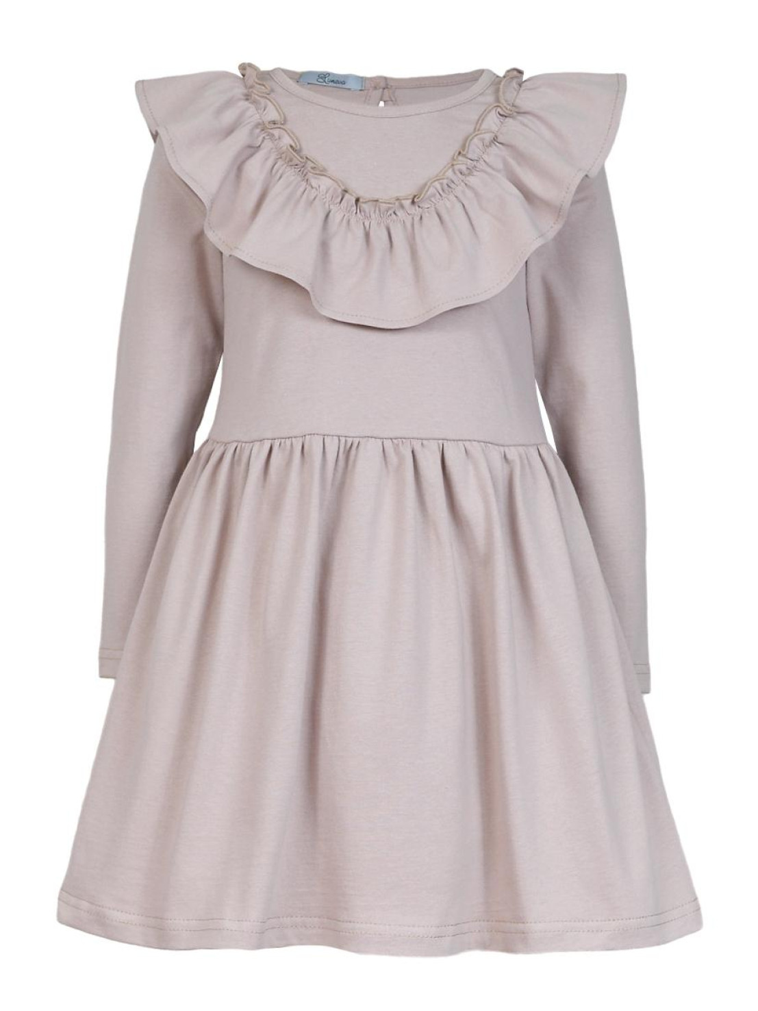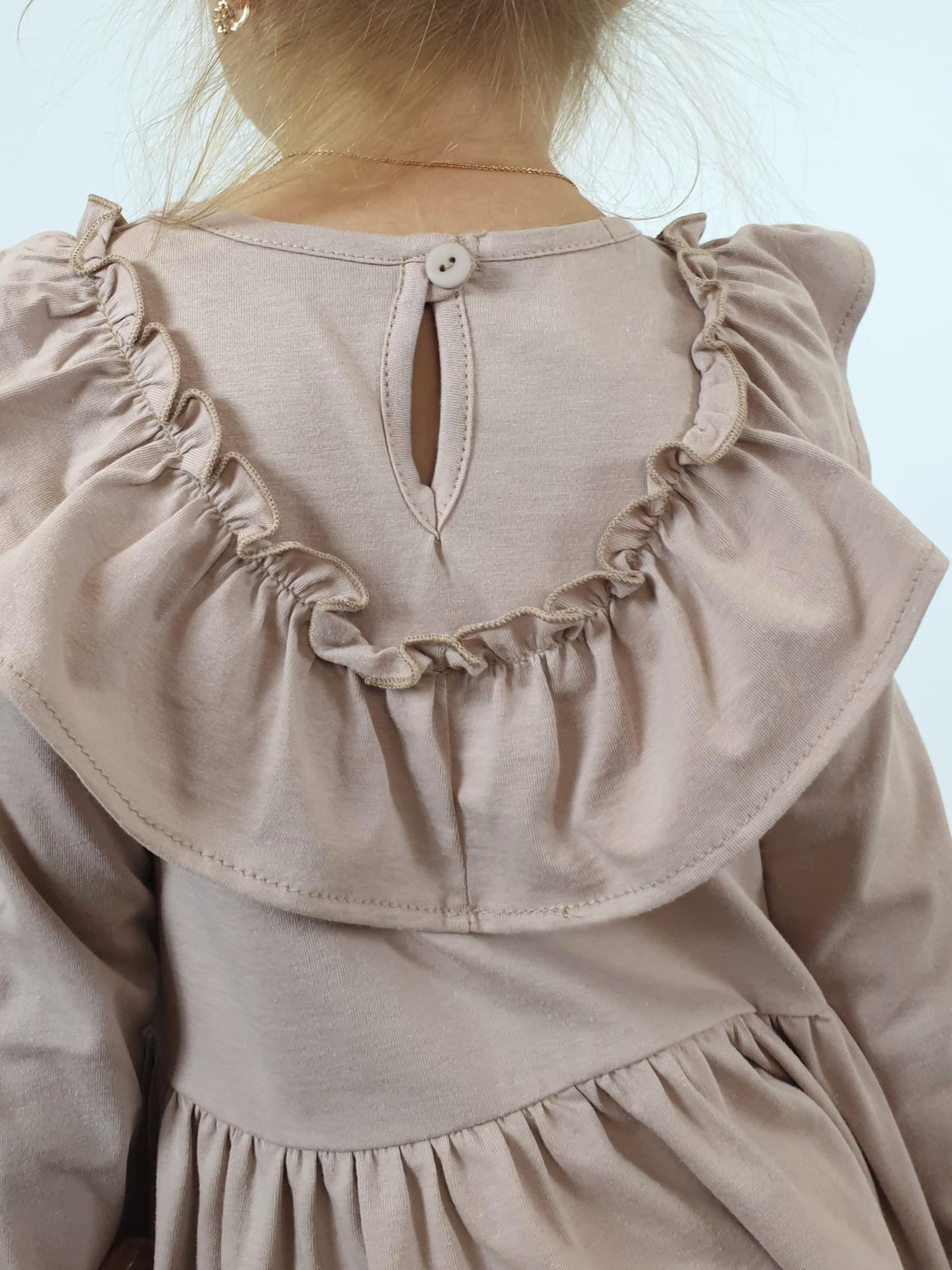 Кулирное полотно:100% х/б. Платье-полуприлегающего силуэта,отрезная юбка со сборкой.Втачной,длинный рукав.Рюша по переду и спинке.Застежка на спинке капля с пуговицей,горловина окантована.