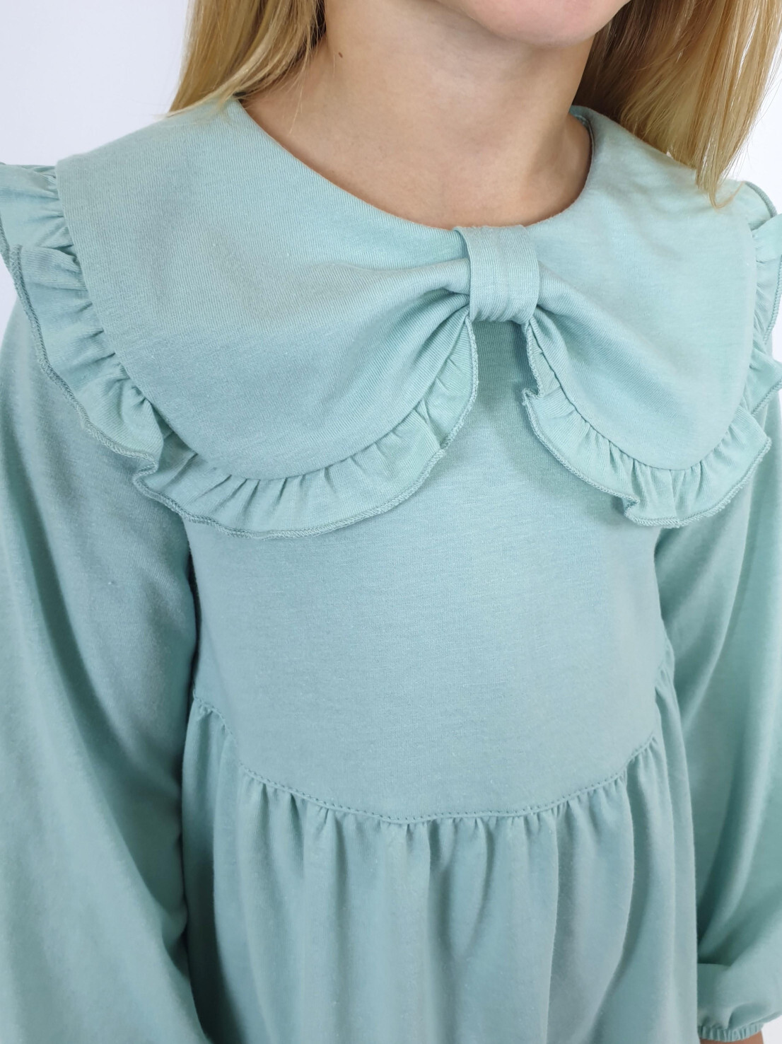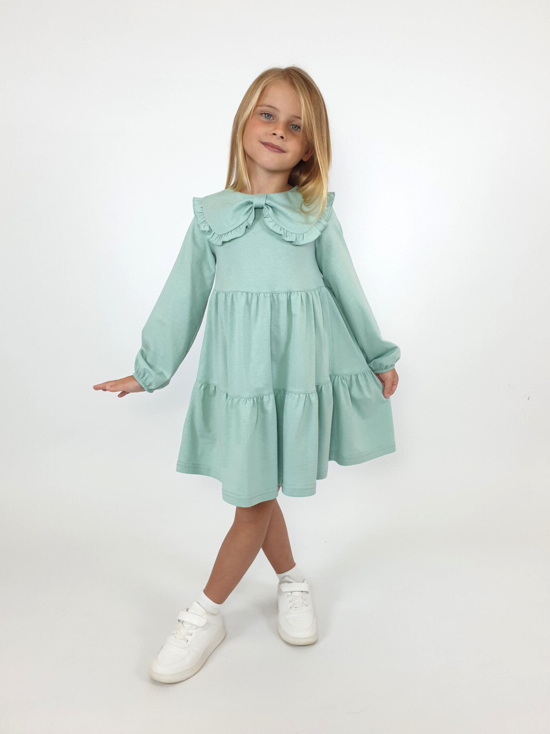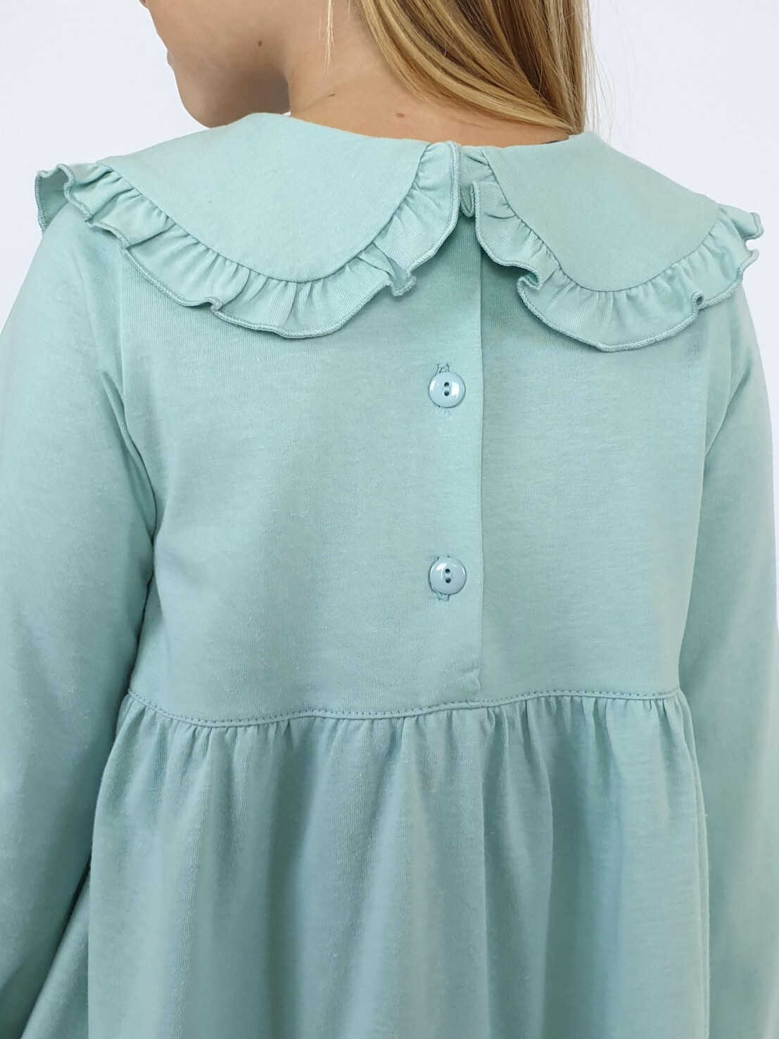 Кулирное полотно:100% х/б. Платье-силуэт трапеция,длинный втачной рукав,внизу собран на резинку.Юбка переда и спинки из двух воланов.В горловине плоско-лежащий воротник с рюшей.Застежка на пуговицы по спинке.