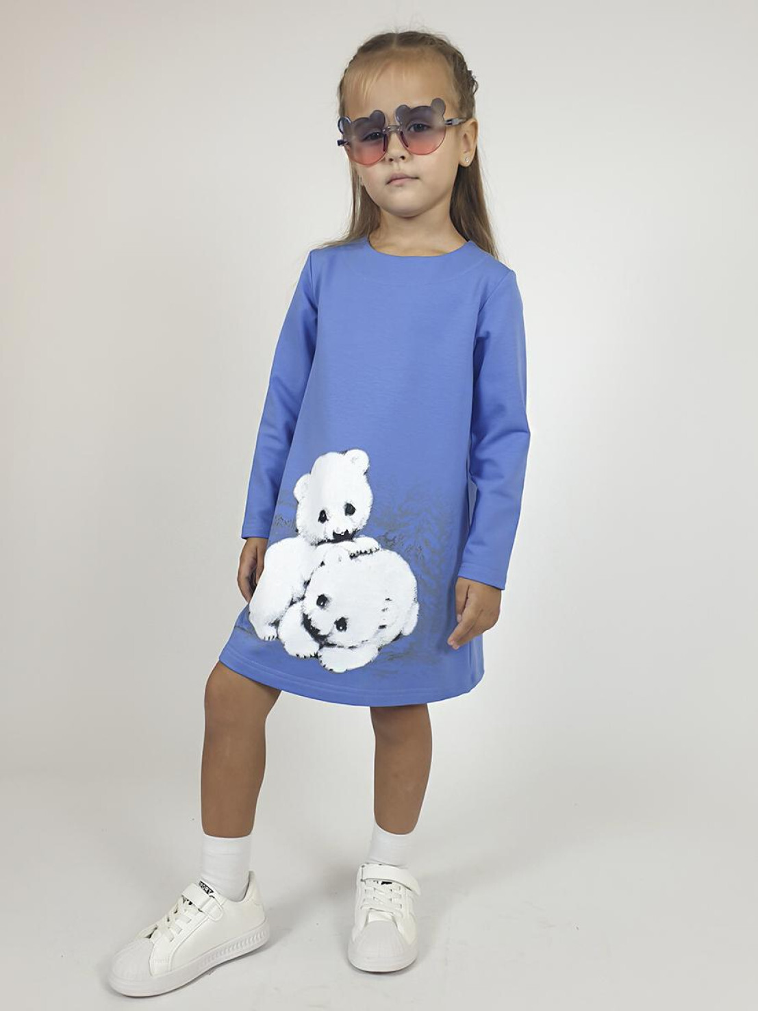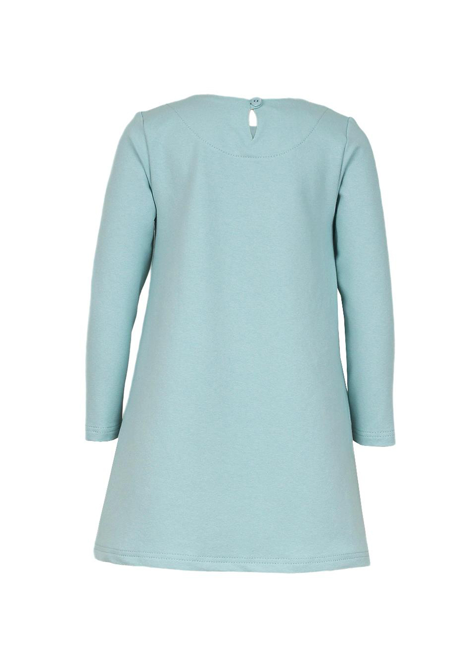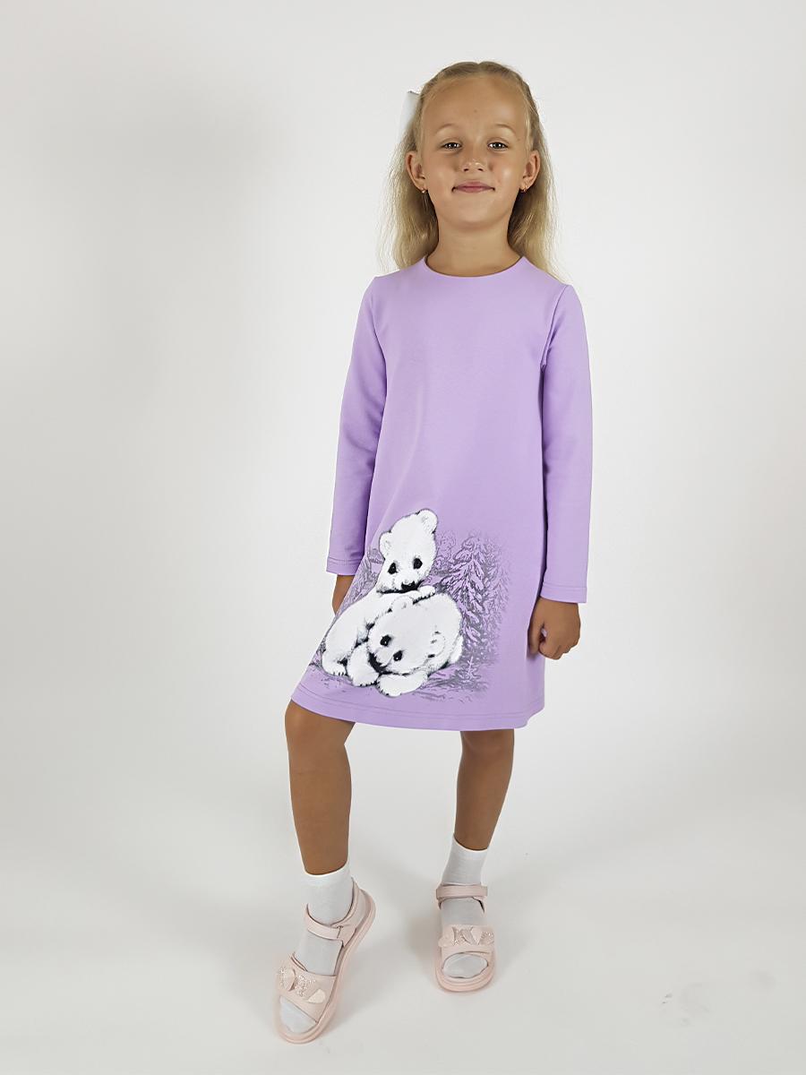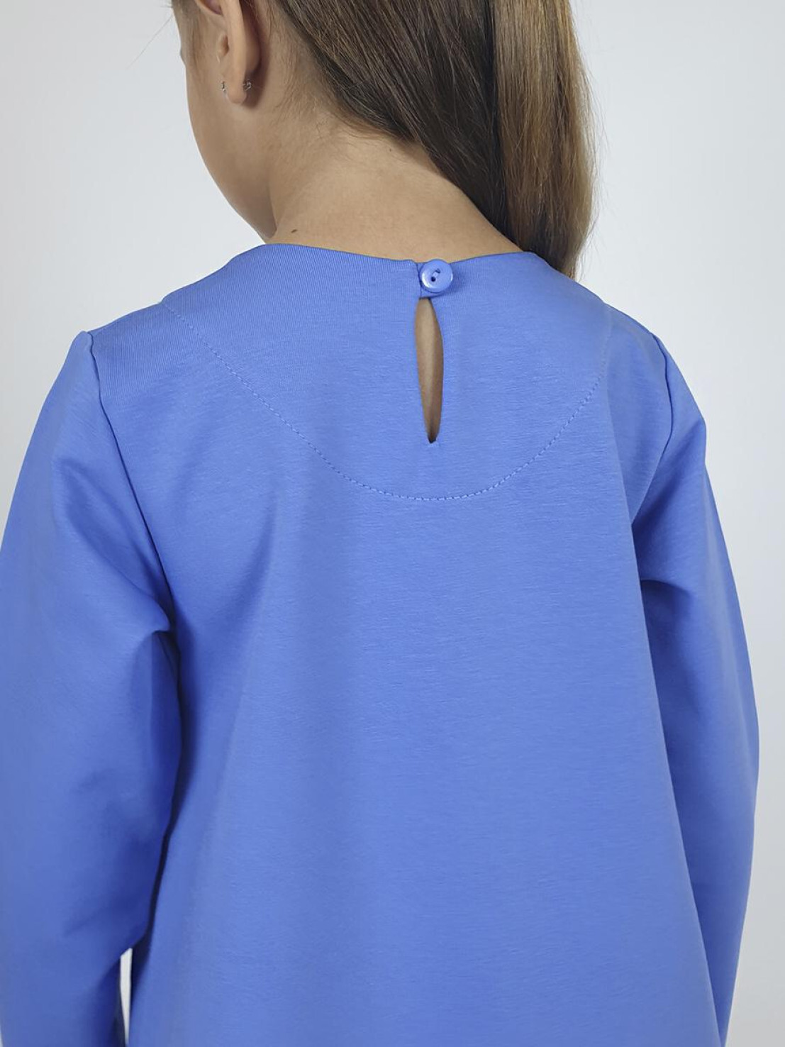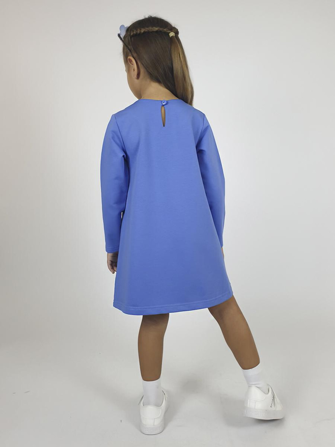 Футер 2-х нитка:80% х/б,14% п/э,6 % лайкра. Платье-силуэт трапеция,без воротника,застежка на пуговицу по спинке.Втачной длинный рукав.Печать на полочке,внизу.