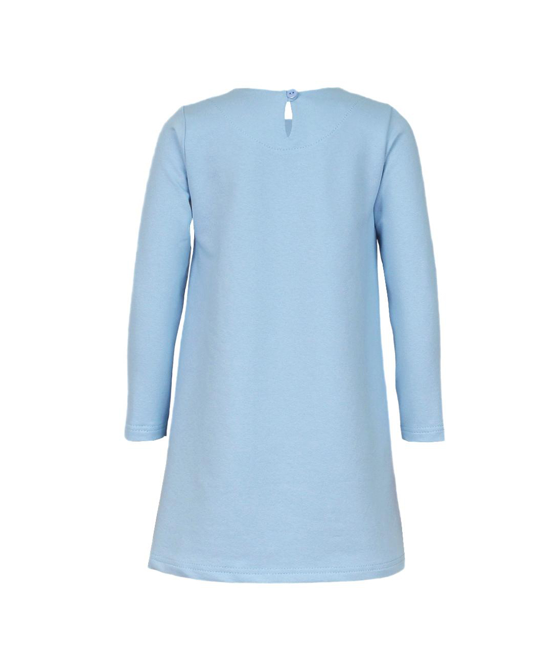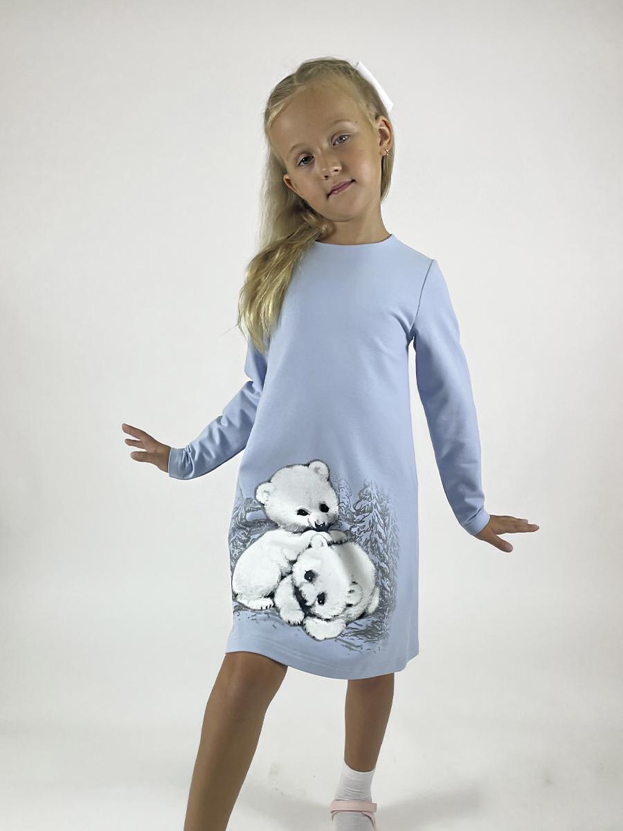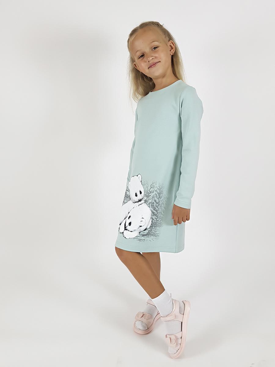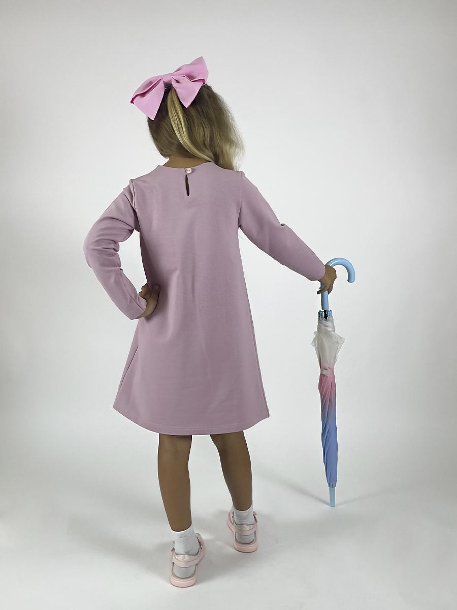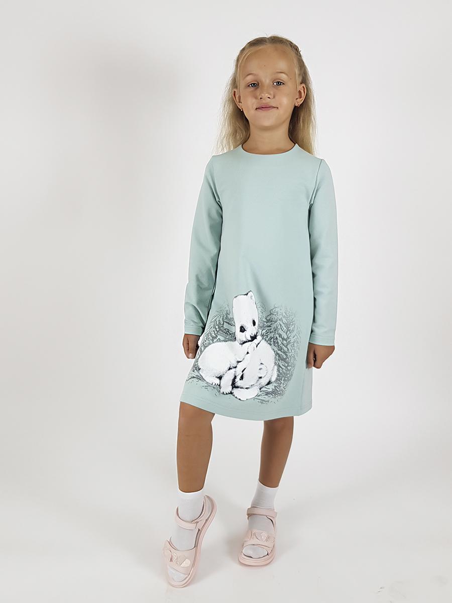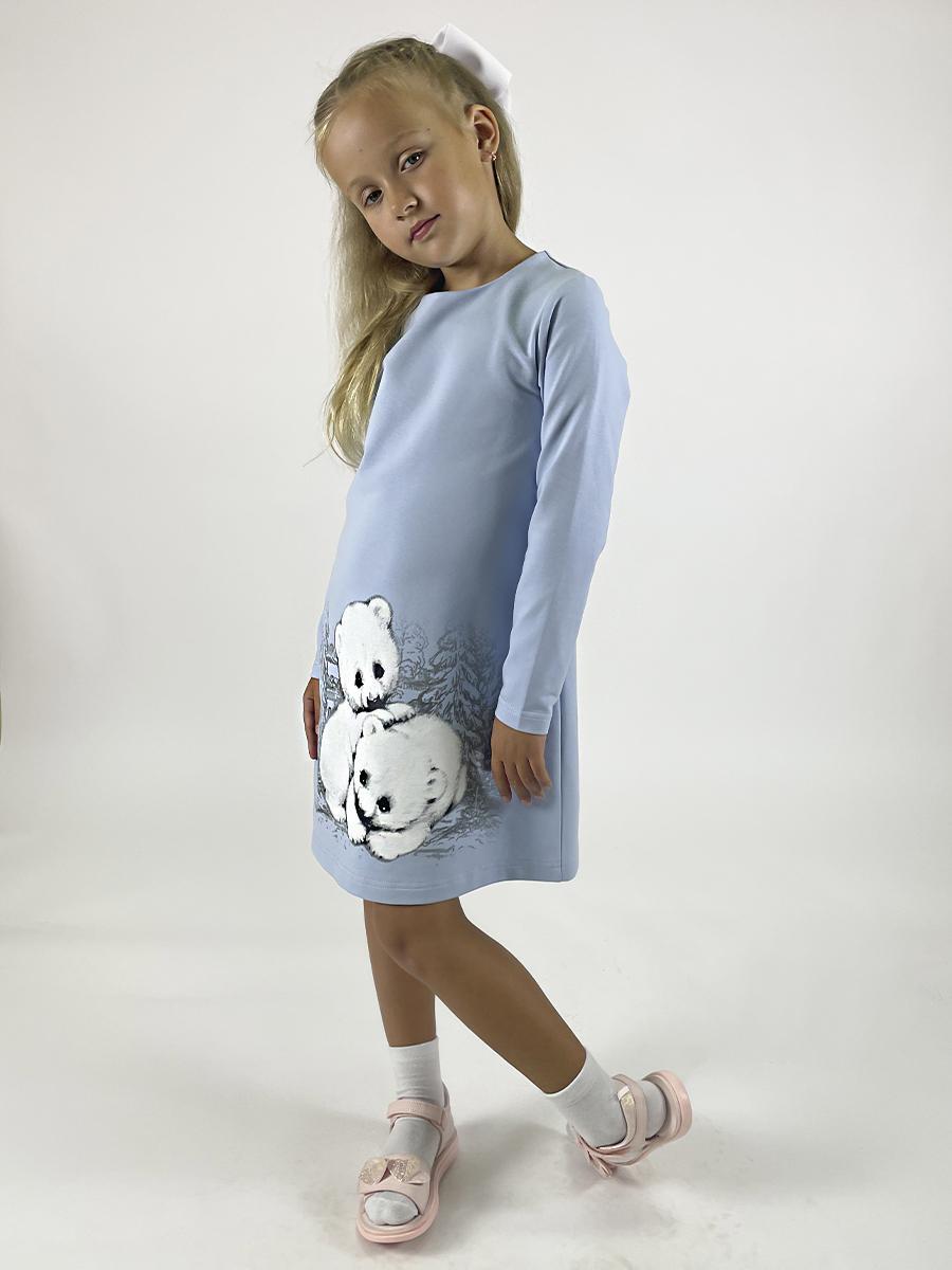 Футер 2-х нитка:80% х/б,14% п/э,6 % лайкра. Платье-силуэт трапеция,без воротника,застежка на пуговицу по спинке.Втачной длинный рукав.Печать на полочке,внизу.