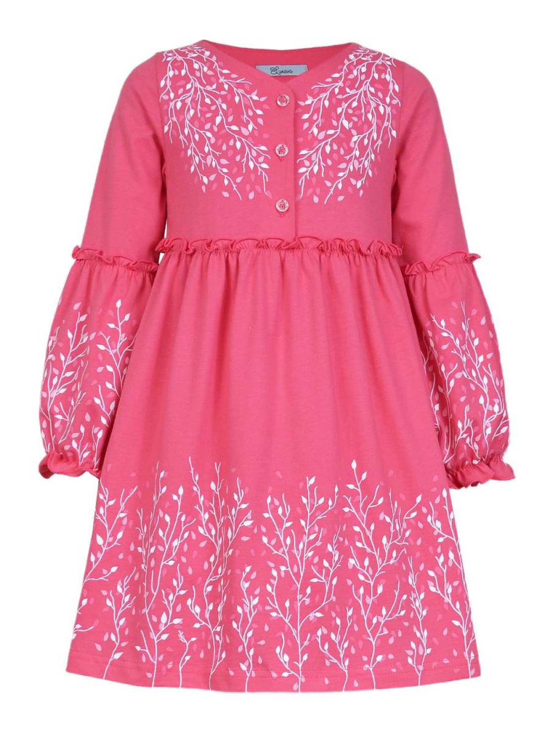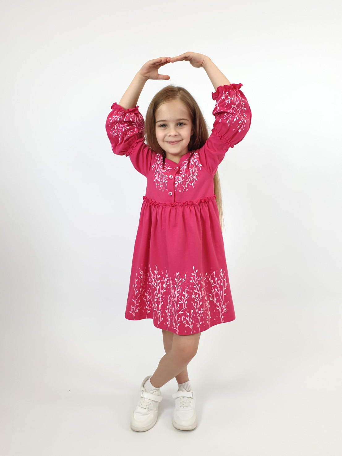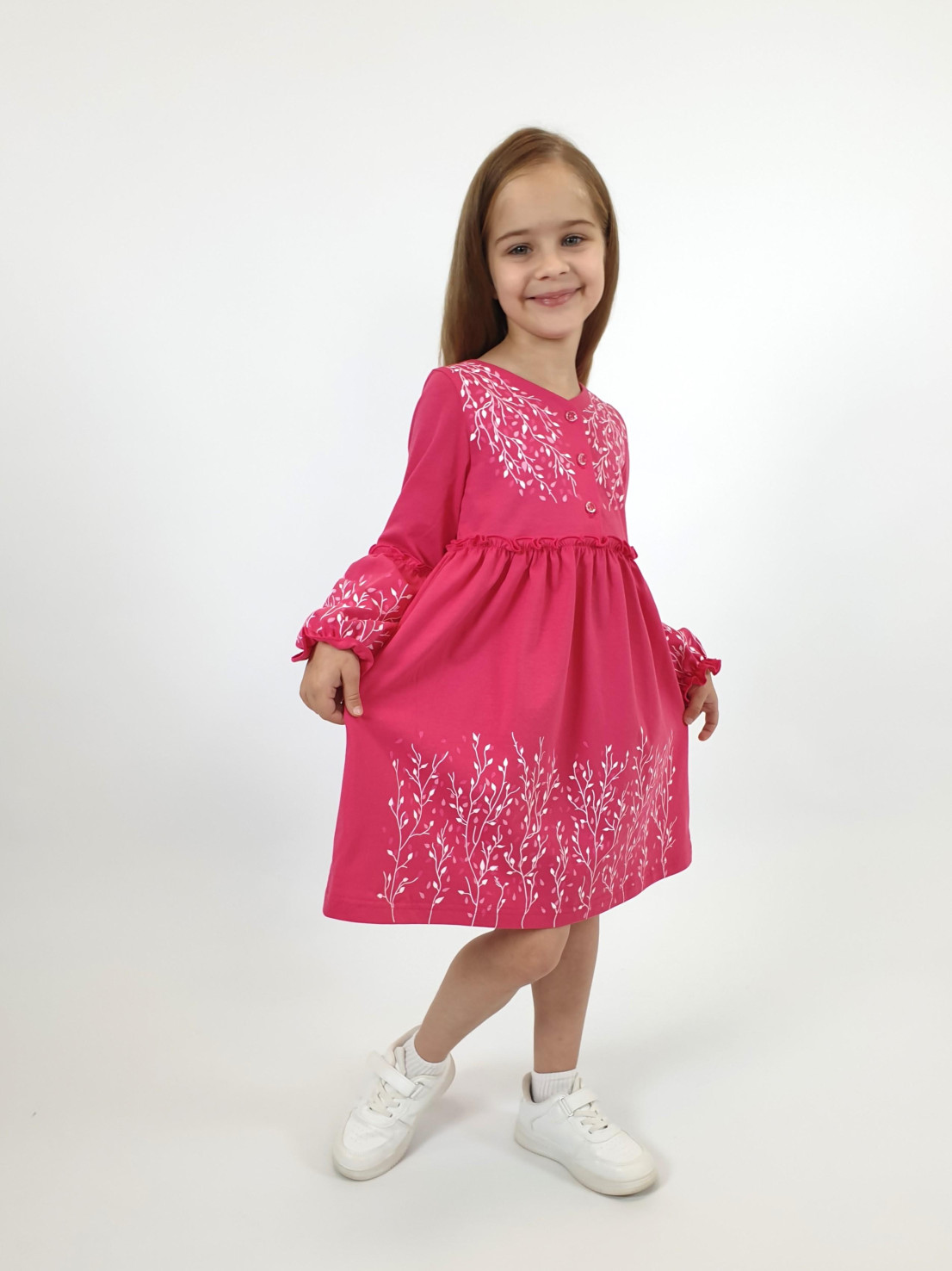 Это очаровательное платье станет стильным акцентом детского образа! Элегантный силуэт-трапеция подчеркивает нежность и женственность, а завышенная талия придает фигуре особую грацию. Располагаясь на фоне насыщенного цвета "спелой малины", оригинальная печать создает неповторимый дизайн и делает образ ярким и запоминающимся. Идеально подходит как для прогулок, так и праздничных мероприятий.