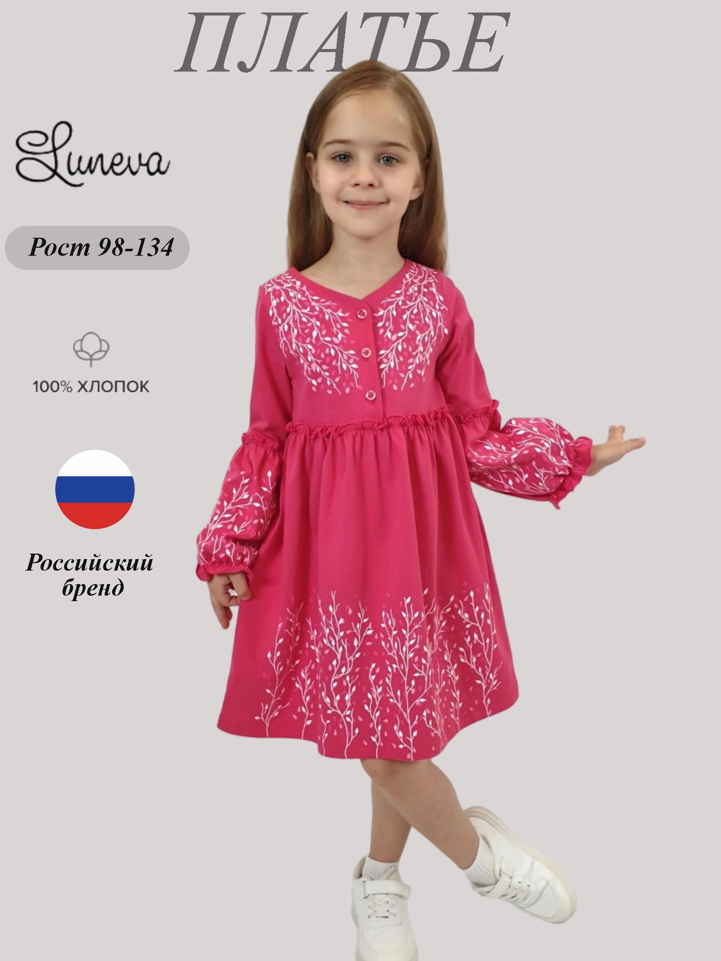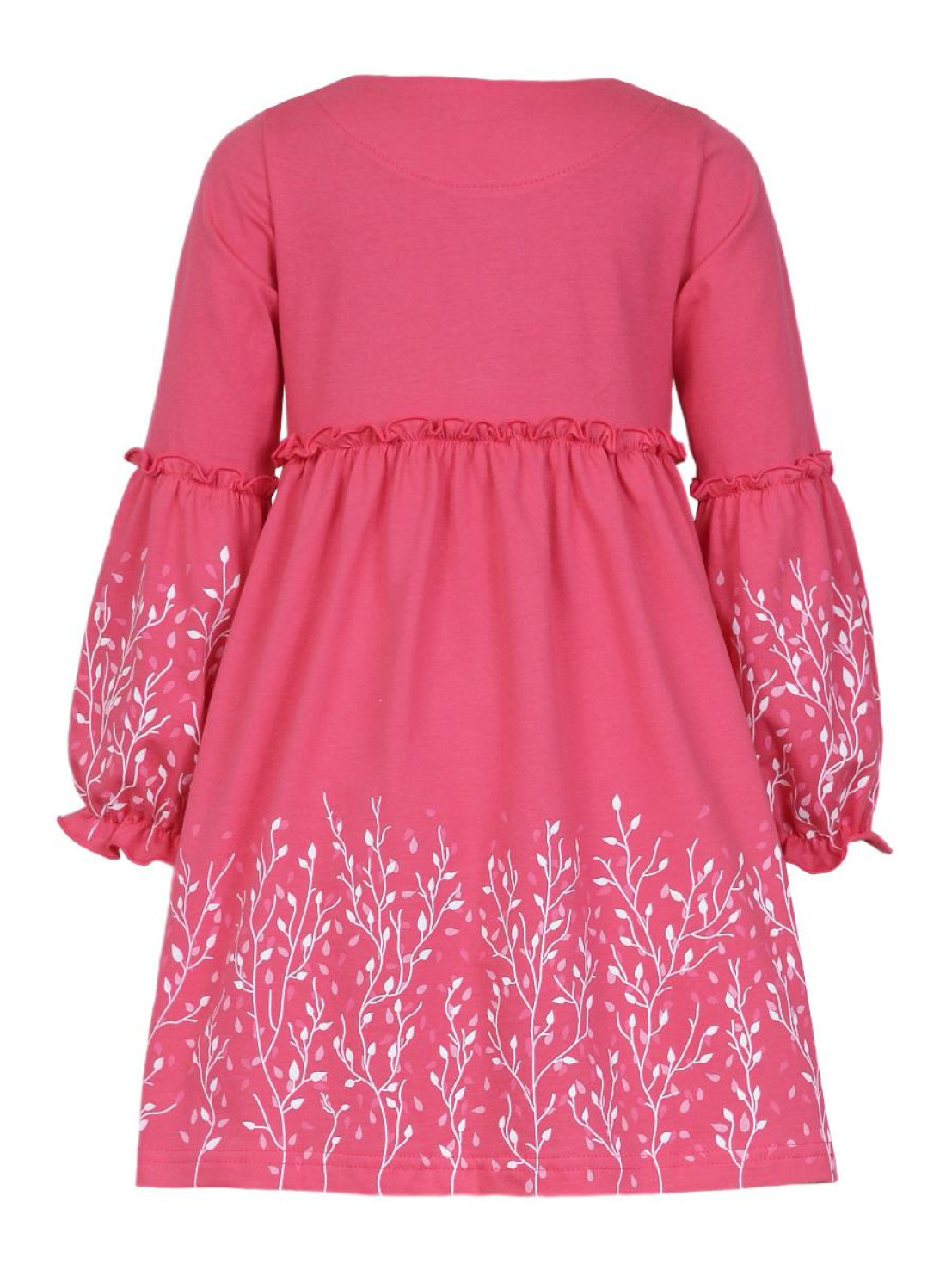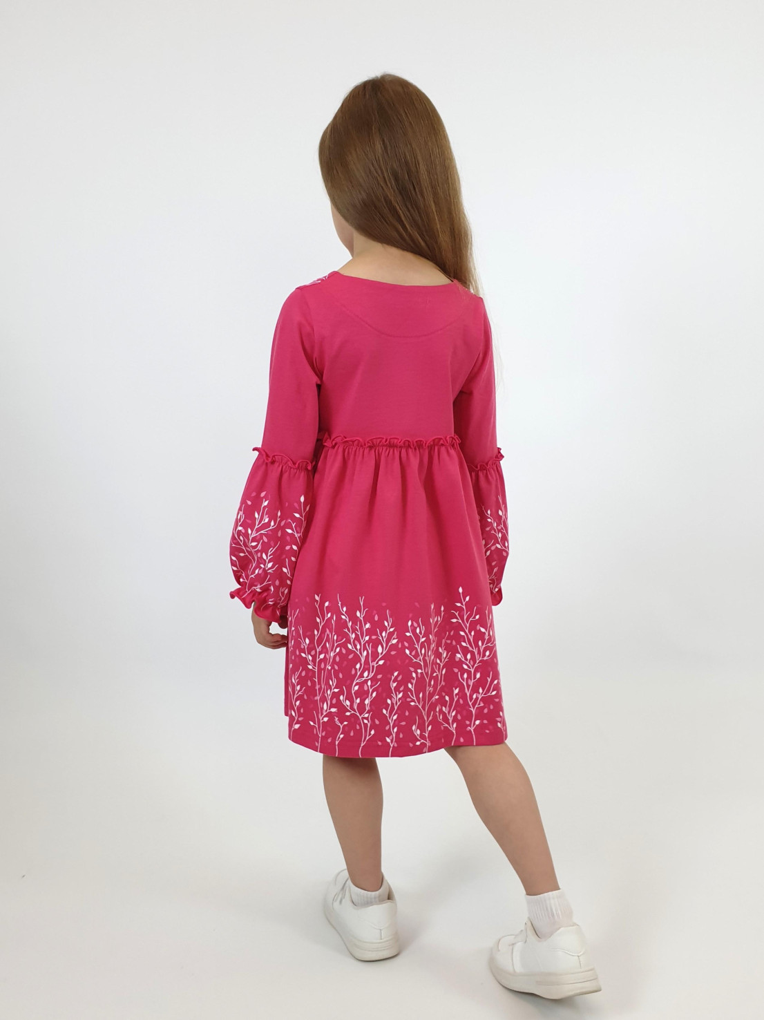 Это очаровательное платье станет стильным акцентом детского образа! Элегантный силуэт-трапеция подчеркивает нежность и женственность, а завышенная талия придает фигуре особую грацию. Располагаясь на фоне насыщенного цвета "спелой малины", оригинальная печать создает неповторимый дизайн и делает образ ярким и запоминающимся. Идеально подходит как для прогулок, так и праздничных мероприятий.