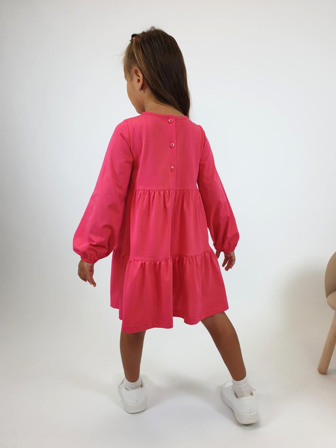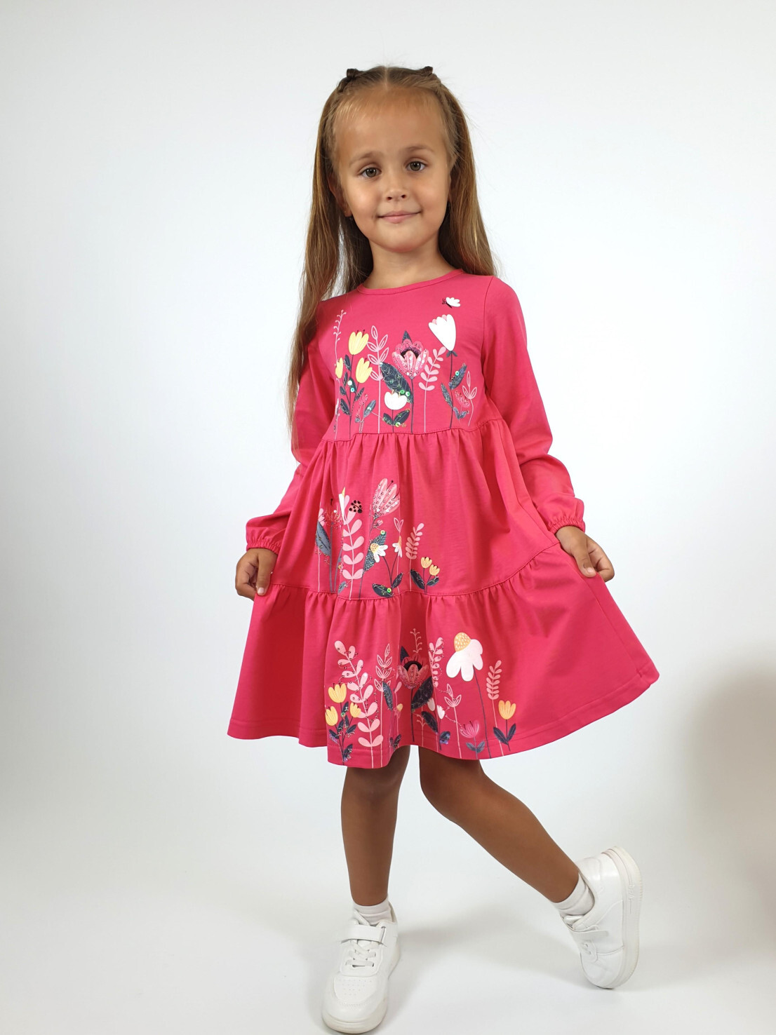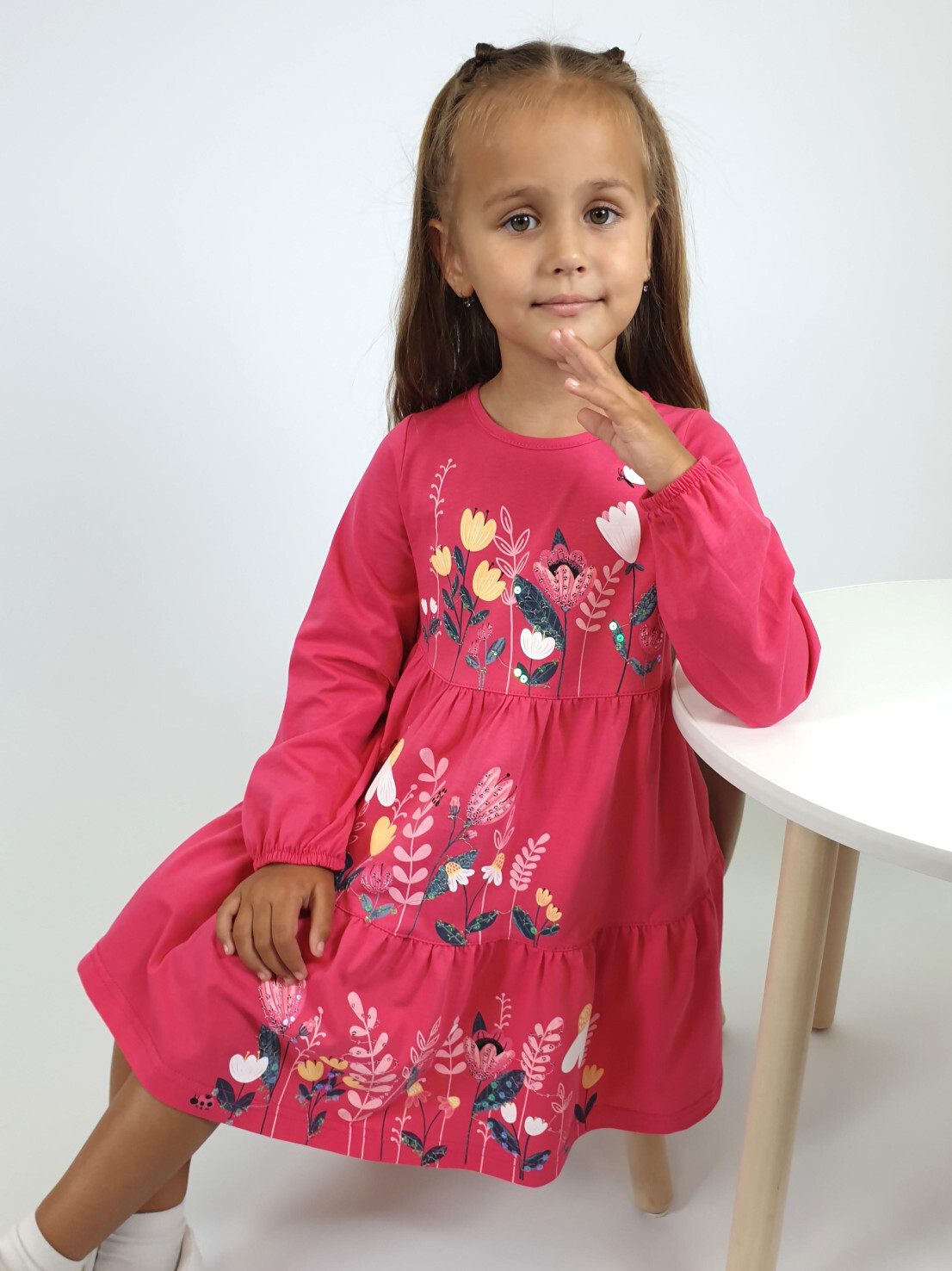 Кулирное полотно:100%х/б. Платье-силуэт трапеция,длинный втачной рукав внизу собран на резинку.Юбка переда и спинки из двух воланов.Горловина окантована,застежка на пуговицы по спинке.Печать и вышивка(пайетки) на переде-кокетки,среднего и нижнего воланов.