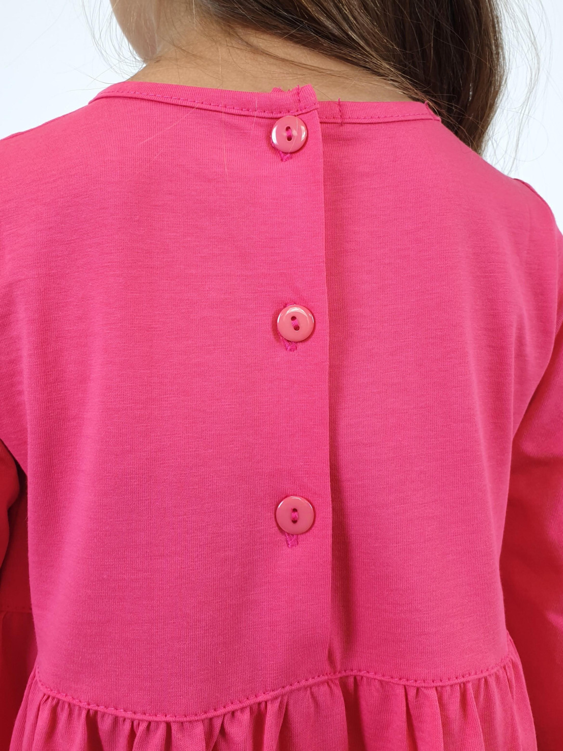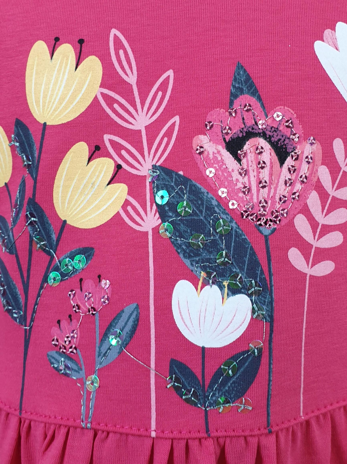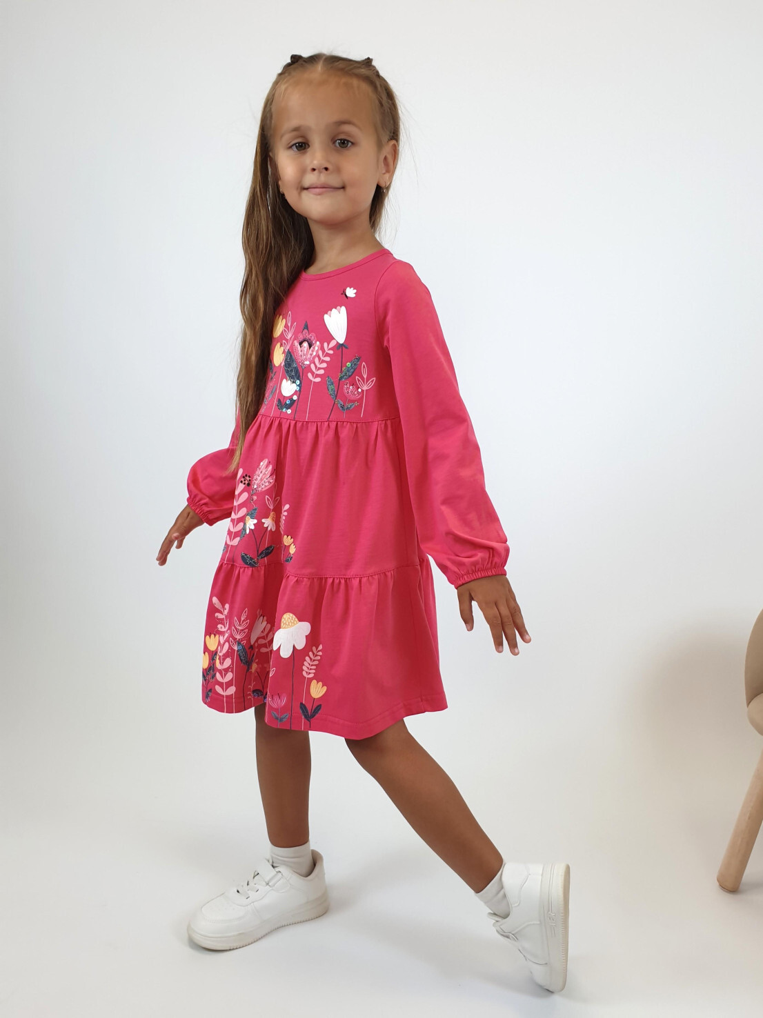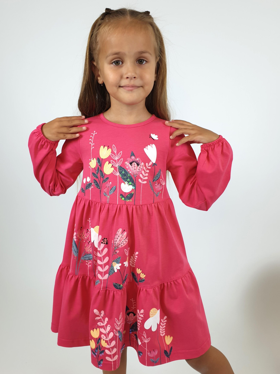 Кулирное полотно:100%х/б. Платье-силуэт трапеция,длинный втачной рукав внизу собран на резинку.Юбка переда и спинки из двух воланов.Горловина окантована,застежка на пуговицы по спинке.Печать и вышивка(пайетки) на переде-кокетки,среднего и нижнего воланов.