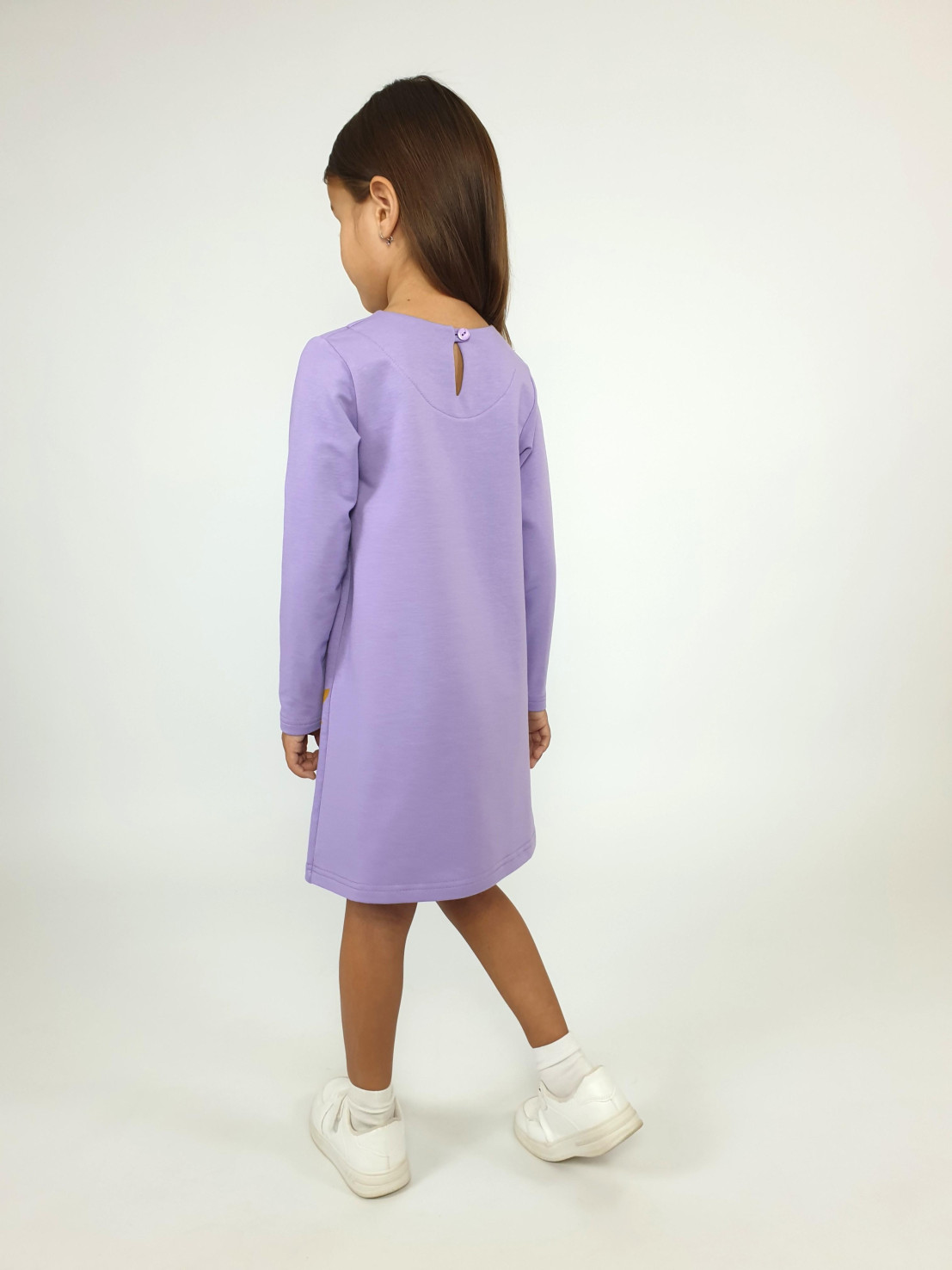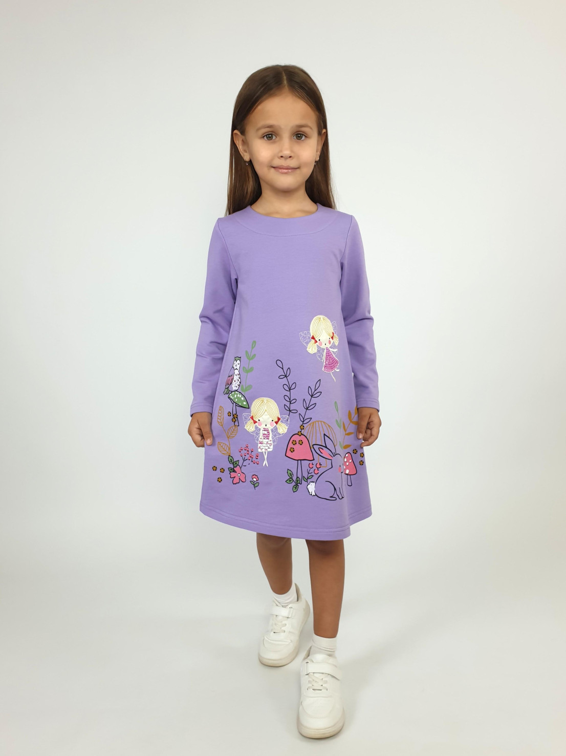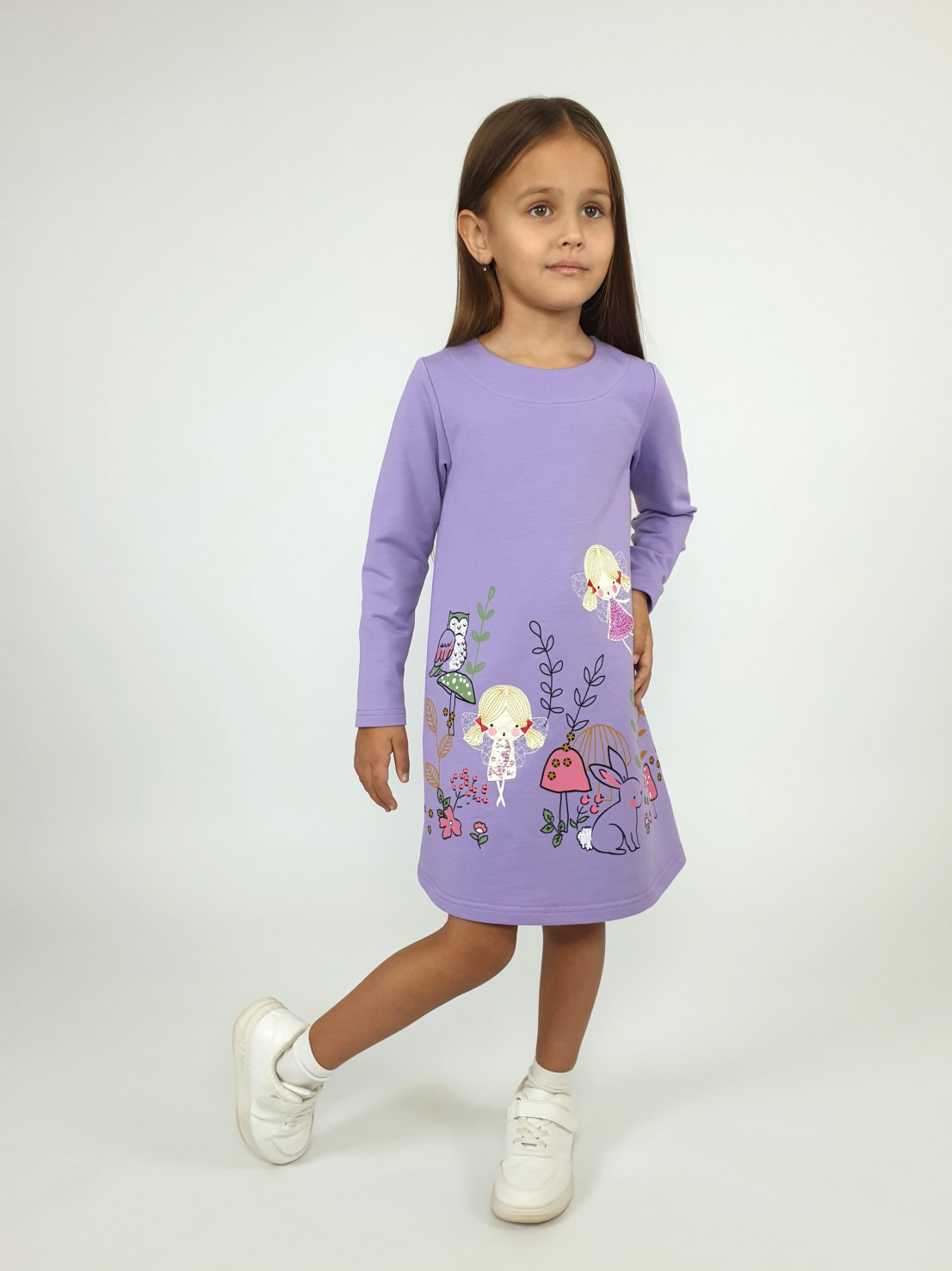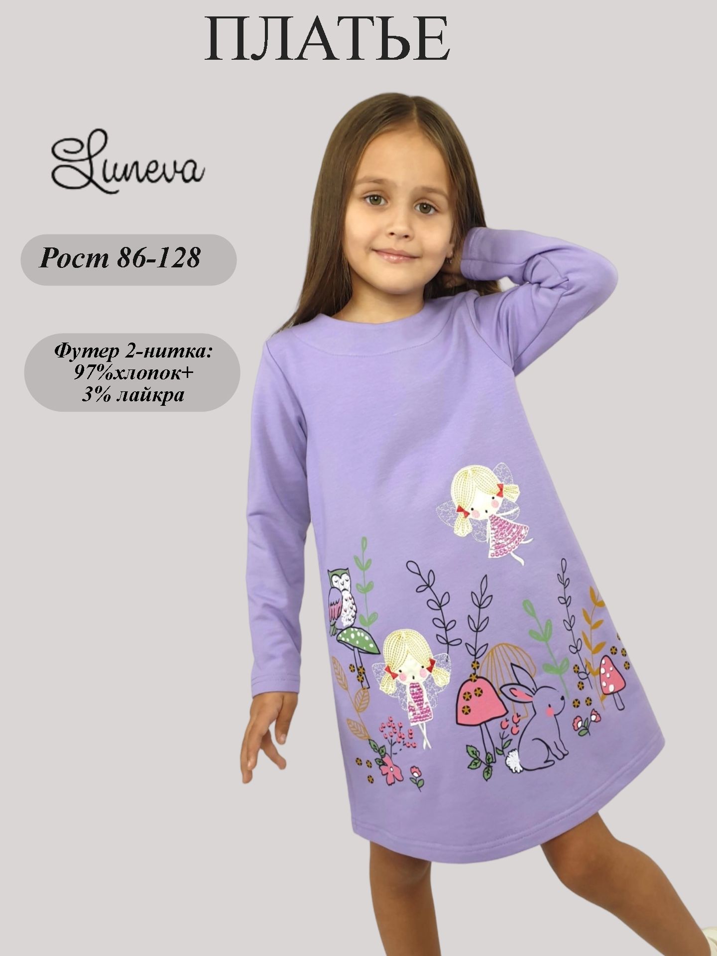 Это стильное и комфортное платье идеально подойдет маленьким принцессам! Светло-фиолетовое изделие из футера 2-х ниточного с добавлением эластана изящно облегает фигуру, а оригинальный дизайн с печатью и пайетками привлекает внимание. Трапециевидный силуэт, длинный рукав и застежка на пуговички обеспечивают удобство и простоту одевания. Платьице от бренда Lunева – ваш лучший выбор для детских праздников и повседневности!
