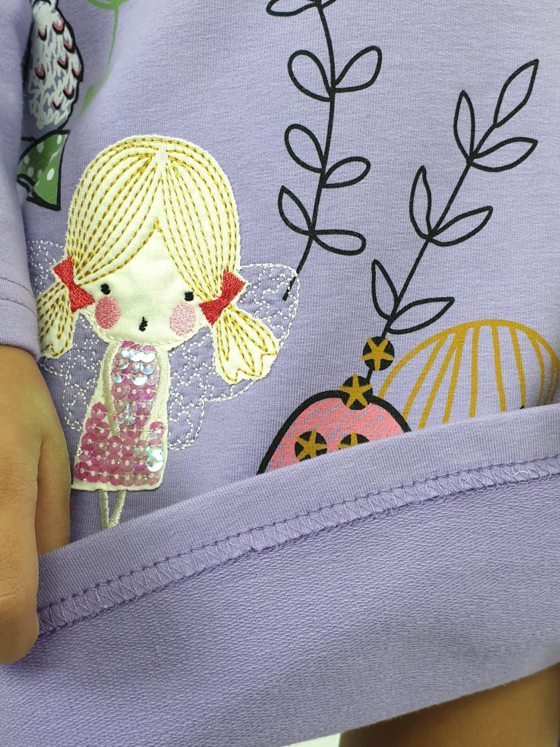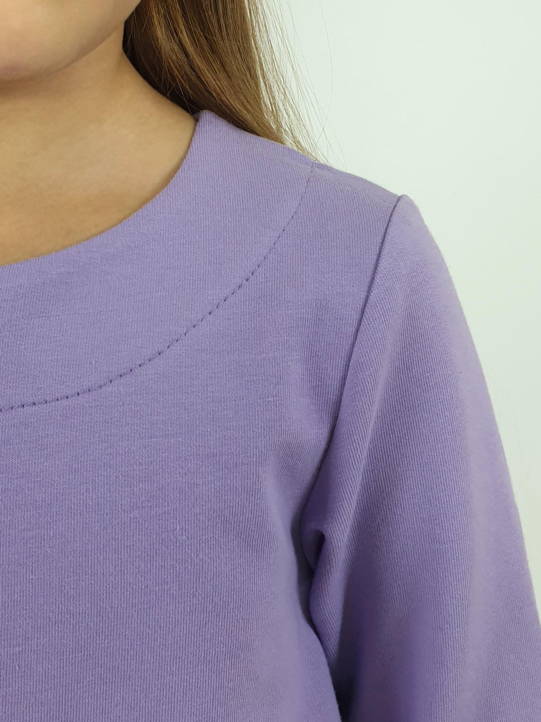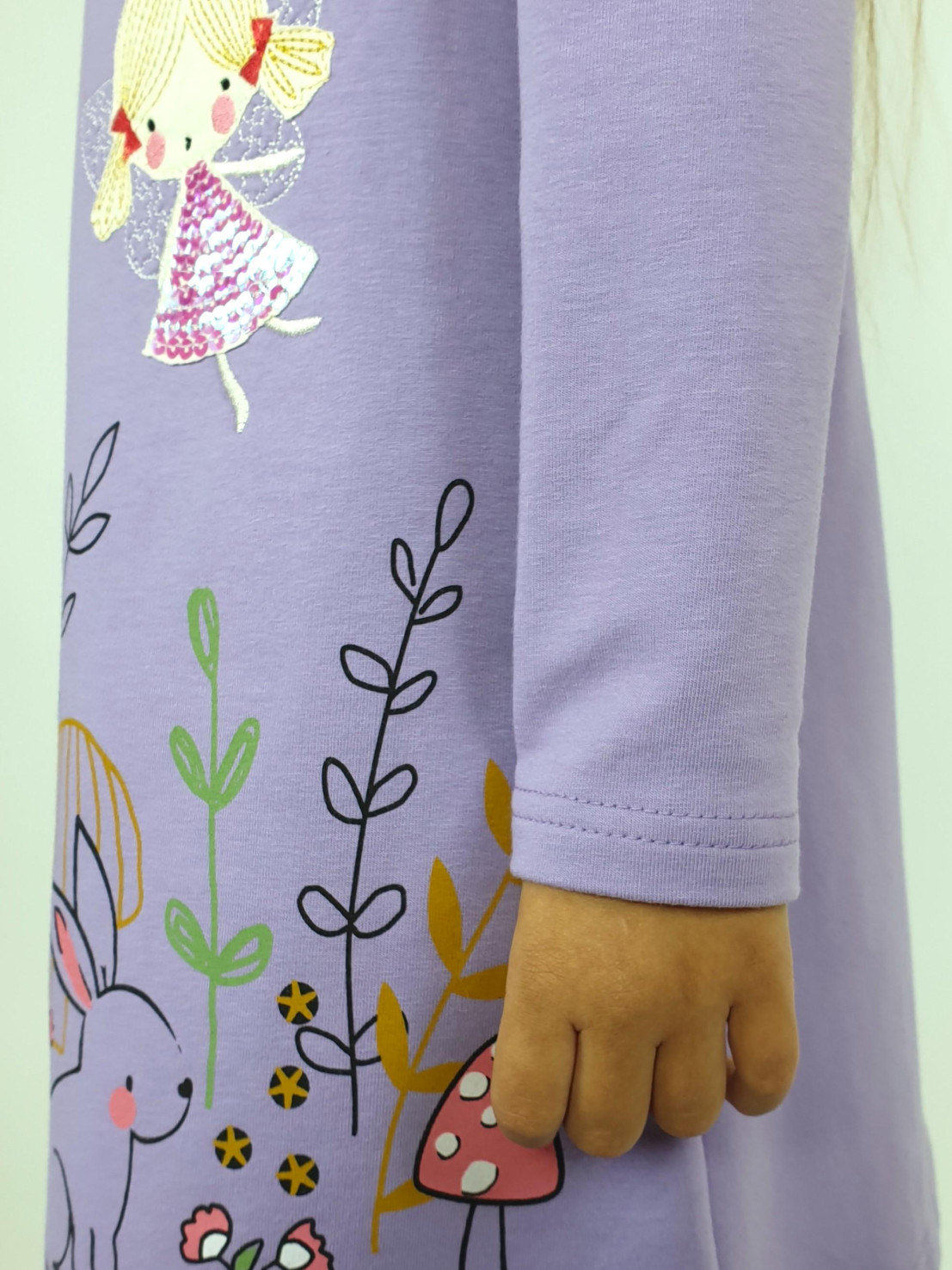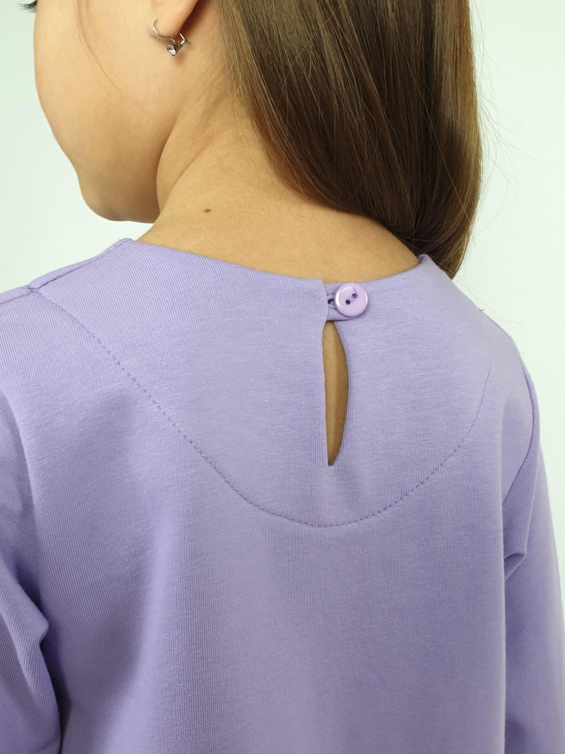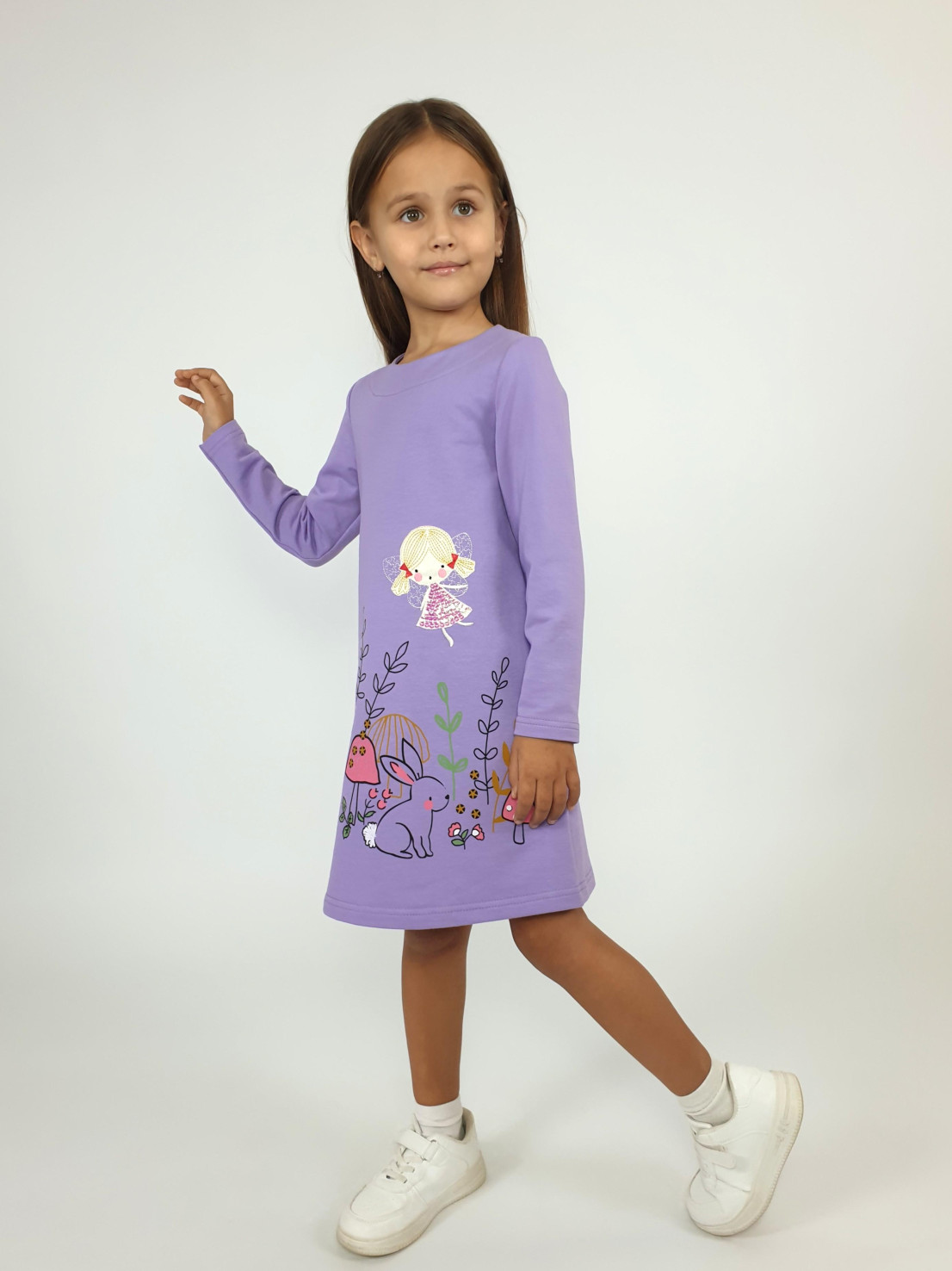 Это стильное и комфортное платье идеально подойдет маленьким принцессам! Светло-фиолетовое изделие из футера 2-х ниточного с добавлением эластана изящно облегает фигуру, а оригинальный дизайн с печатью и пайетками привлекает внимание. Трапециевидный силуэт, длинный рукав и застежка на пуговички обеспечивают удобство и простоту одевания. Платьице от бренда Lunева – ваш лучший выбор для детских праздников и повседневности!