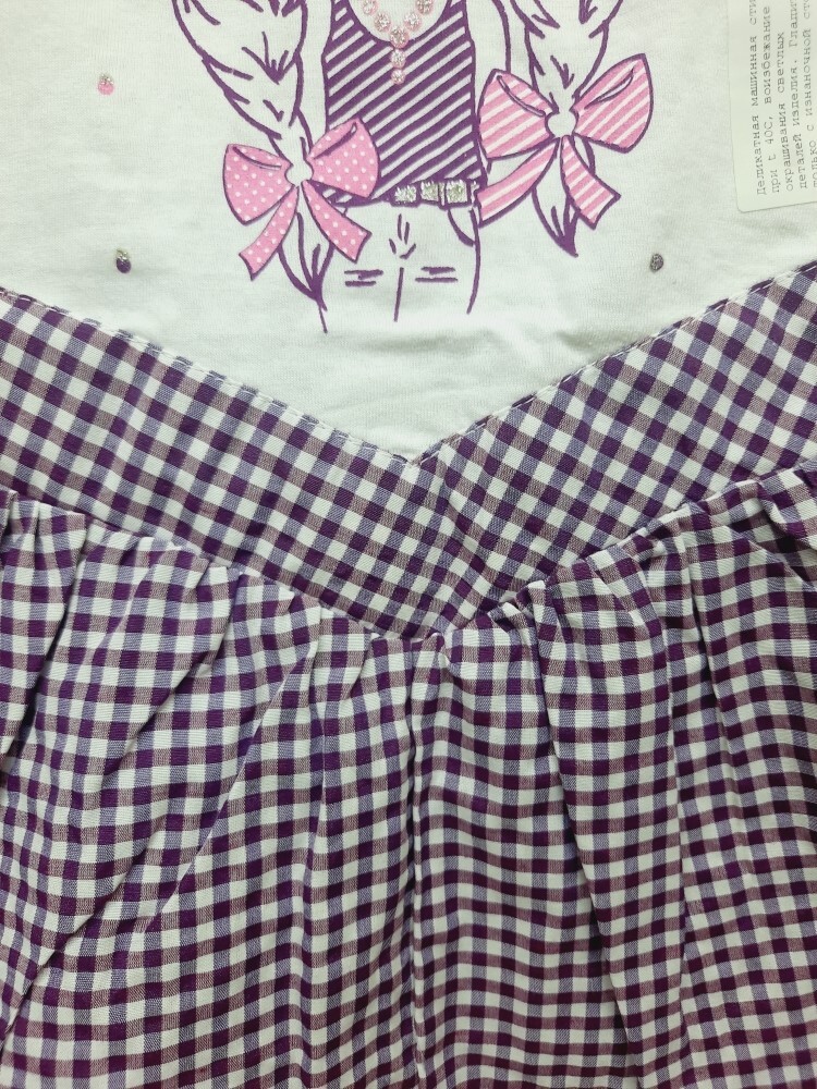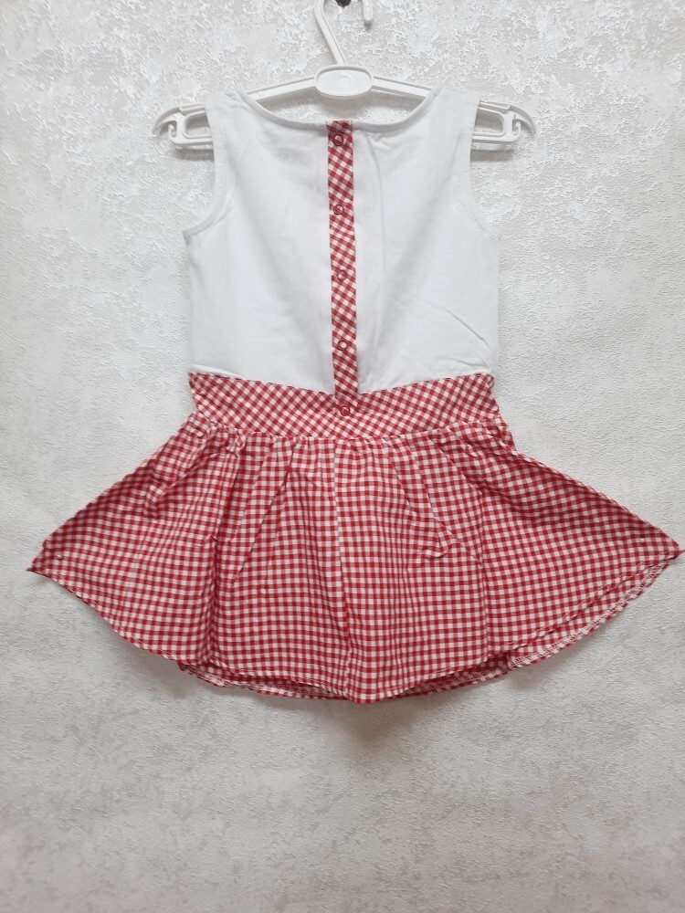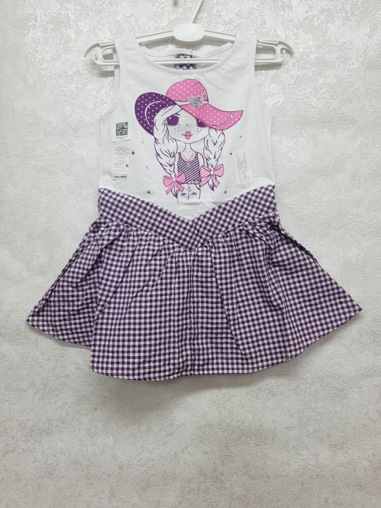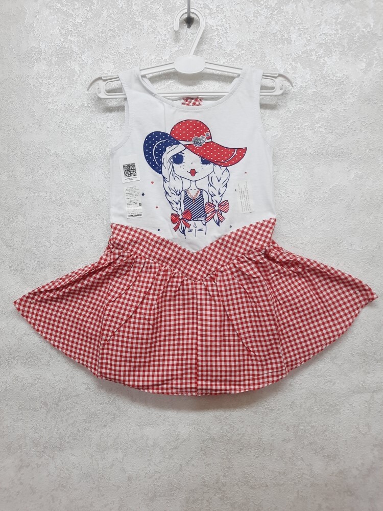 Летнее комбинированное платье-сарафан для девочки без рукавов из кулирного полотна и нежного поплина в клетку, отрезное по линии талии мысиком, украшено красивой печатью-кокетка в шляпке, по линии спинки удобная застежка на кнопки.