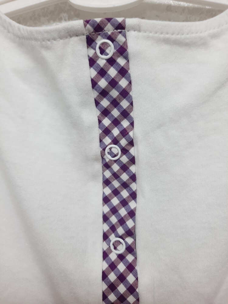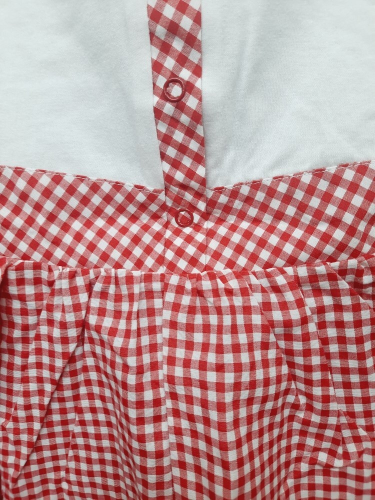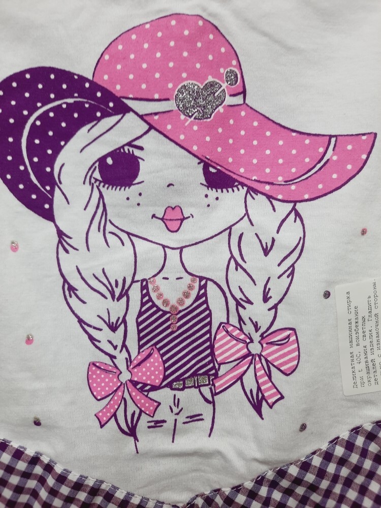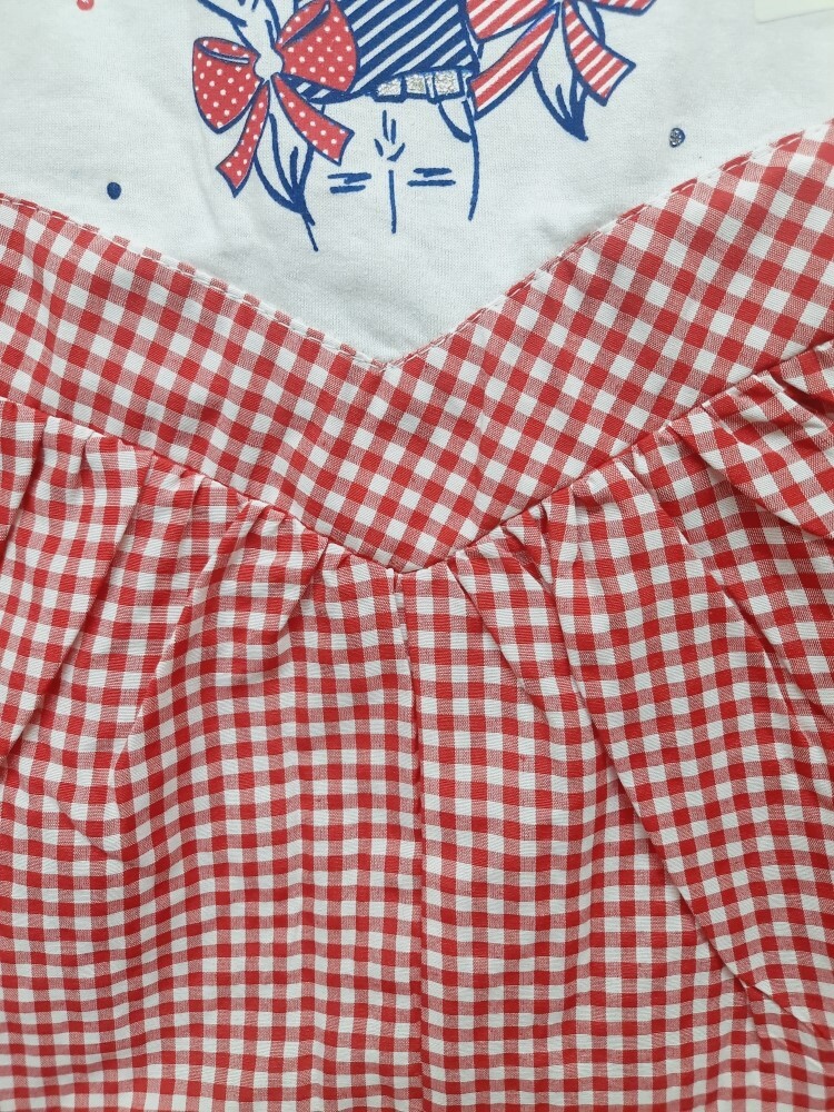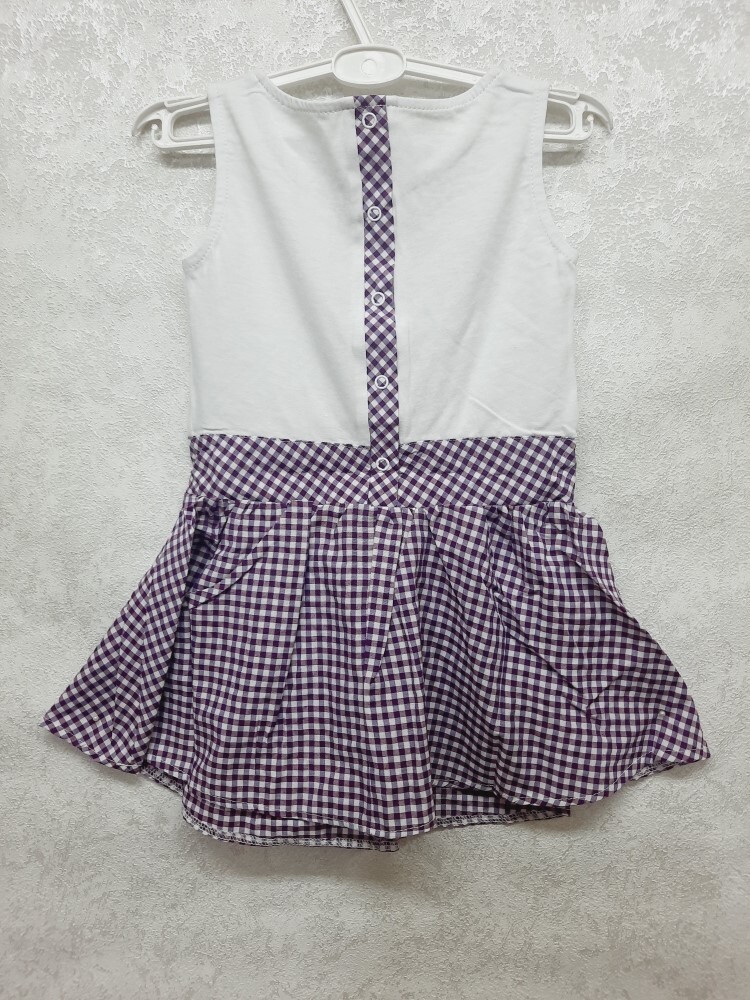 Летнее комбинированное платье-сарафан для девочки без рукавов из кулирного полотна и нежного поплина в клетку, отрезное по линии талии мысиком, украшено красивой печатью-кокетка в шляпке, по линии спинки удобная застежка на кнопки.